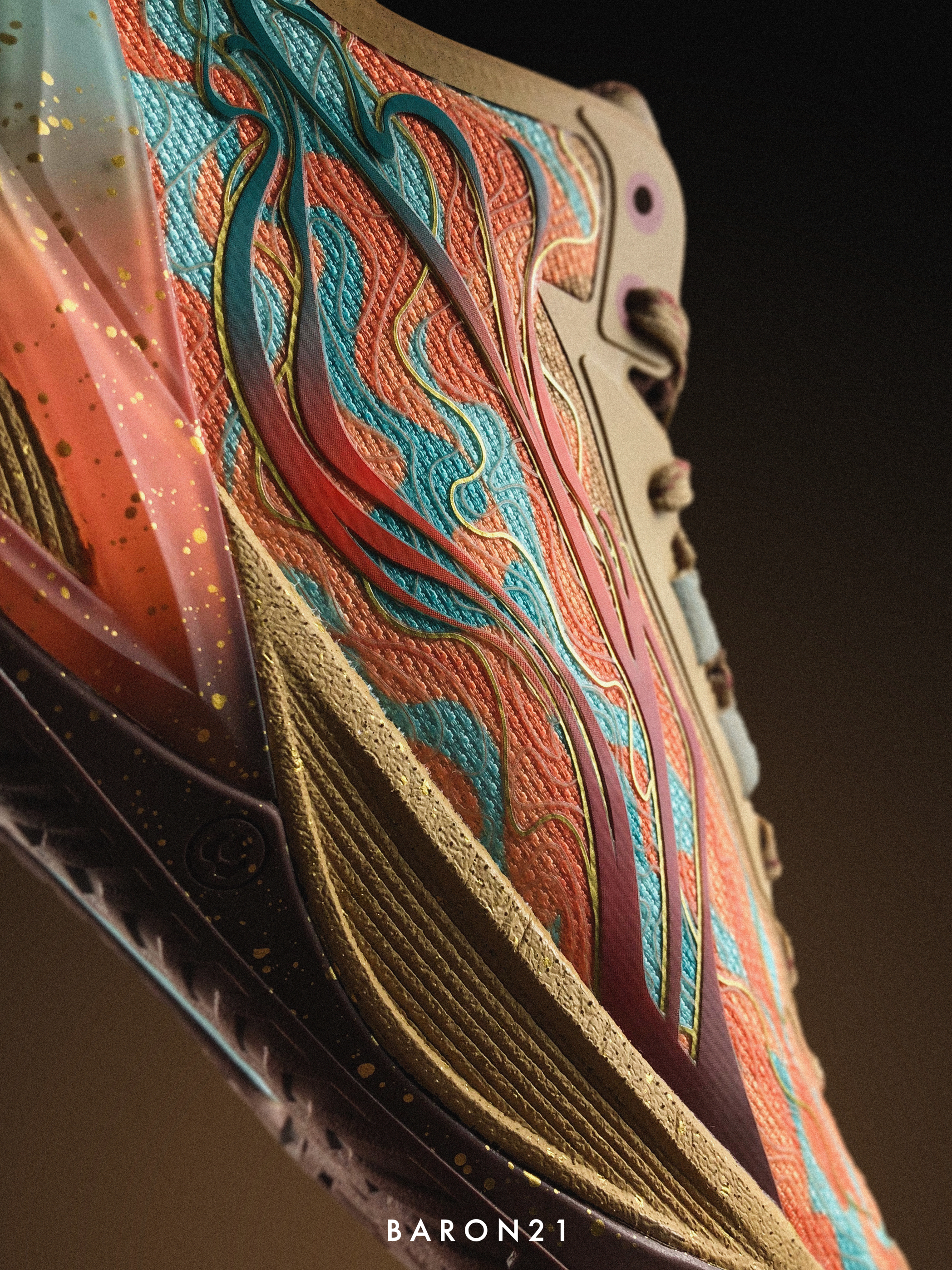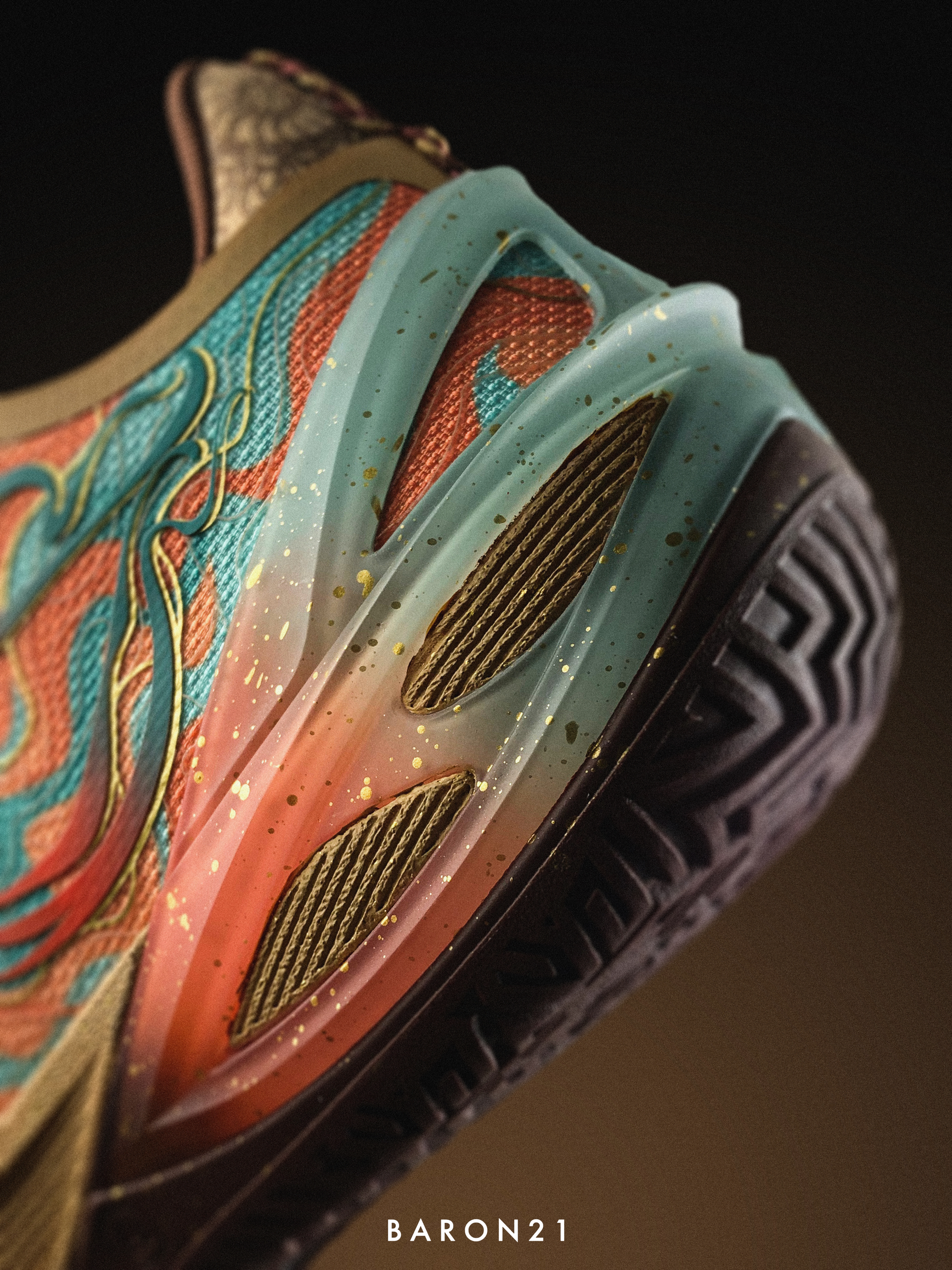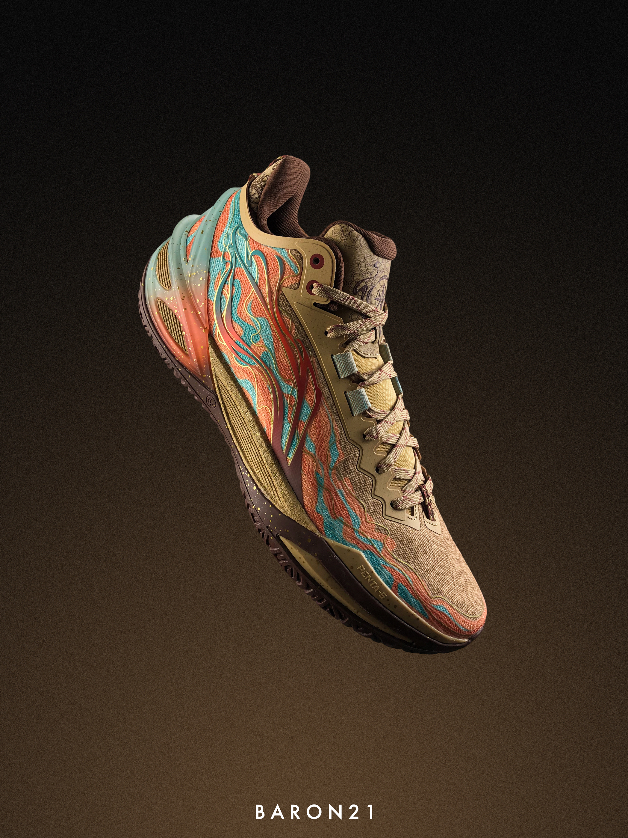 这双利刃6雅丹灵感来源于:丝绸之路上敦煌节点的特殊自然风景。鞋身配色由沙色和棕色组成,还原了古代丝绸之路的韵味。在外侧的李宁LOGO上,设计师加入了敦煌“飞天”壁画的元素,同时结合特殊胶印,质感很独特!而内侧,则印上了中原与西域商贸队伍的图案。鞋面与其他配色也有不同,设计上采用了雅丹地貌的特殊纹理和敦煌壁画的线条风格。TPU也通过消光工艺和特殊贴膜还原飞沙走石。这些元素融合在利刃6雅丹的身上,不仅...