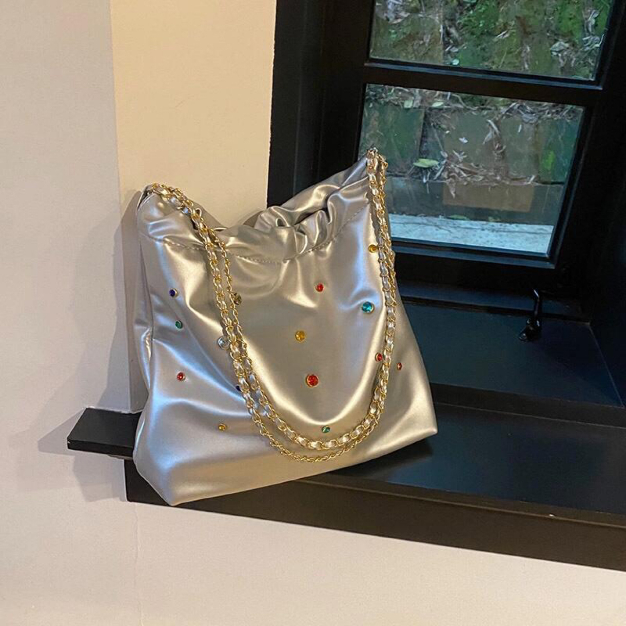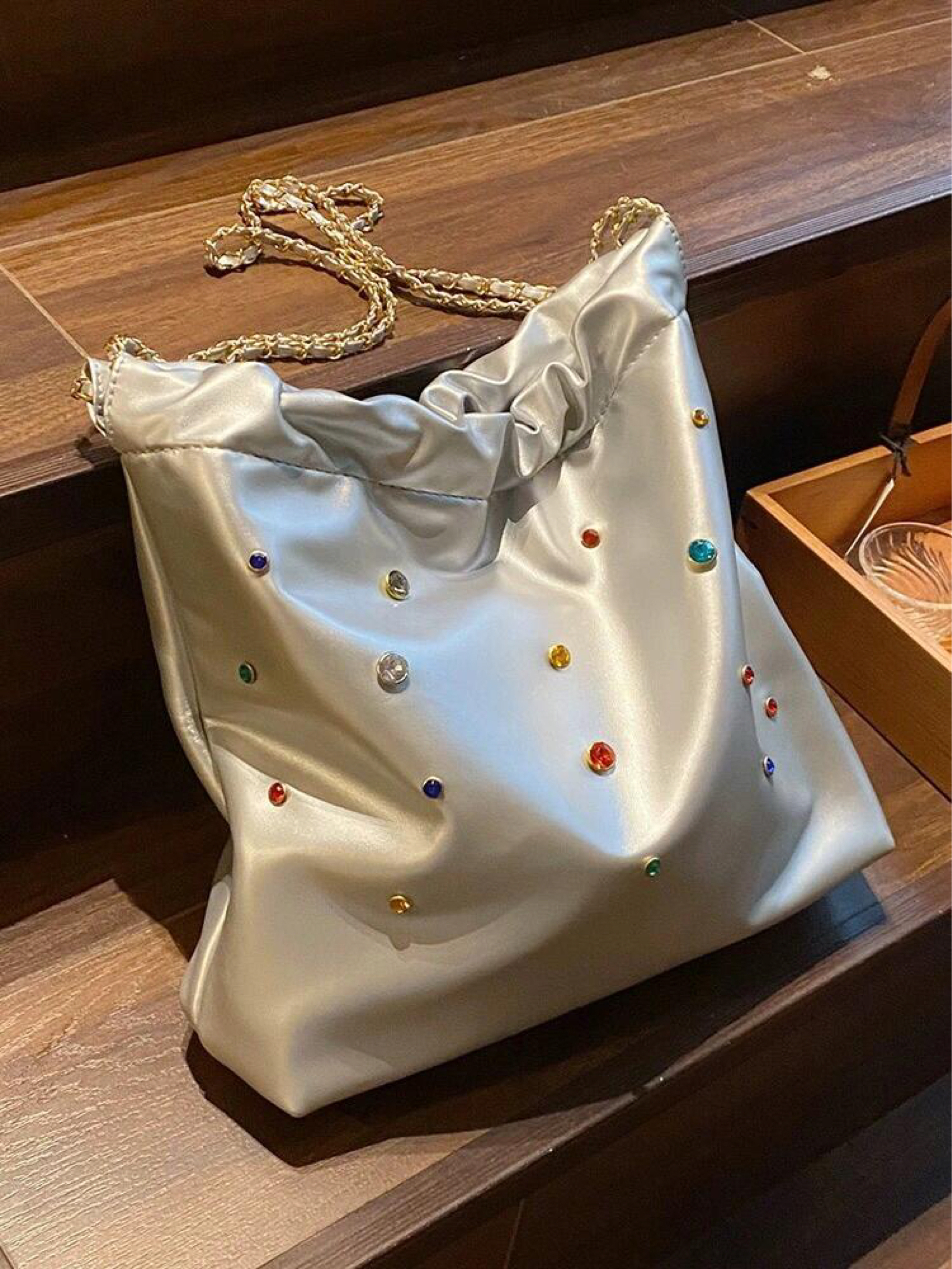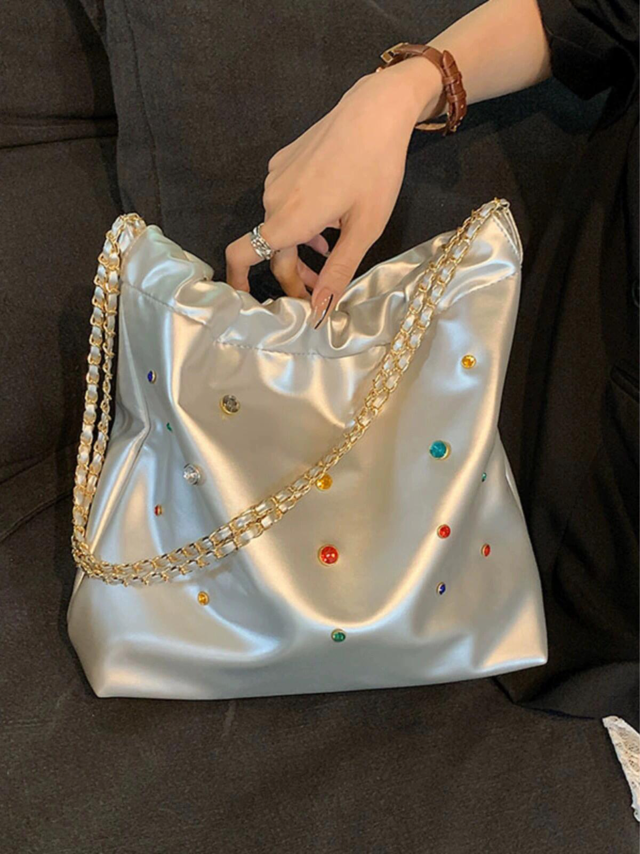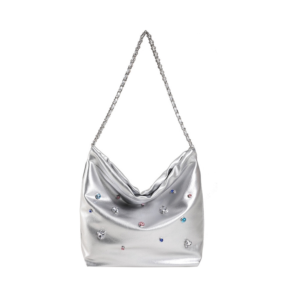 本篇笔记关联了NOMK 夏季小众设计感镶钻皮质链条包托特包Tote包购物袋水桶包 银色等商品,为用户提供真实的使用体验和购买参考。