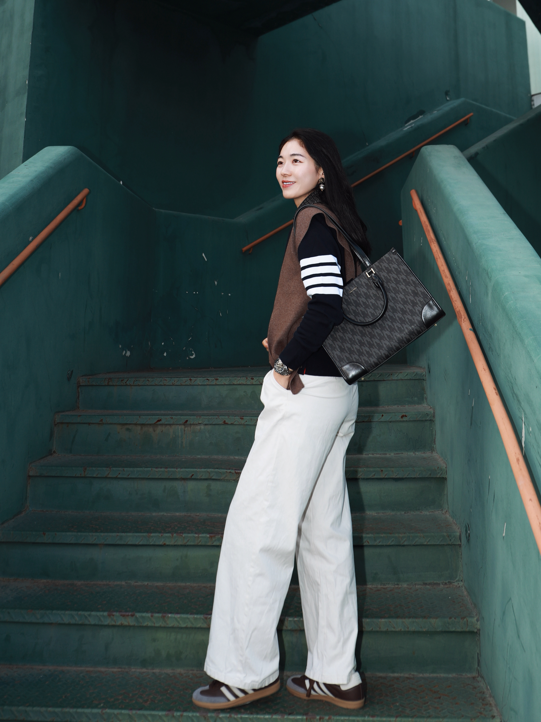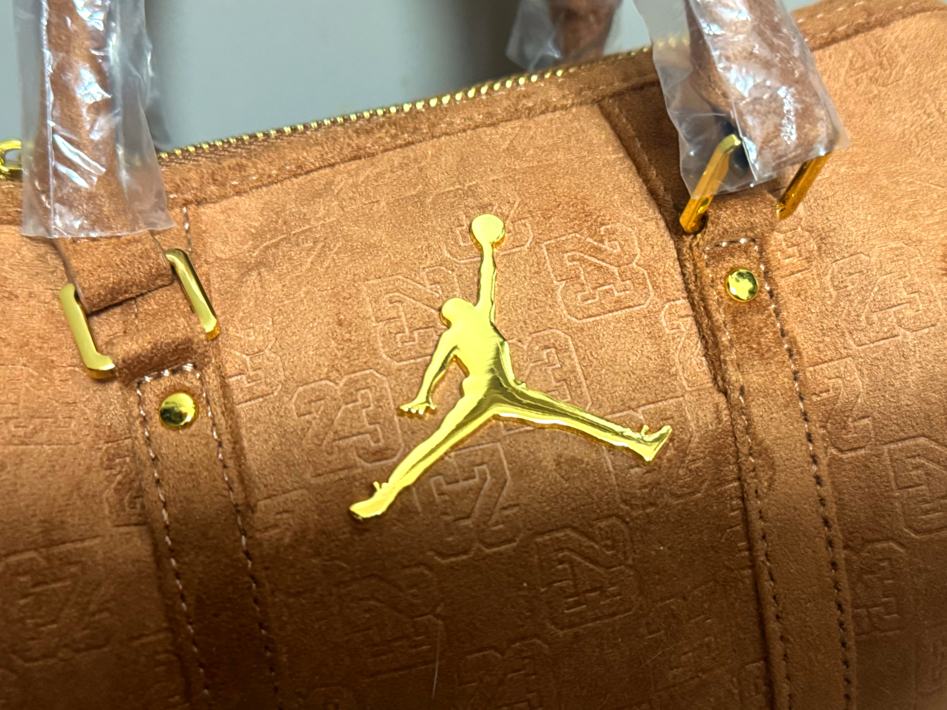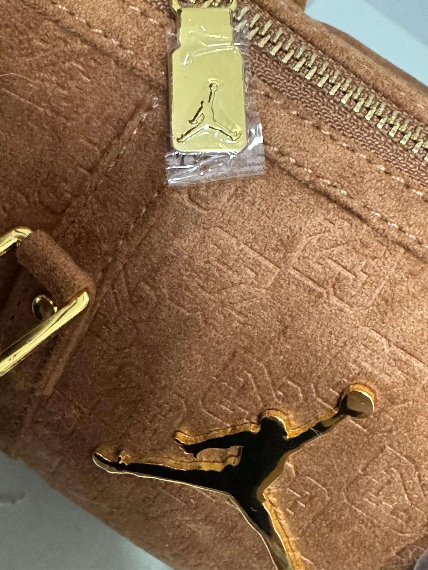 我收到Jordan这款焦糖色包时,摸着麂皮面料好软乎~压纹和金色飞人logo细节好精致,手柄还裹着保护膜很贴心✨ 日常背或短途出门都适配,就是容量不算大,装太多会有点鼓,喜欢简约风的可以试试~
