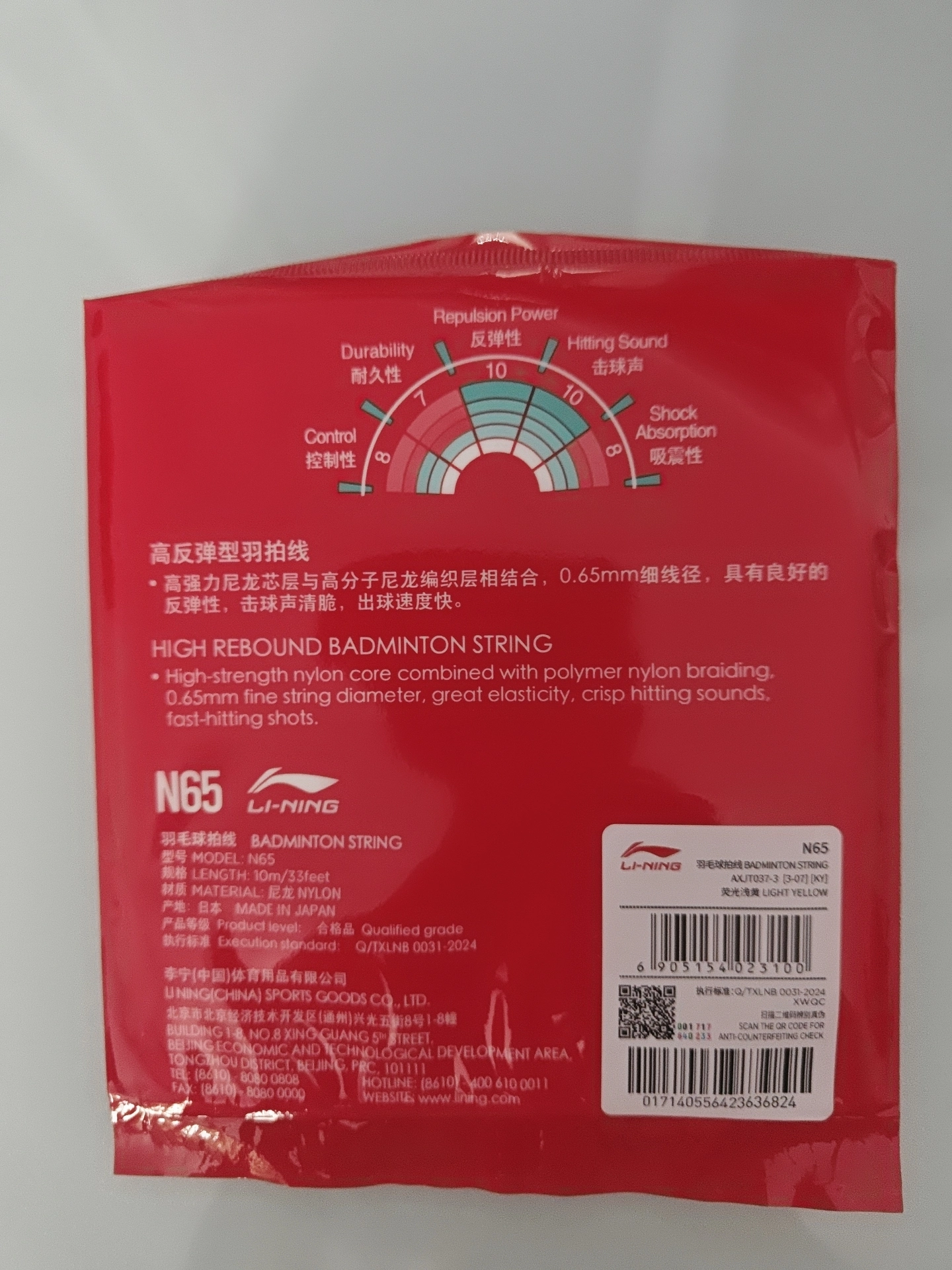 本篇笔记关联了Li Ning/李宁 N65 高反弹型 耐打耐用 控制型 声音清脆 进攻型 尼龙纤维 羽毛球拍线 AXJR014 荧光浅黄等商品,为用户提供真实的使用体验和购买参考。
