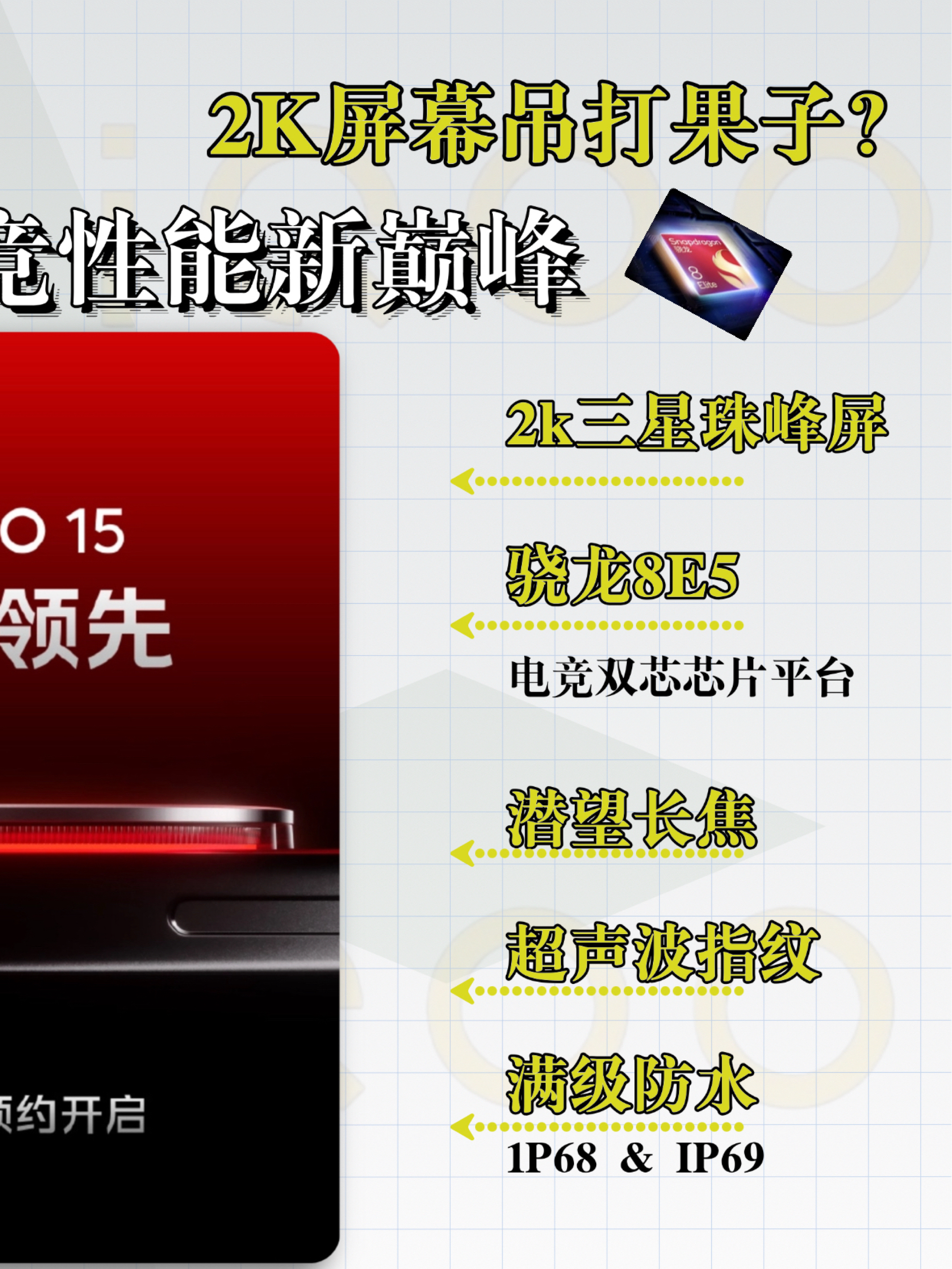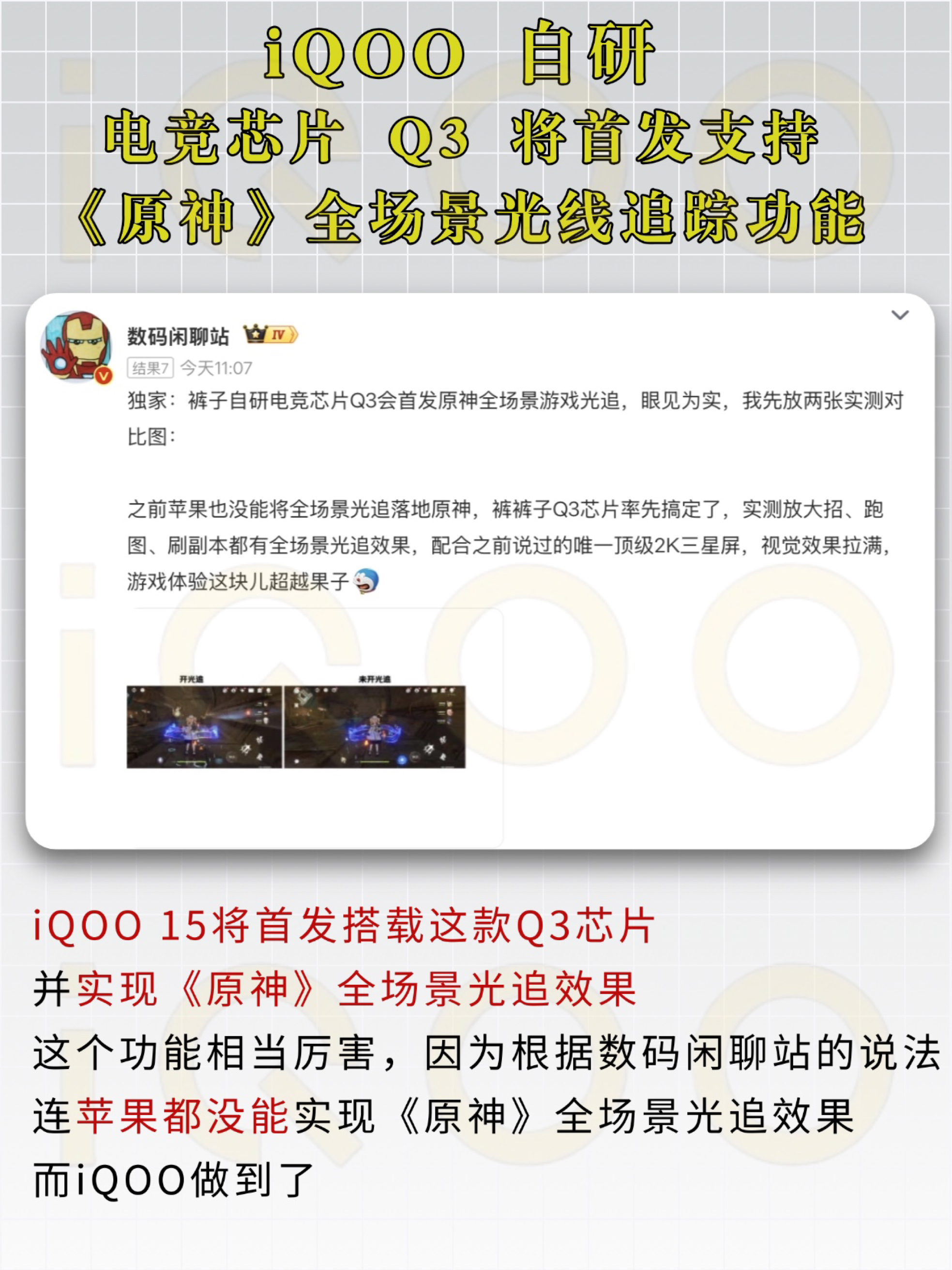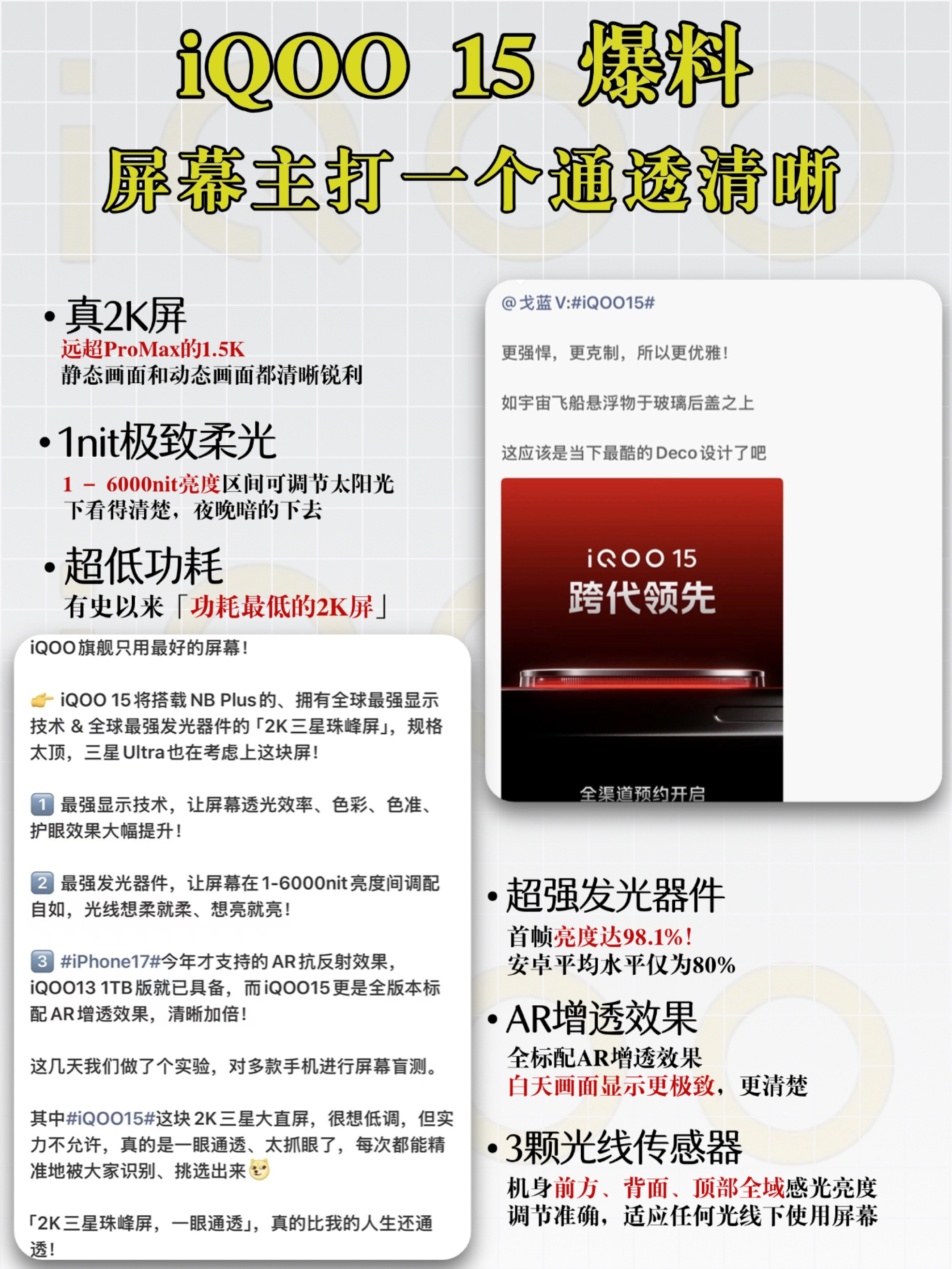 iQOO 15这次东西很多啊,屏幕官宣用了2K三星屏,今天官宣的Q3芯片甚至把原神的光追功能都整上了…… 目前看官方的爆料,iQOO 15屏幕素质对标的是果子 果子的屏幕除了护眼,其他素质基本都是TOP 但iQOO 15这块屏,护眼也不错 那是不是说…… 今年的屏幕素质裤裤子有机会争个第一? iQOO 15的这块三星屏 一是分辨率高,2K 其次是首帧亮度占比高,画面拖影更少 再就是功耗低,甚至比1...