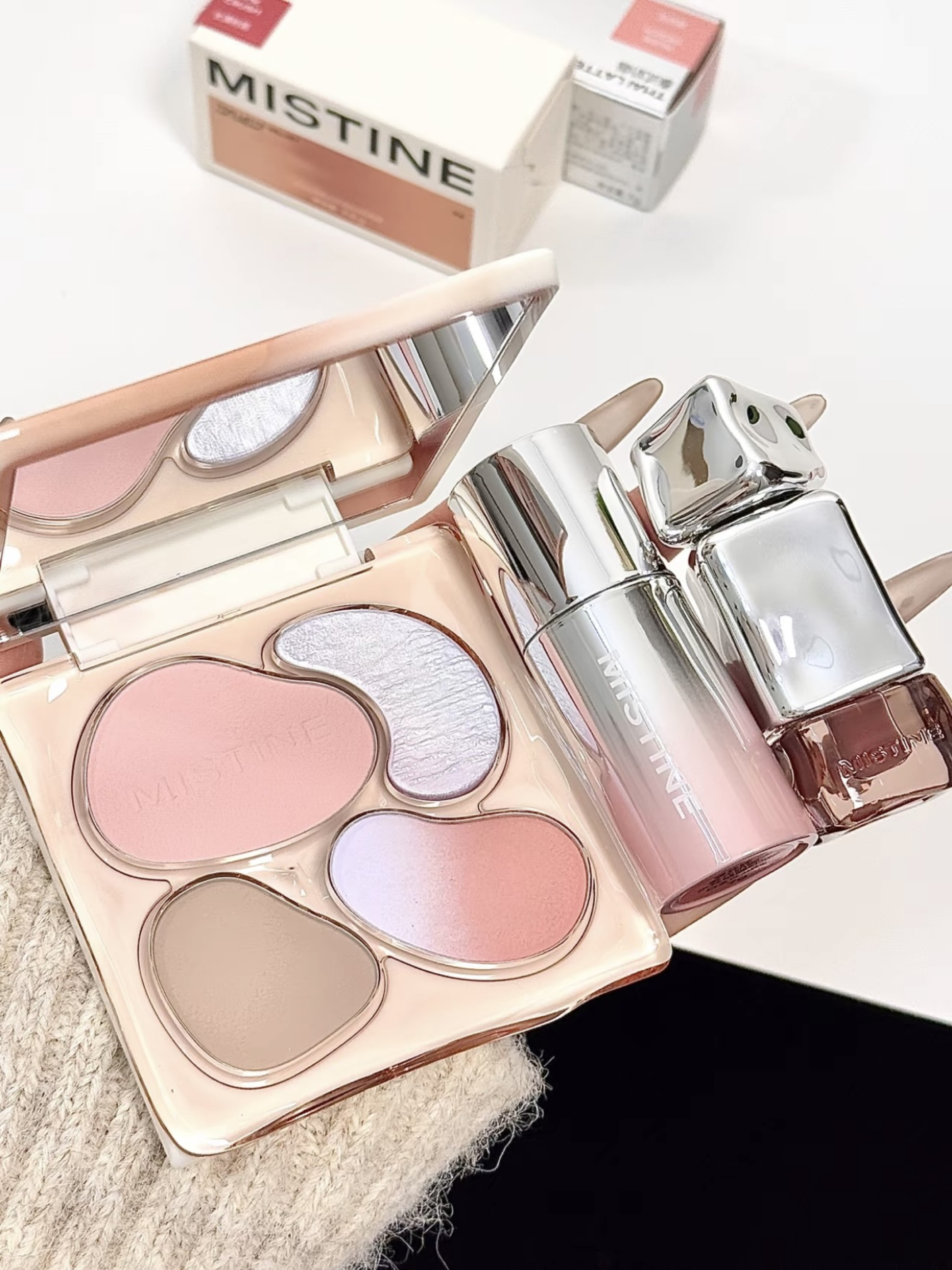最近一直在用的早八搭子就是它啦 mistine的介个三件套 面部综合盘+唇釉+腮红液 有一说一 面部综合盘的配色尊嘟还蛮特别的诶 粉质细腻 上脸显色度也OK 唇釉的色号是V02长滩粉雾 膏体丝滑 上嘴不显唇纹 腮红液还配有毛绒绒的刷头 用它点涂在两颊 有种妈生好气色的感觉 蜜丝婷你是懂女孩子的!