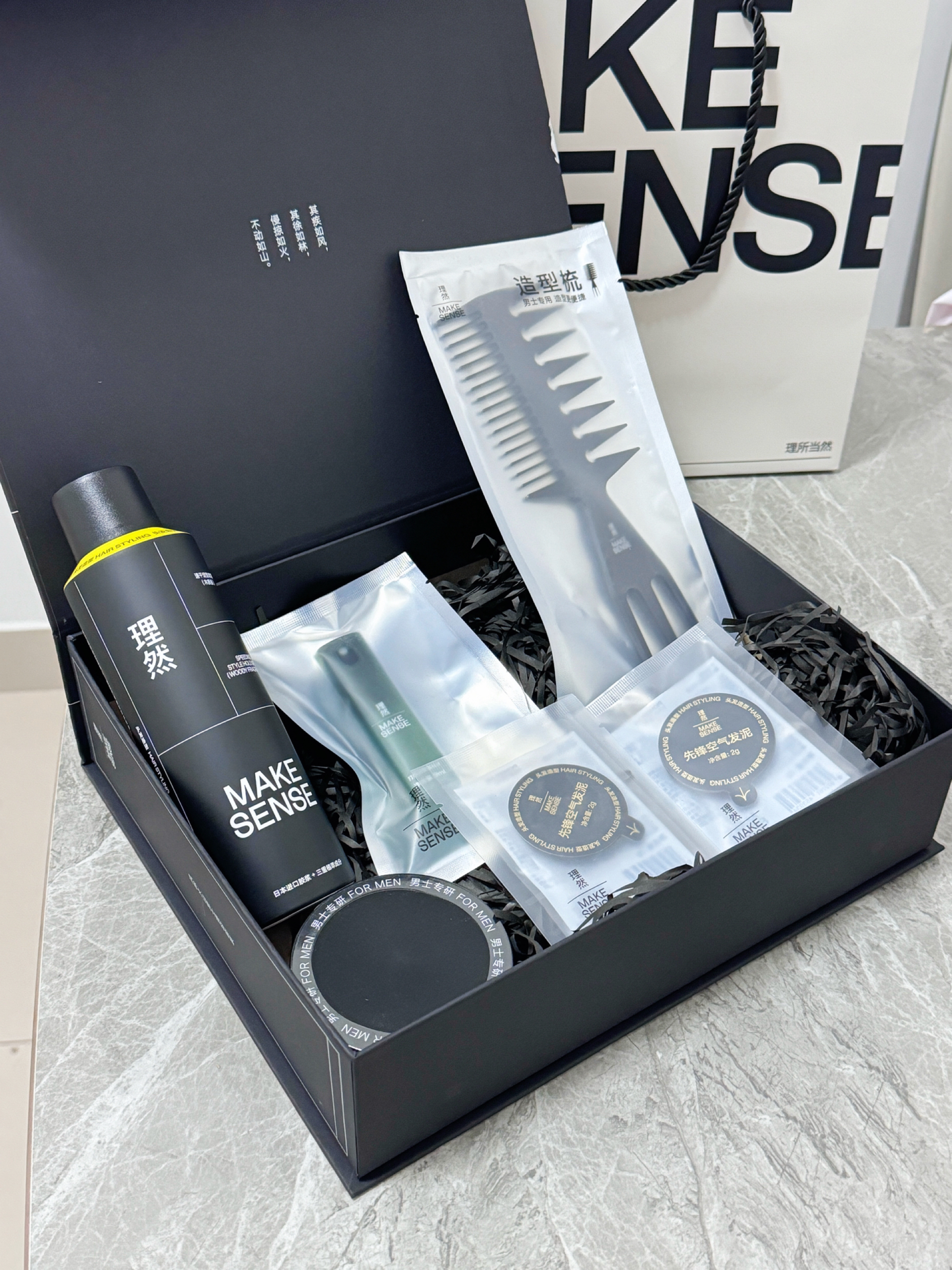 到底谁还不用定型喷雾呀! 介个 #理然 风林火山六件套尊嘟好实用 打开满满一大盒 有速干定型喷雾、塑型发泥、蓬松水 空气发泥、男士造型梳、礼盒礼袋 都蛮实用的 男生也要好好打理发型呀 定型喷雾挺细腻的 是木质香 不会刺鼻 用它来抓发型持久度还挺久的 出去玩一天发型也不会塌 国庆节马上到了 适合给男朋友安排介个哦