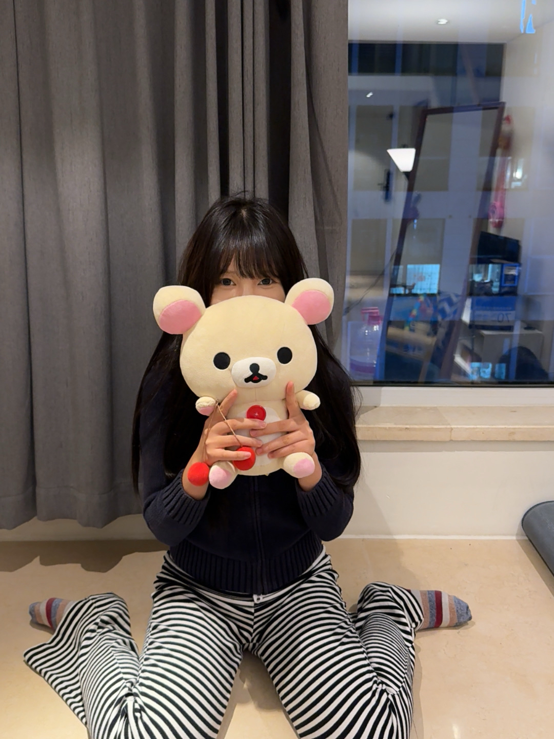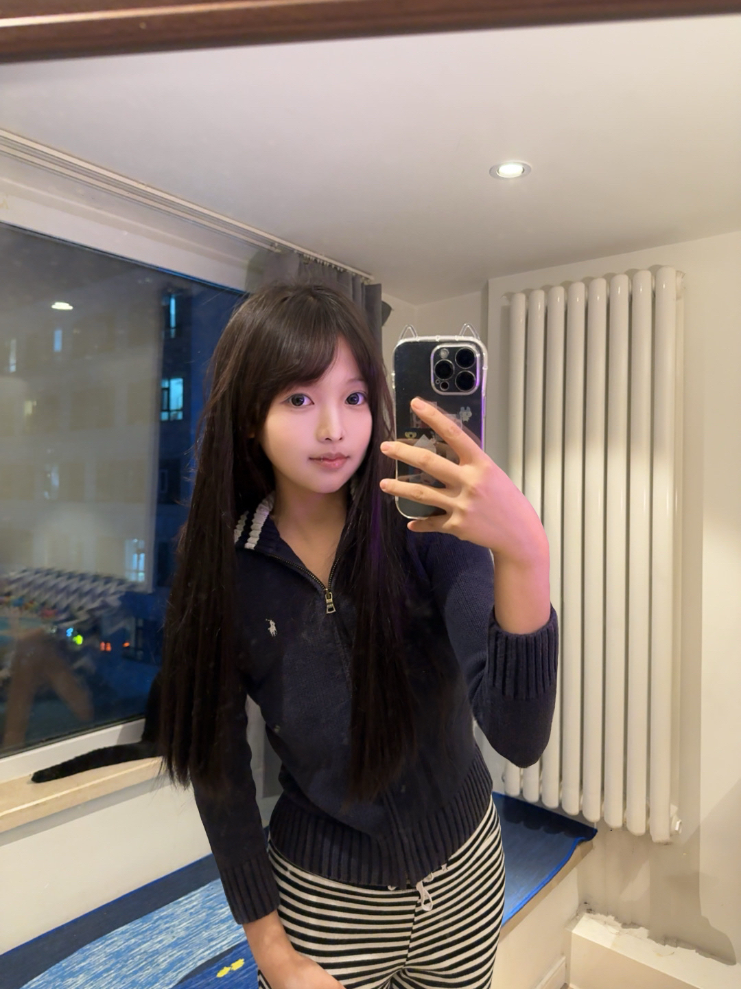 藏青色巨显白!巨显白! 这件开衫我穿的s码,很显身材、但是一点都不会勒手臂,很舒服~ 条纹裤子是非常趣味的搭配,基本没有搭不了的上衣♪(´ε` ) ps.私心好喜欢这只熊妹呀 粉色耳朵太乖了(´・_・`)