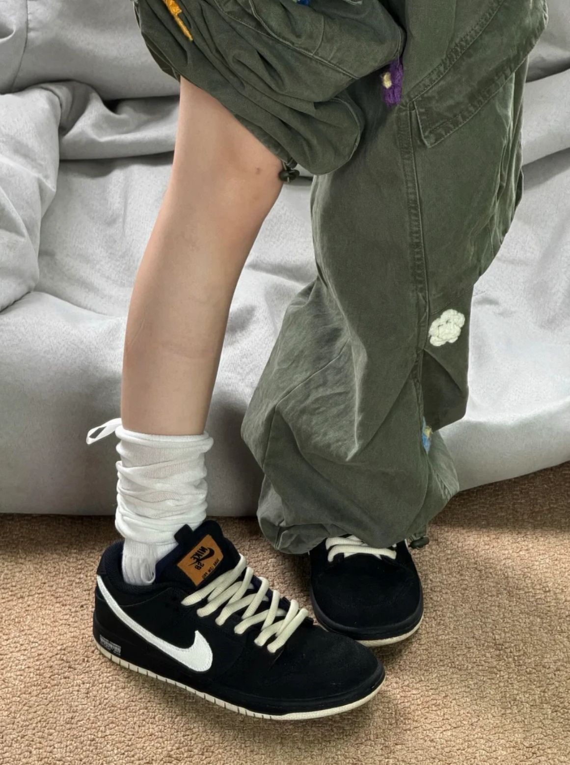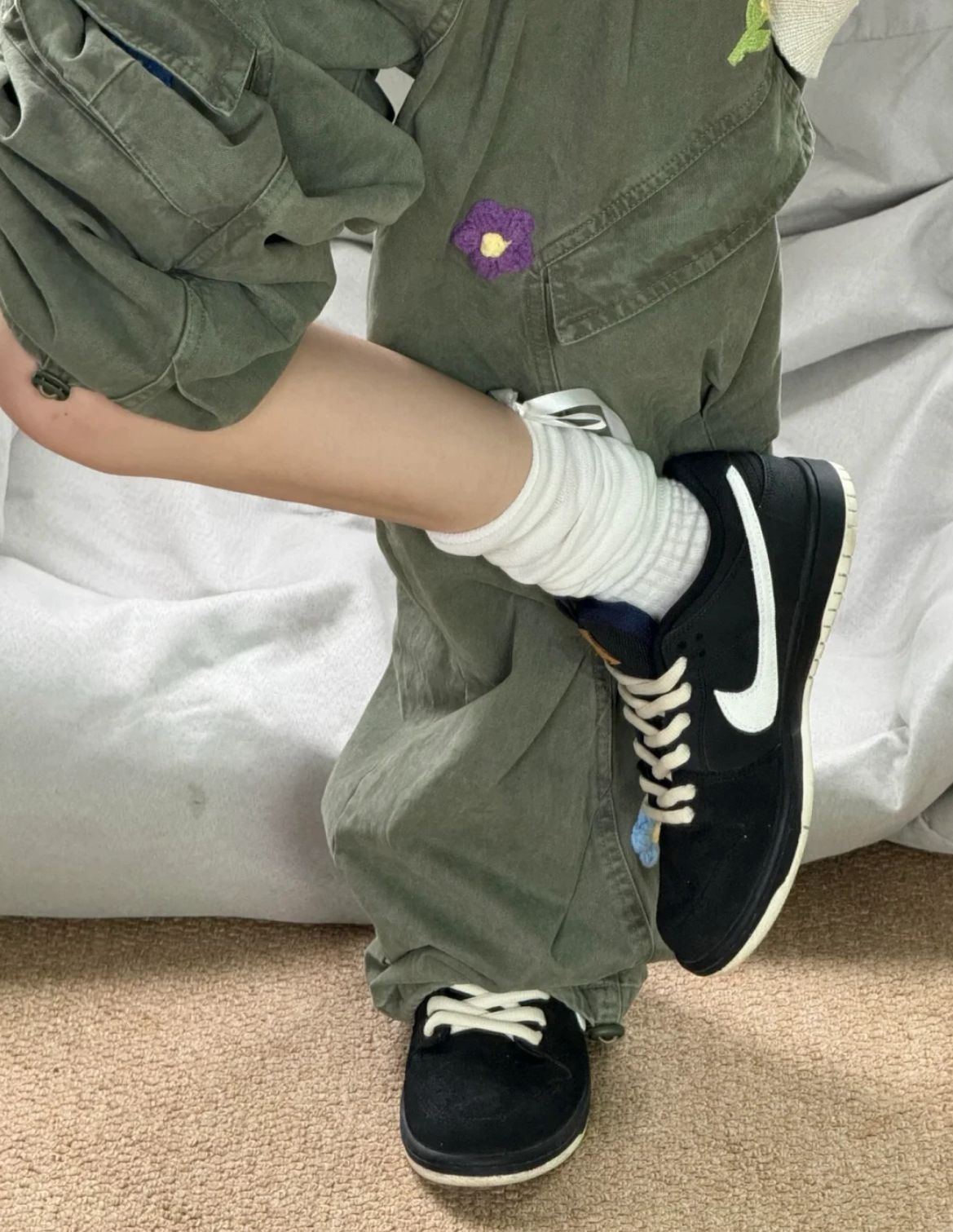 这双鞋是用粗鞋带 就显得很可爱 很萌呀 帆布拼接设计 有一定厚度 很适合秋冬 低饱和淡白色搭配很有质感的黑色 碰撞出不一样的火花✨ 有显得不那么沉闷反而有点可爱 上脚也很舒适 很适合喜欢白色但又不想张扬的女生 这双有挺低调的值得入手