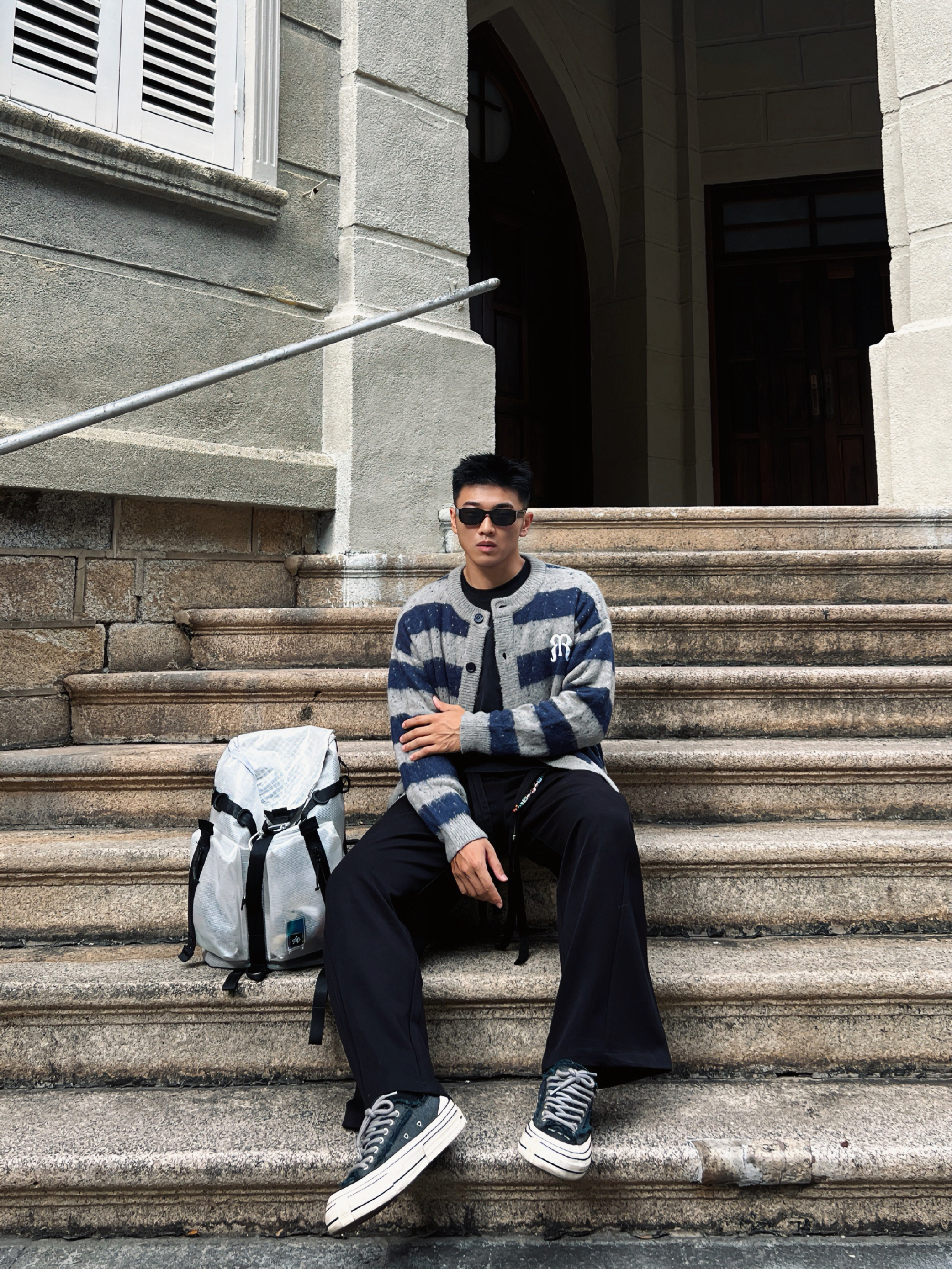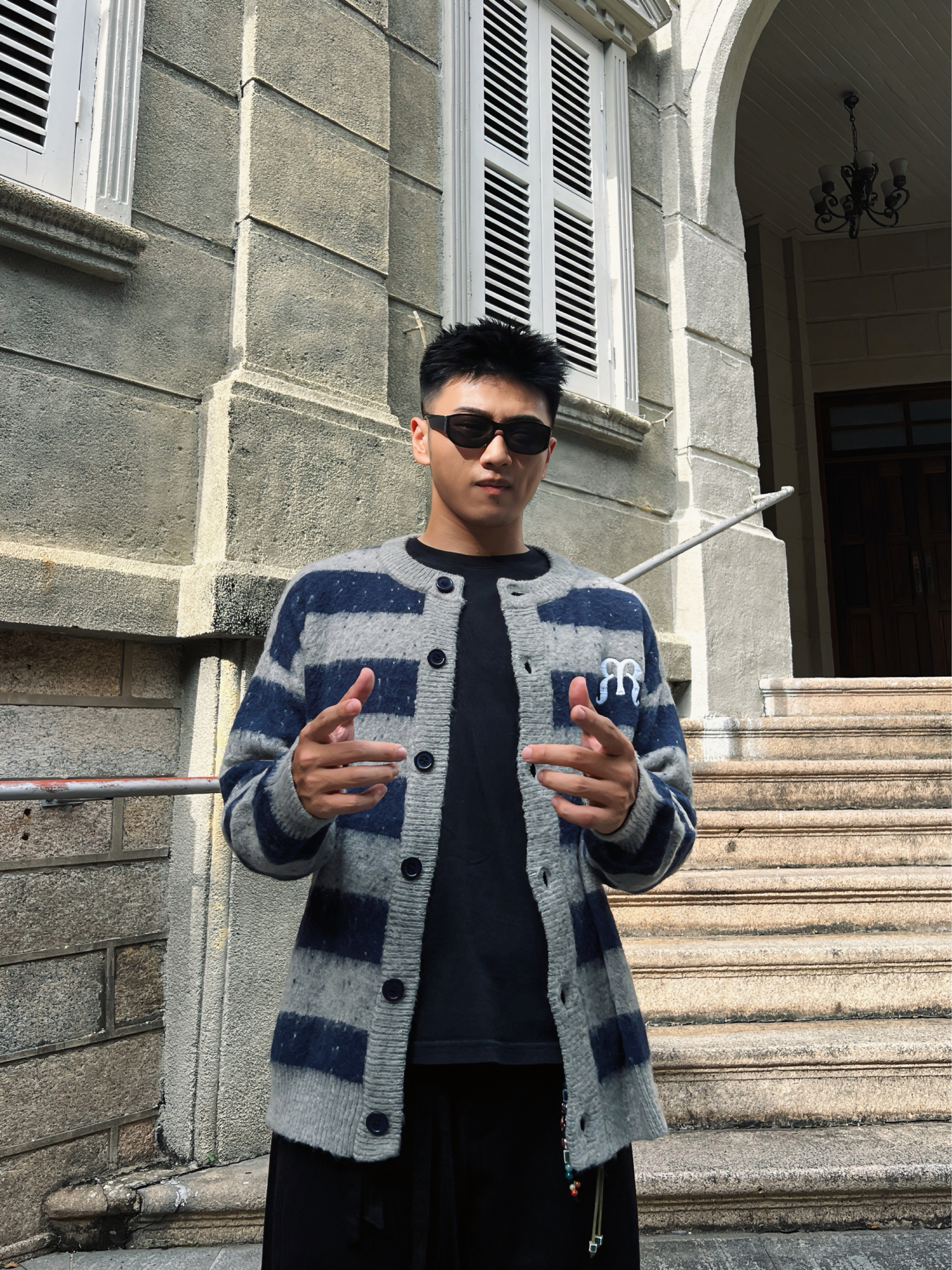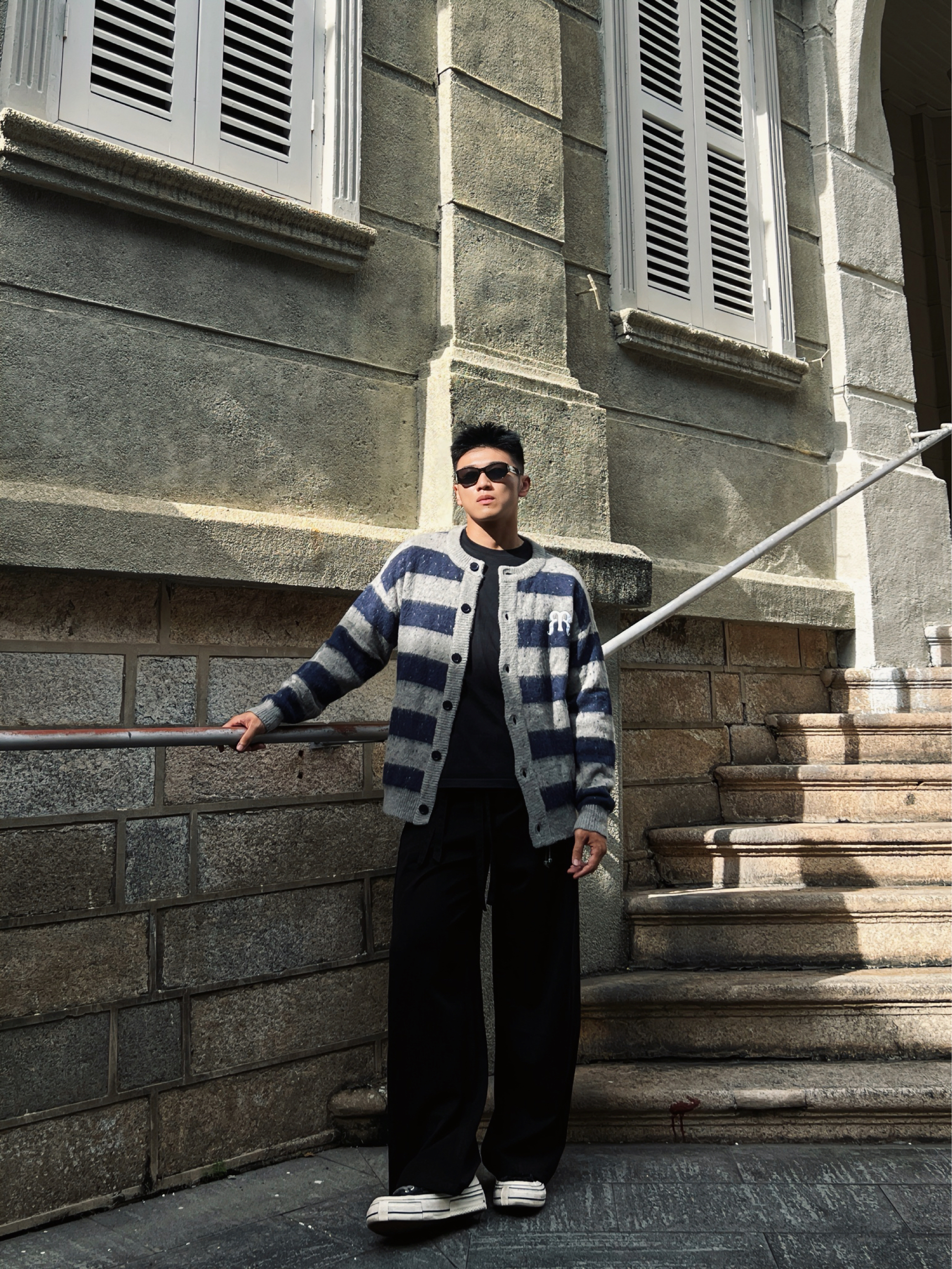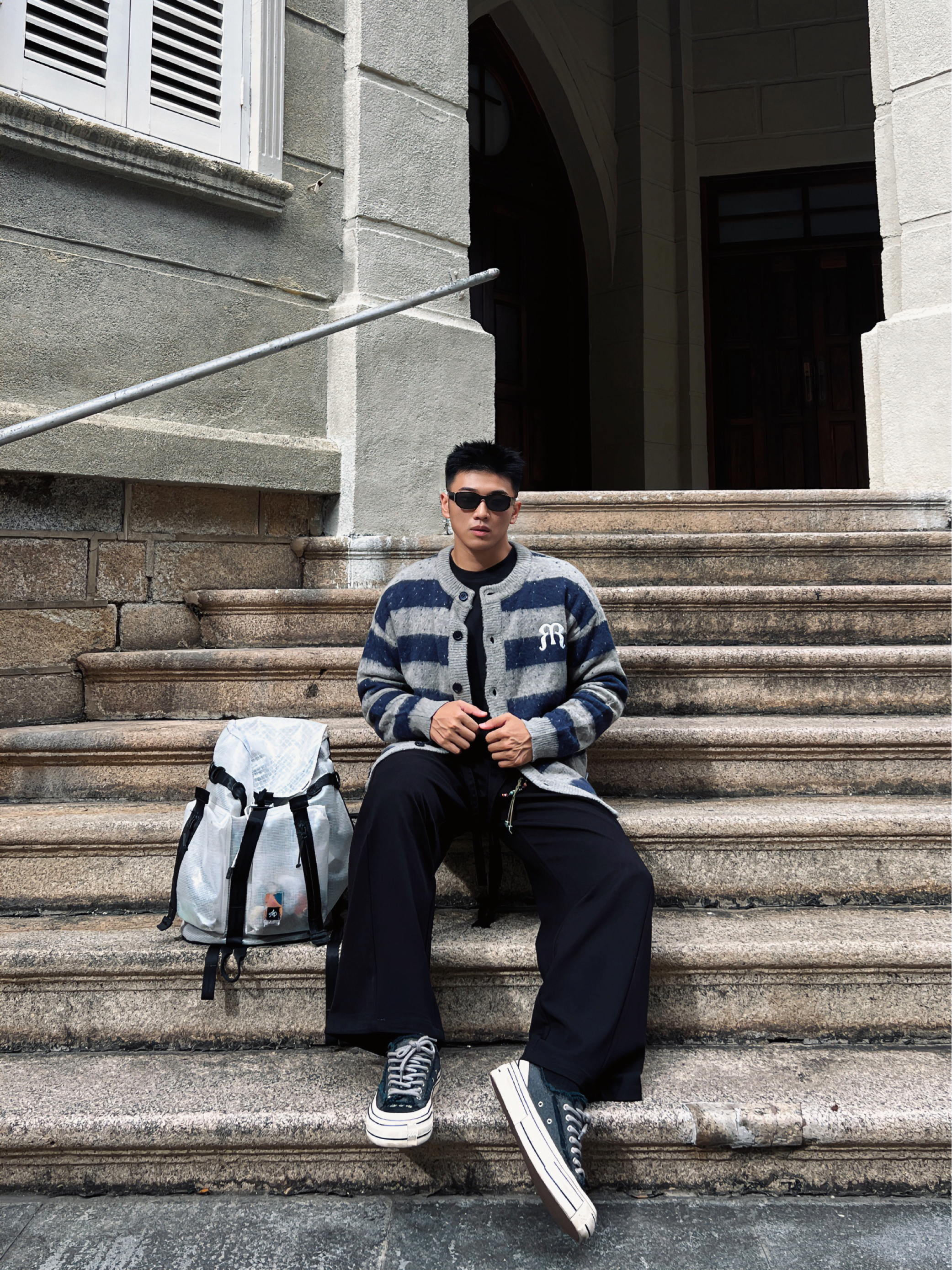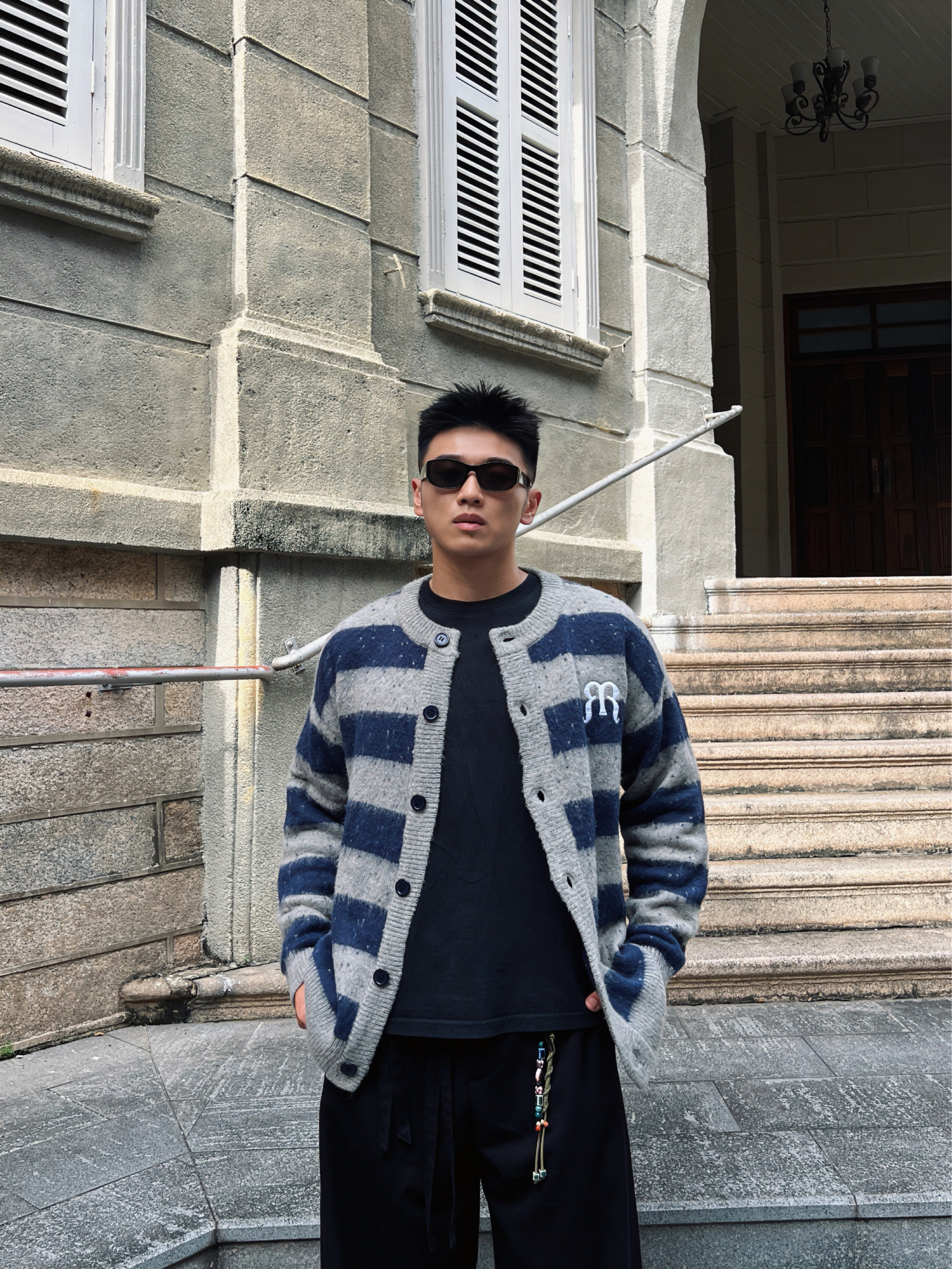 被得物博主狠狠拿捏了! 当下超火的“松弛感”穿搭 在他身上体现得淋漓尽致。 这件蓝灰条纹开衫 自带复古腔调 经典的格纹元素永不过时 胸口标志性的小标又为整体造型注入潮流因子 内搭基础黑T,简约又百搭 下身搭配垂坠感拉满的黑色阔腿长裤 走路间尽显随性洒脱 脚上踩一双简约板鞋 增加随性感 再戴上墨镜 挎个简约背包 妥妥的时髦精出街 松弛又有型,谁能不爱!