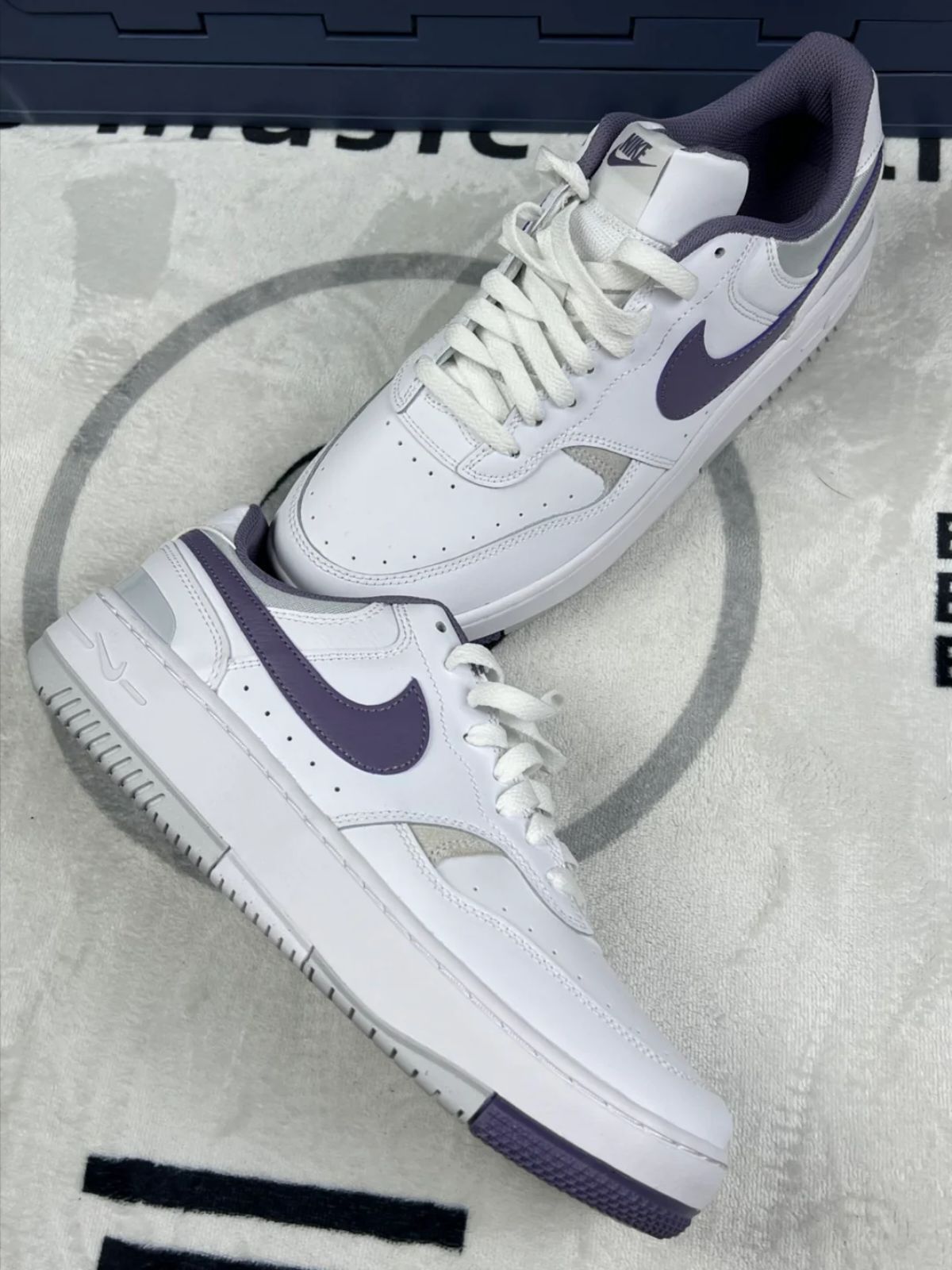 入手这双白紫配色的Nike鞋有段时间了,先说穿着感受,它的皮质鞋面还算柔软,日常走路时脚感不算特别惊艳,但也不硌脚😌。搭配衣服倒是挺省心,白紫的组合很清新,不管是牛仔裤还是连衣裙都能搭。 不过缺点也得说说,鞋底不算特别软,长时间走路的话,脚底板会有点累😔。而且白色鞋面特别容易脏,尤其是那个浅紫色的细节部分,稍微蹭一下就很明显,得经常打理。另外,鞋码感觉有点偏紧,脚宽的朋友可能得选大半码。