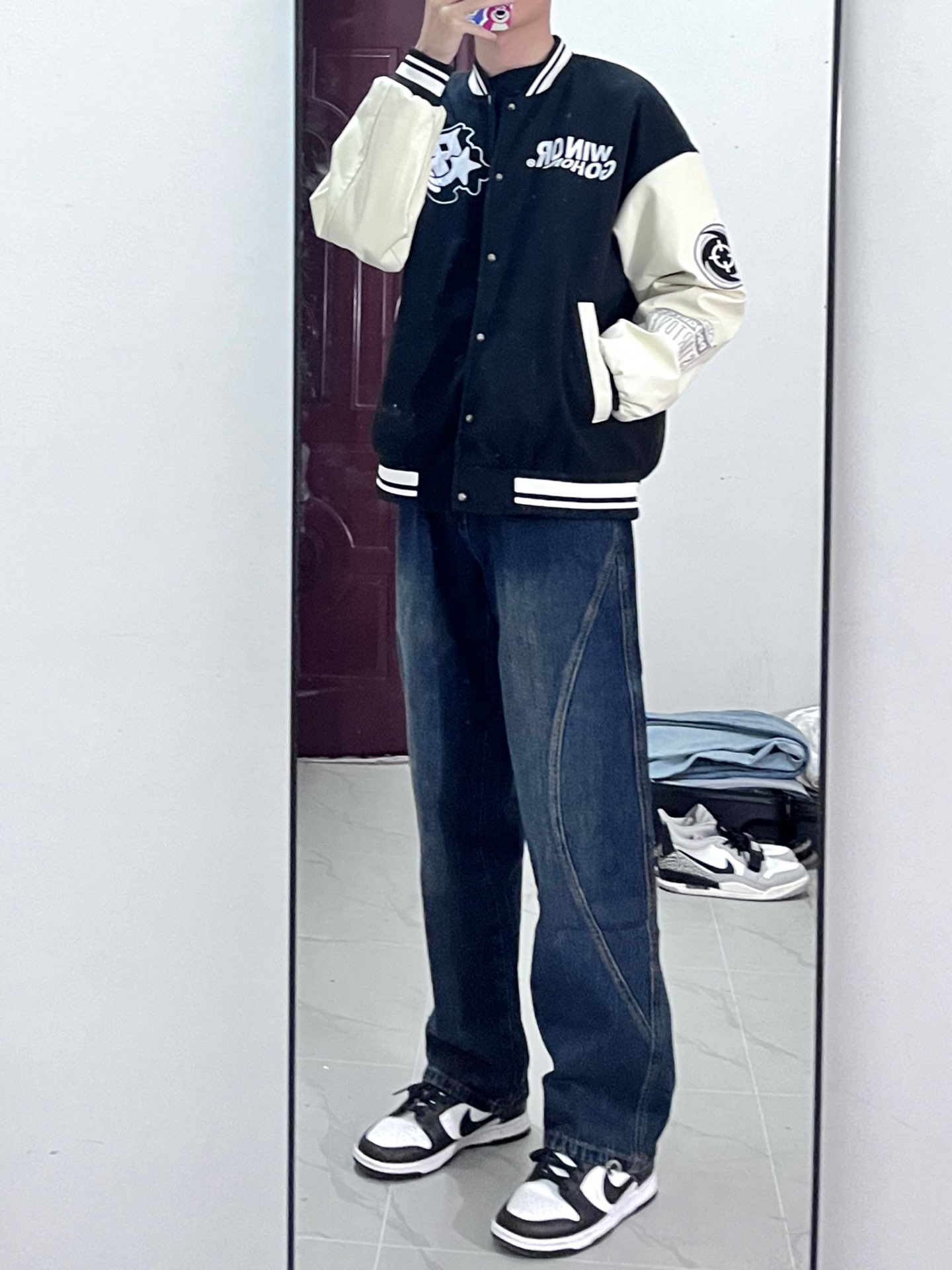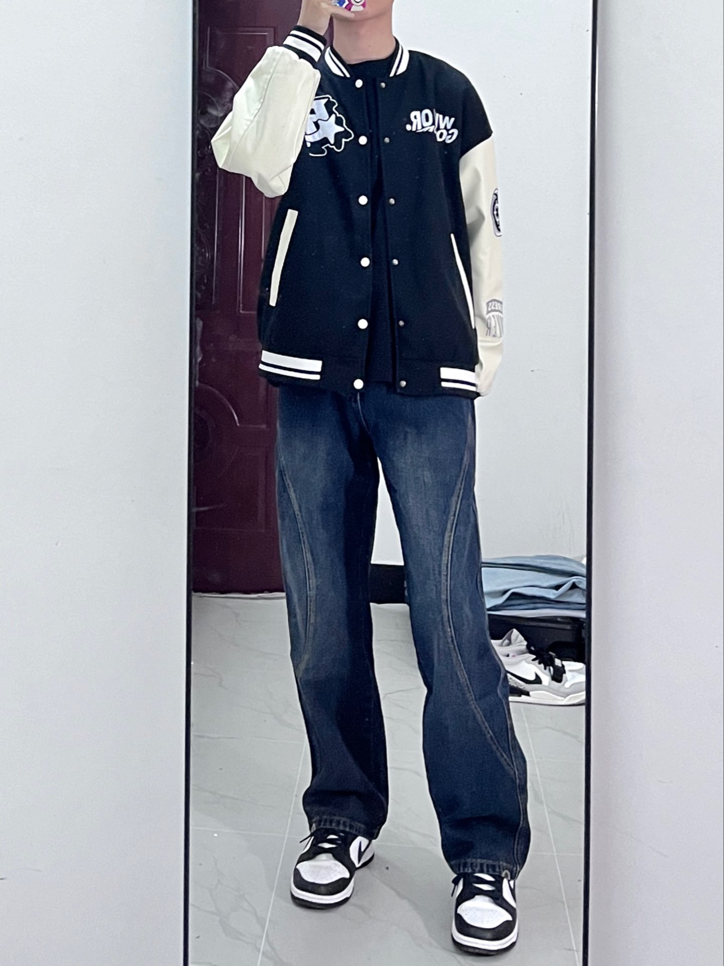 今天穿这身🙋 黑色棒球服就很适合秋天穿 尤其大学生上课就很适合穿这种,里面搭配一件连帽卫衣也不错😌 搭配黑色牛仔裤,干净利落,上身效果很帅,包帅的OK