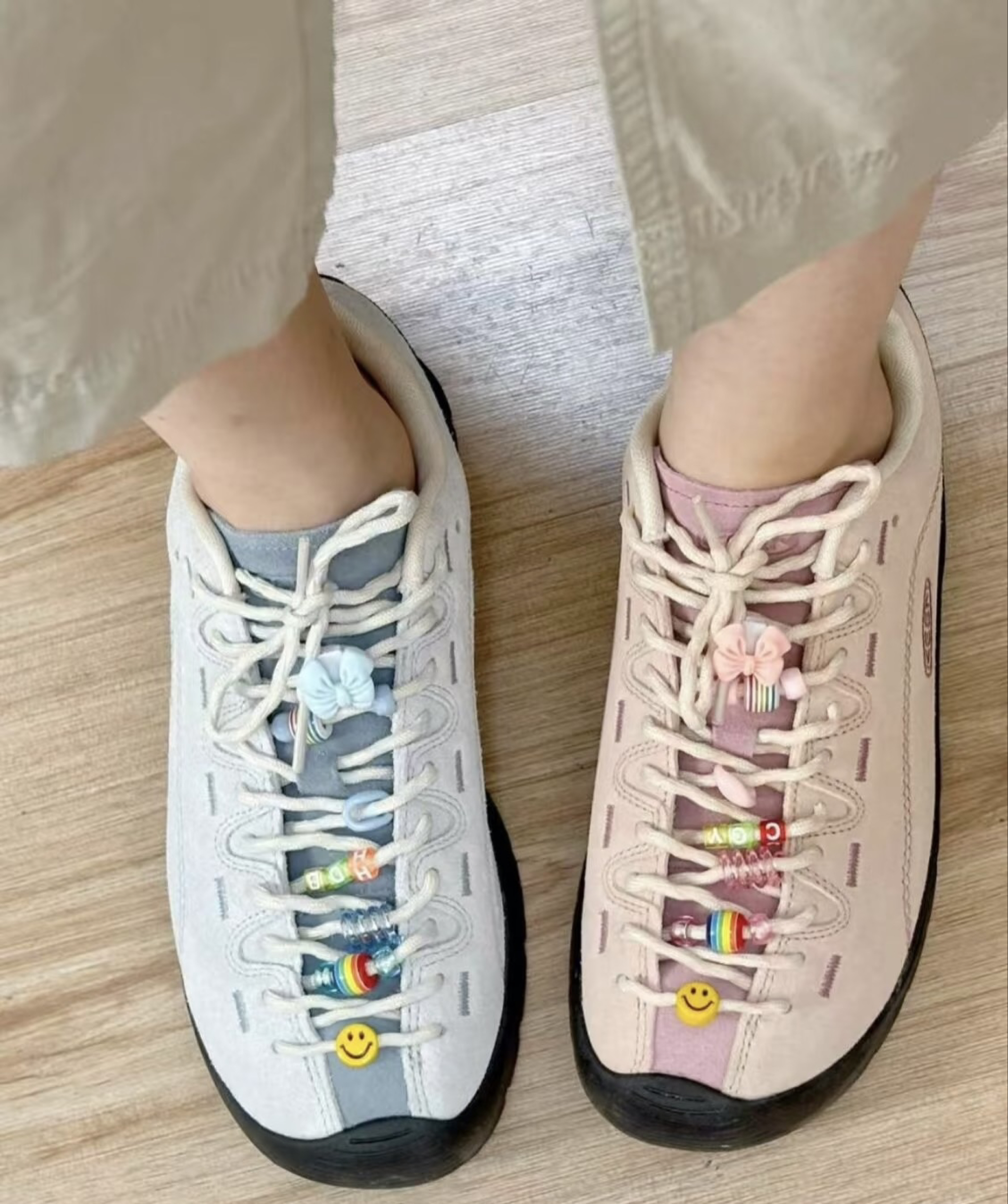 树莓粉亚瑟士跑鞋 把少女心和复古感都结合起来了 个人觉得正面看比较一般 但奈何侧面颜值高哇! 银色则千禧感十足!