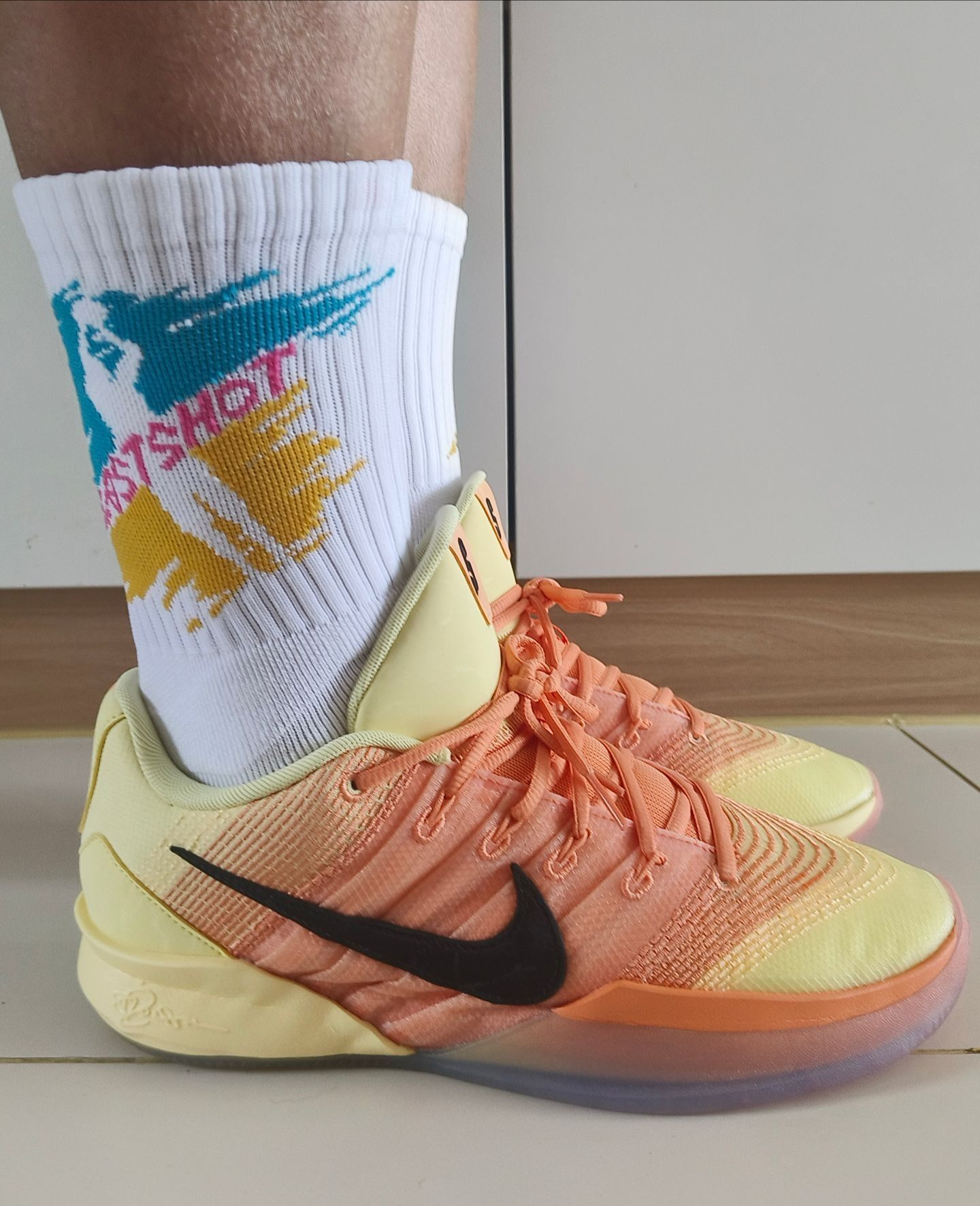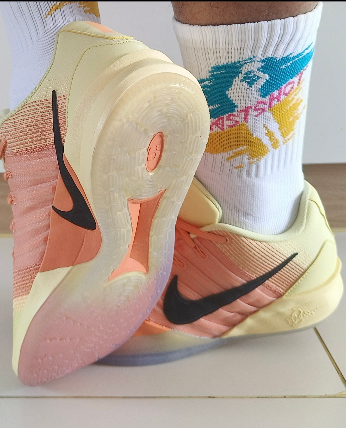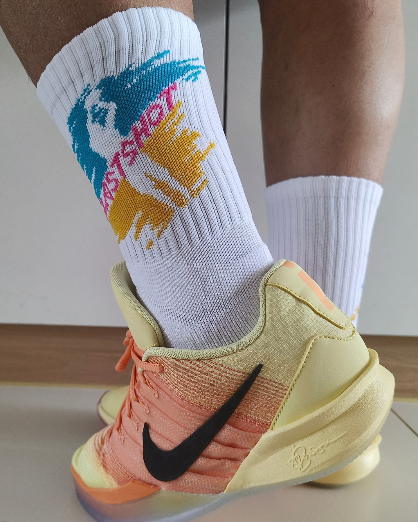 这双篮球袜在袜身侧面的打球图案辨识度不错,而且我觉得在穿搭上更有层次感了,搭配彩色球鞋也挺帅气 袜子我穿着包裹感挺好,在脚踝和脚尖都有加固设计,袜底加厚和防滑纱的使用上,我觉得比较柔软还不打滑,整双袜子还是挺适合打球穿着