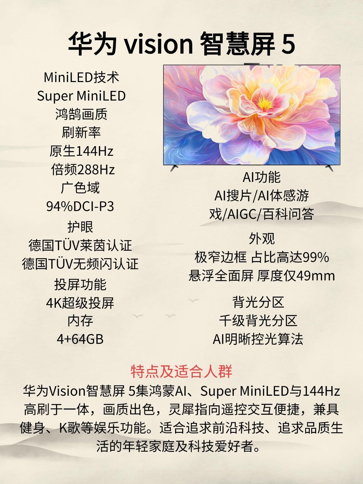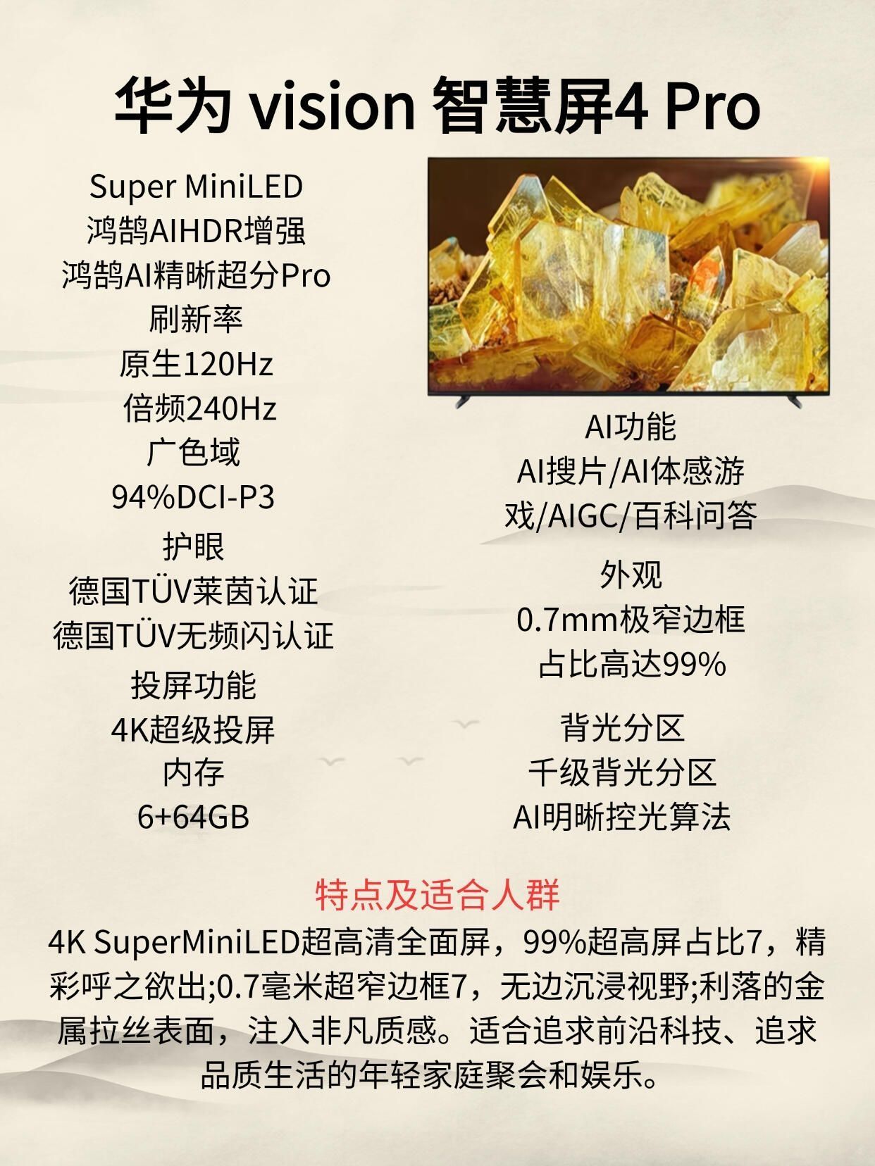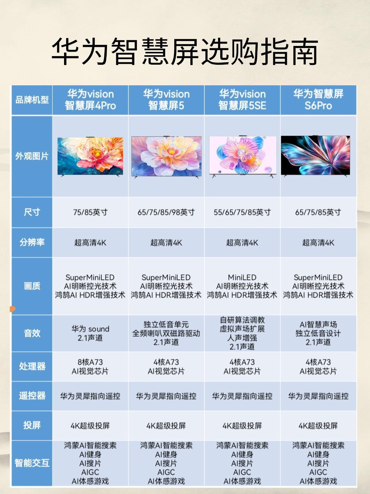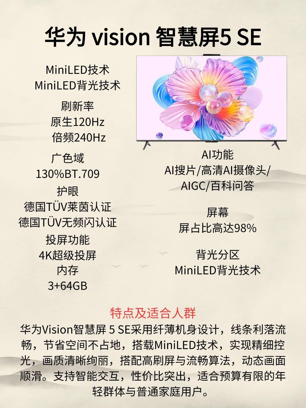 本篇笔记关联了HUAWEI/华为 Vision智慧屏4 SE系列 平板电视 55/65/75/85英寸 AI摄像头超高清 液晶 护眼 好搭档 远场语音 底座款 鸿鹄画质 超大屏 鸿蒙 高刷 迅晰流畅 二级能效 新一代 超级投屏 超级娱乐 原厂标配 75英寸 HD75KUNL、HUAWEI/华为 智慧屏Vision 5 平板电视 65/75/85/98英寸 护眼 动态加速 一级能效 鸿鹄画质 说剧情搜大片 智慧搜索 壁画 液晶 灵犀指向遥控 超清 98英寸 HD9XAJMN等商品,为用户提供真实的使用体验和购买参考。