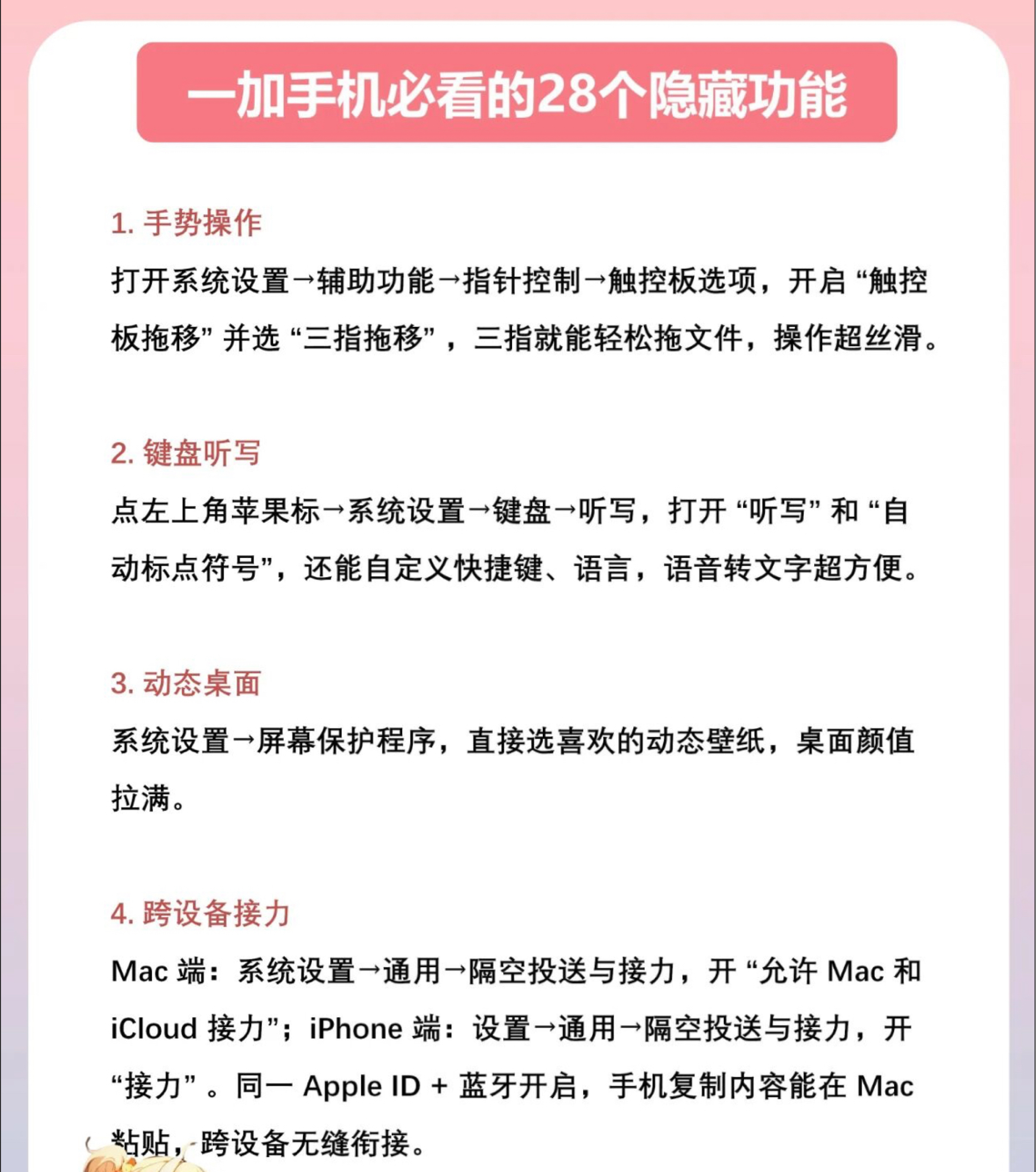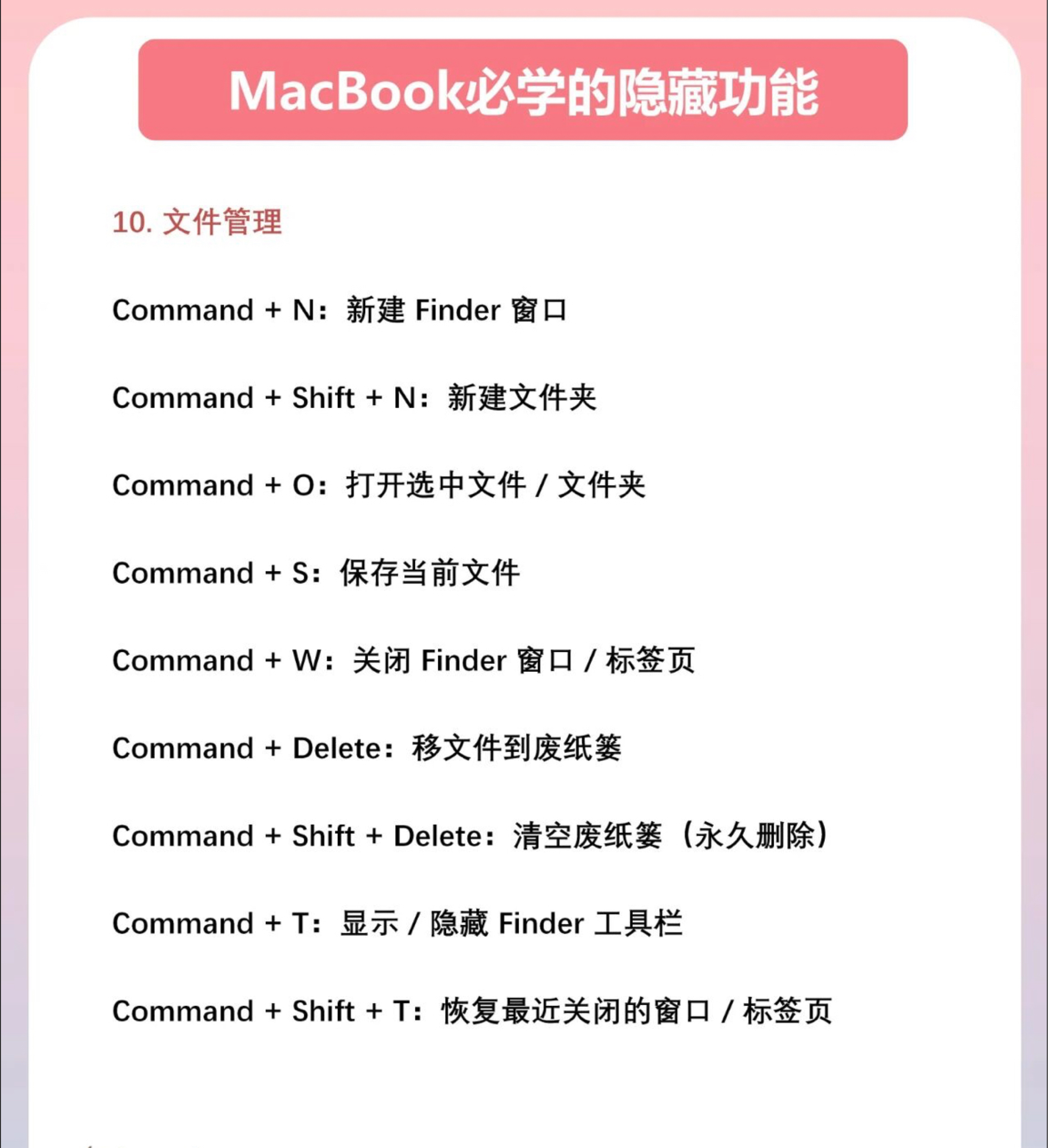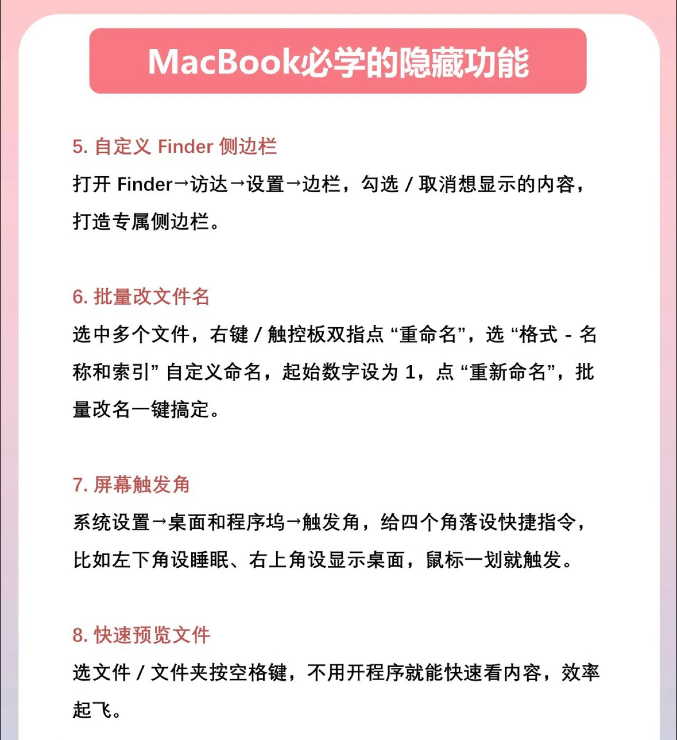 MacBook 有什么功能是你用了很久才发现❓ 新手快收!超简操作 + 快捷键,图标超好记,上手超简单🚀 🍓 必做小设置 三指滑文件🍃 设置→辅助功能→触控板选项,开 “三指拖移”,滑一下文件就动啦~ 批量改称呼✏ 选文件→右键 “重命名”→格式 “名称和索引”,瞬间整齐超省心! 角落有妙招🎯 设置→桌面和程序坞→触发角,四角设功能(如🌙睡眠 /📌便签)。 语音来帮忙🎙 苹果标→键盘→听写,开启后...
