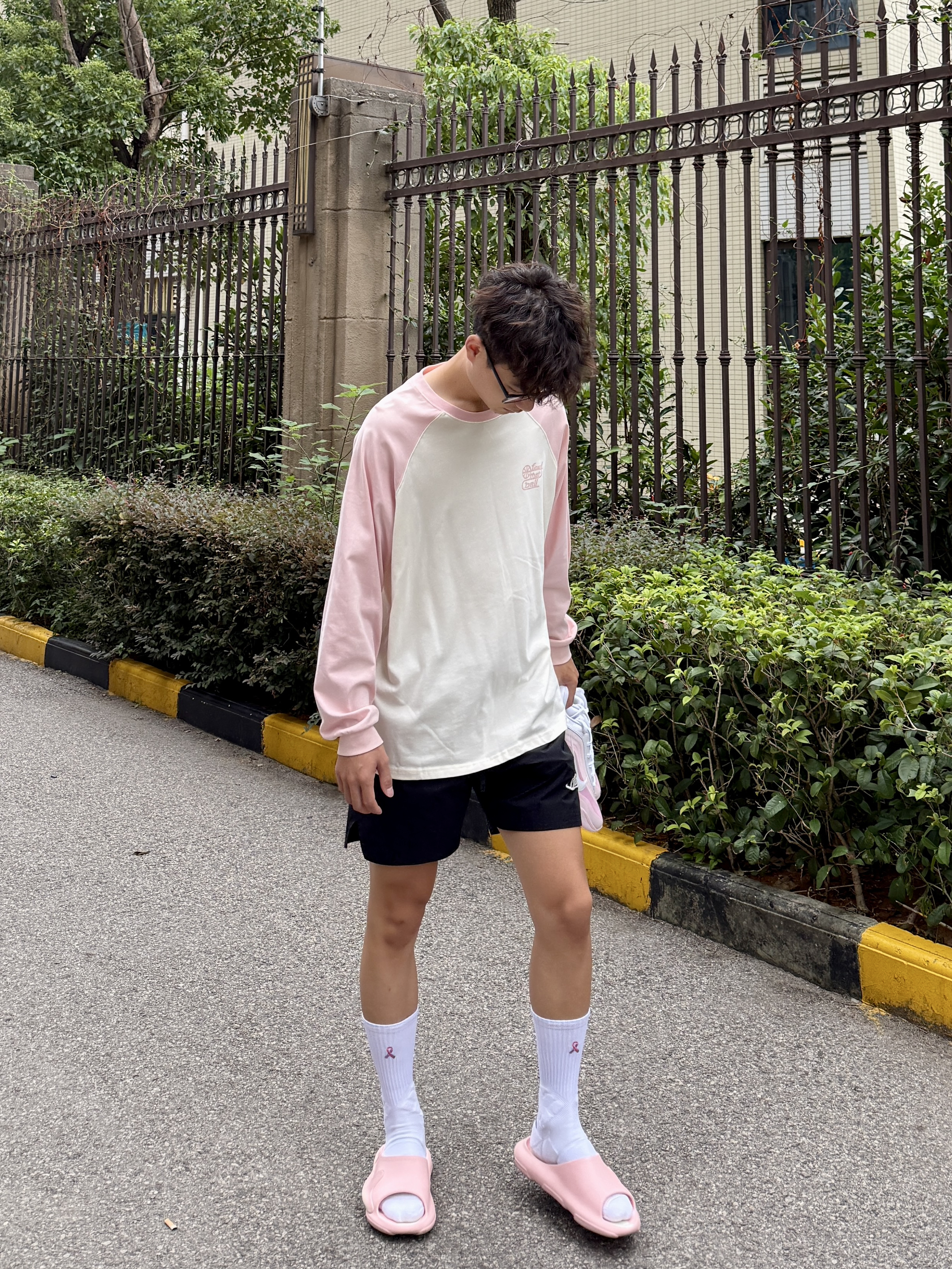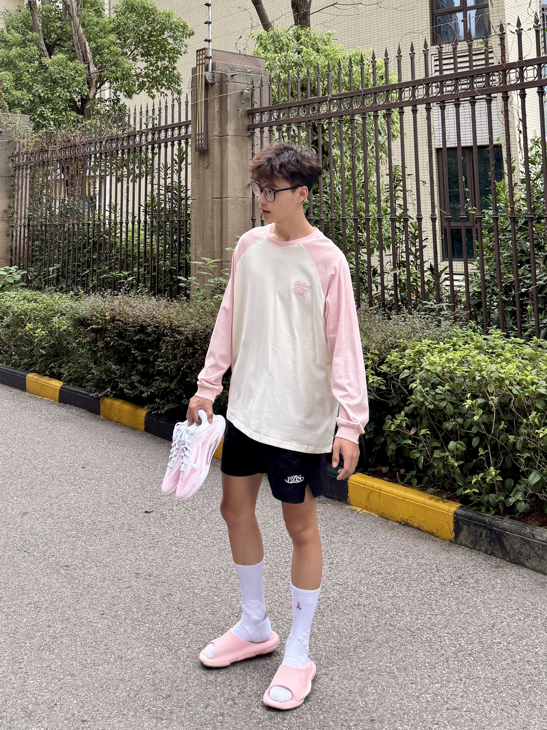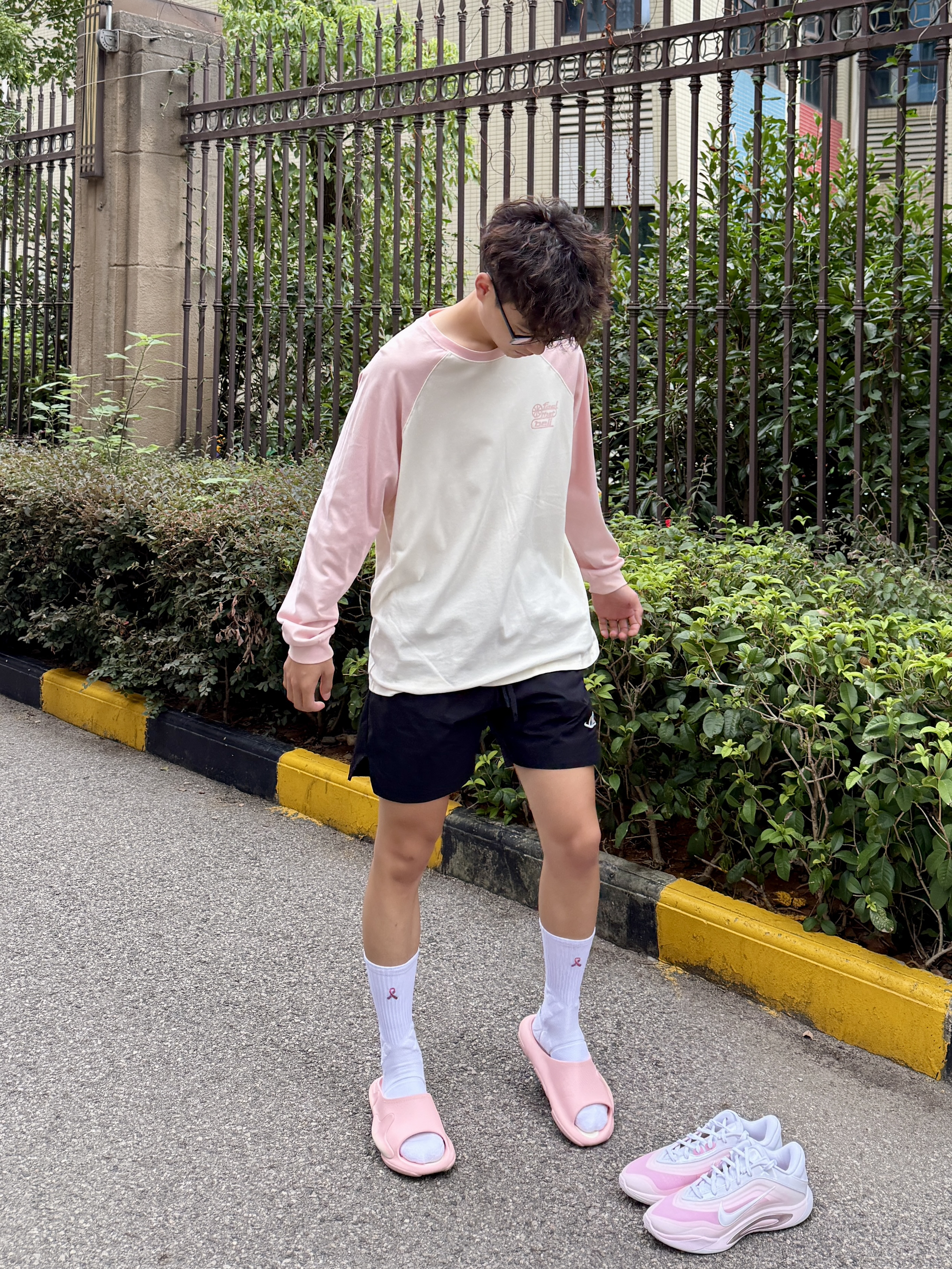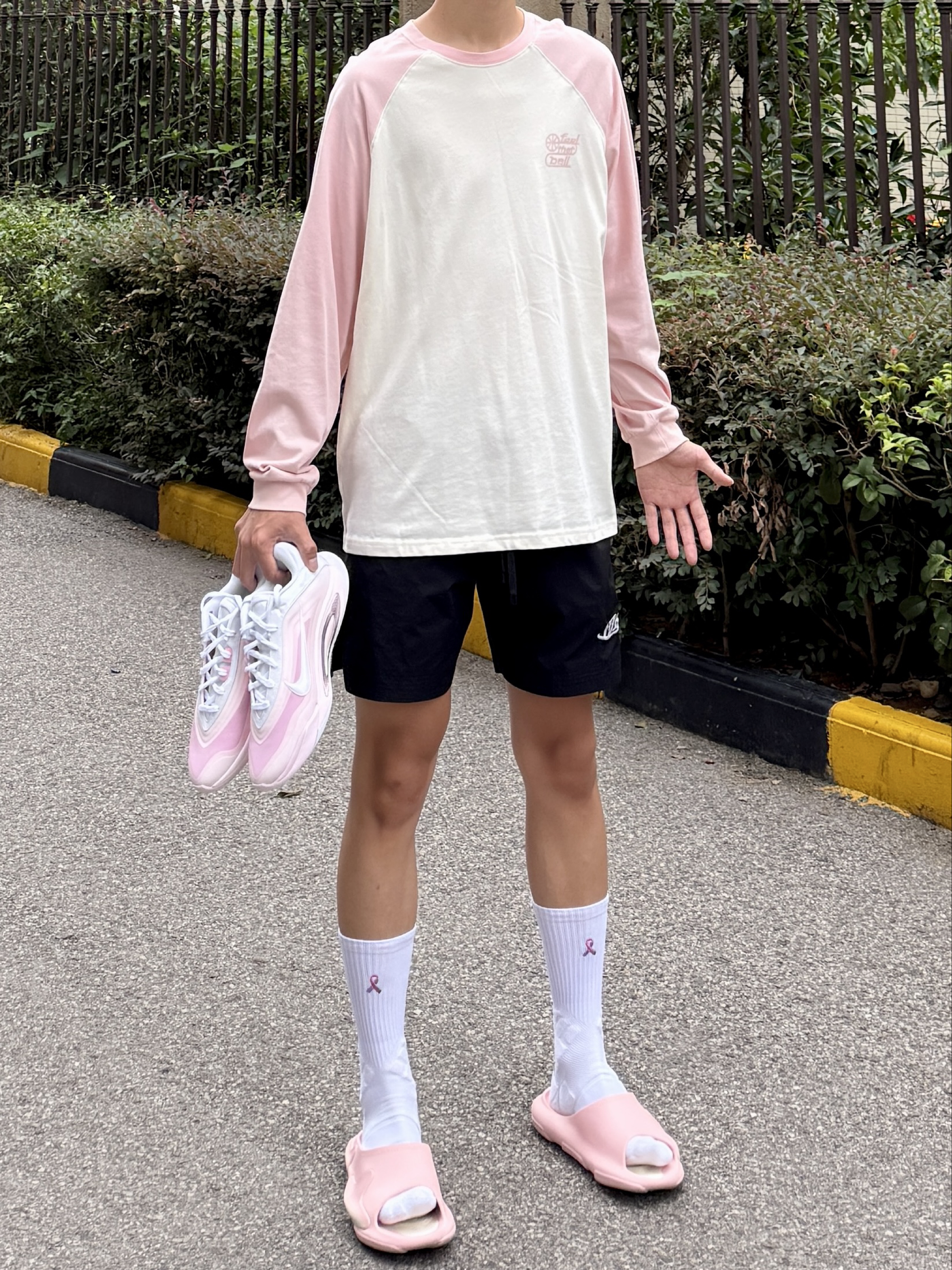 粉色真爱者今日份粉白插肩袖搭配黑短裤利落清爽 颜值不错揣着粉鞋直冲球场 拖鞋与球鞋的切换是属于篮球男孩的穿搭形态!
