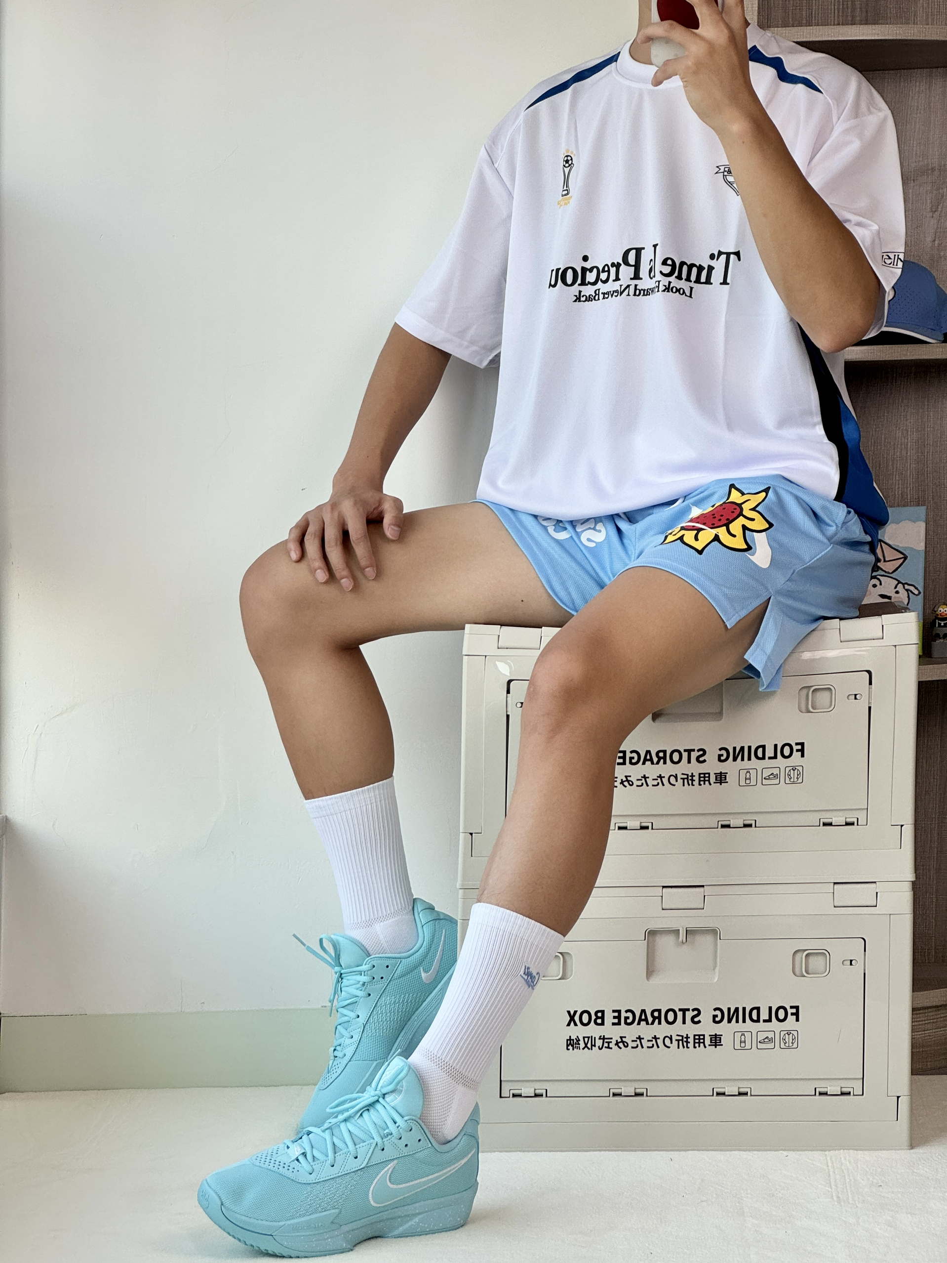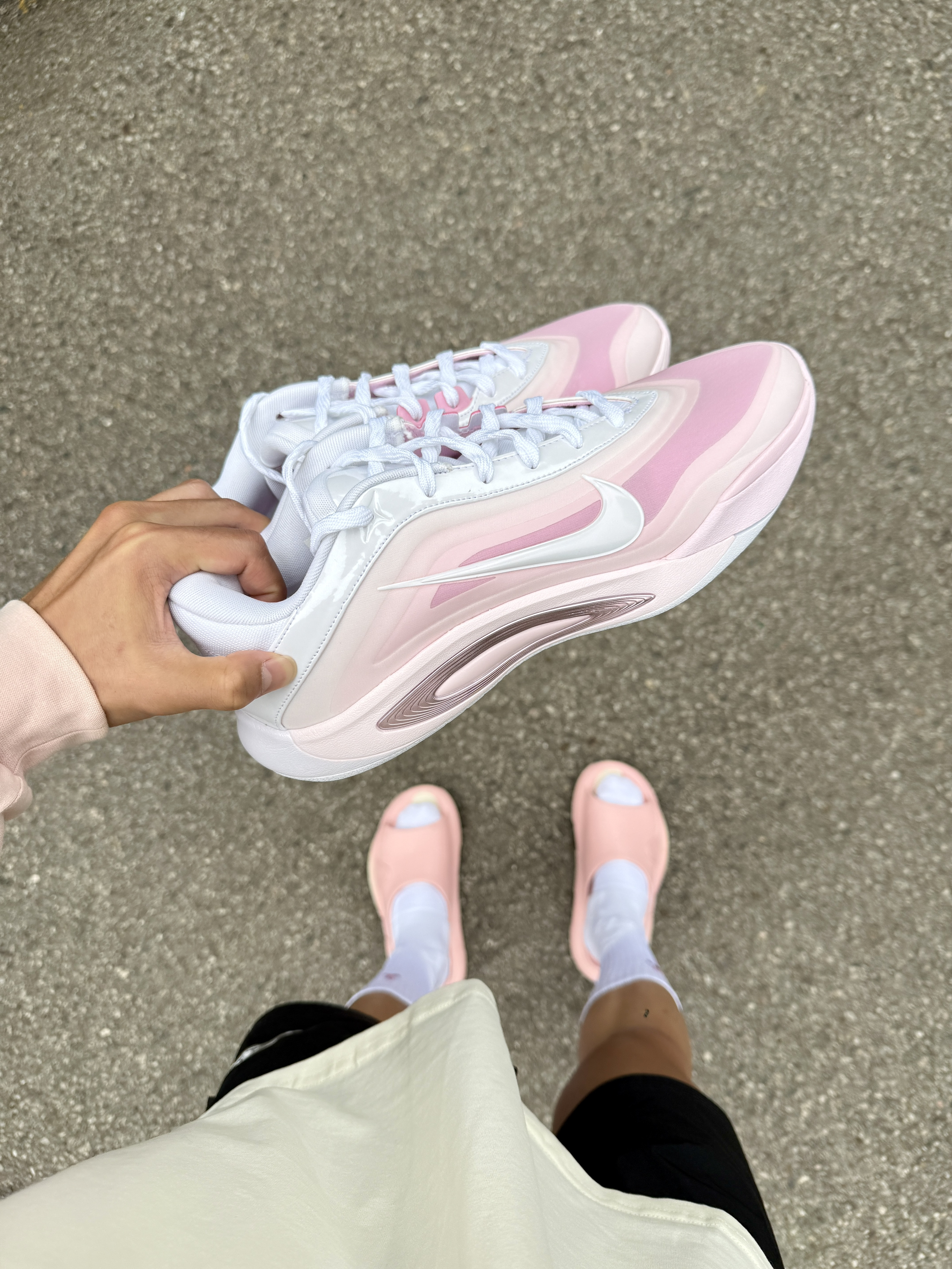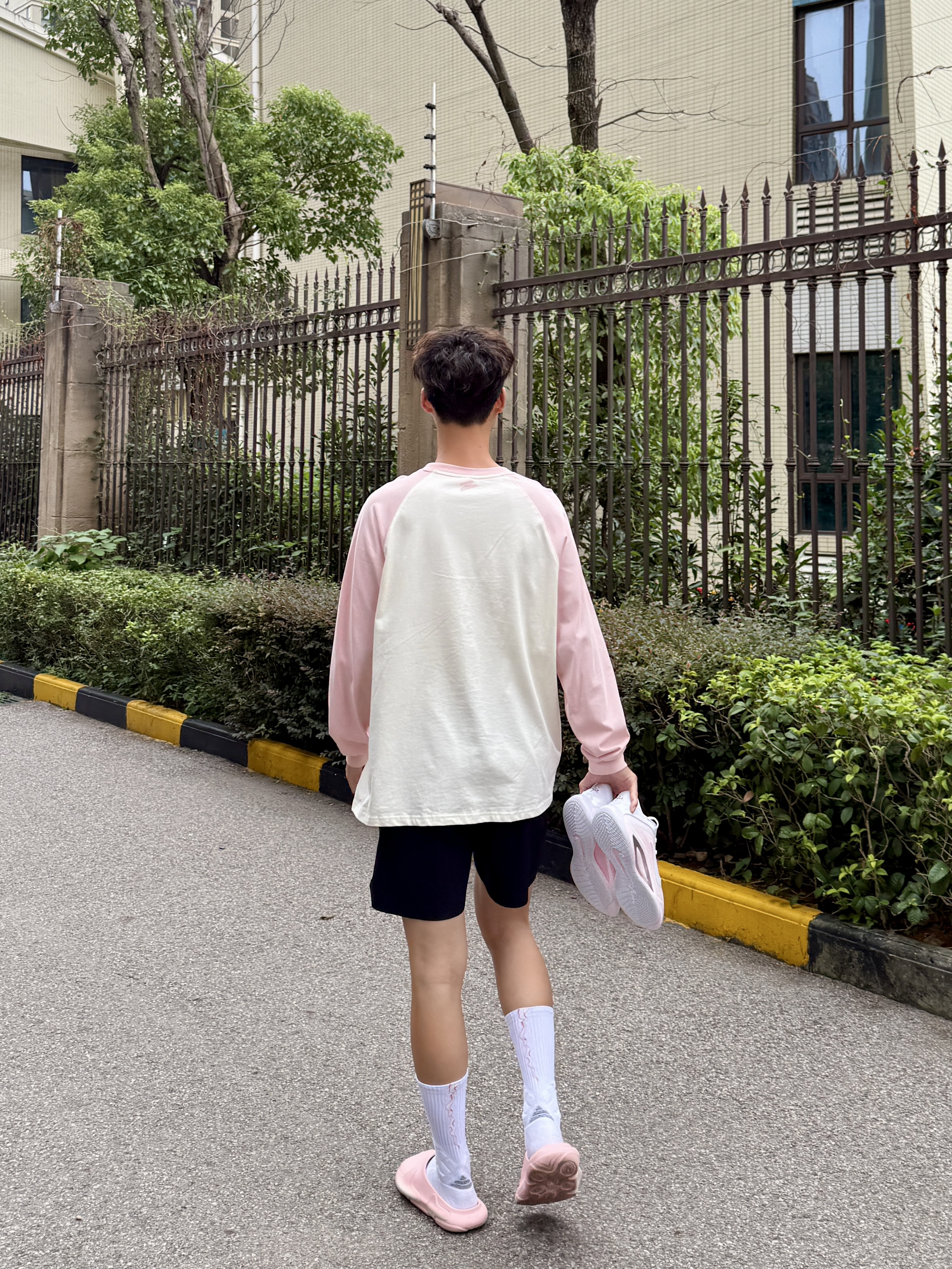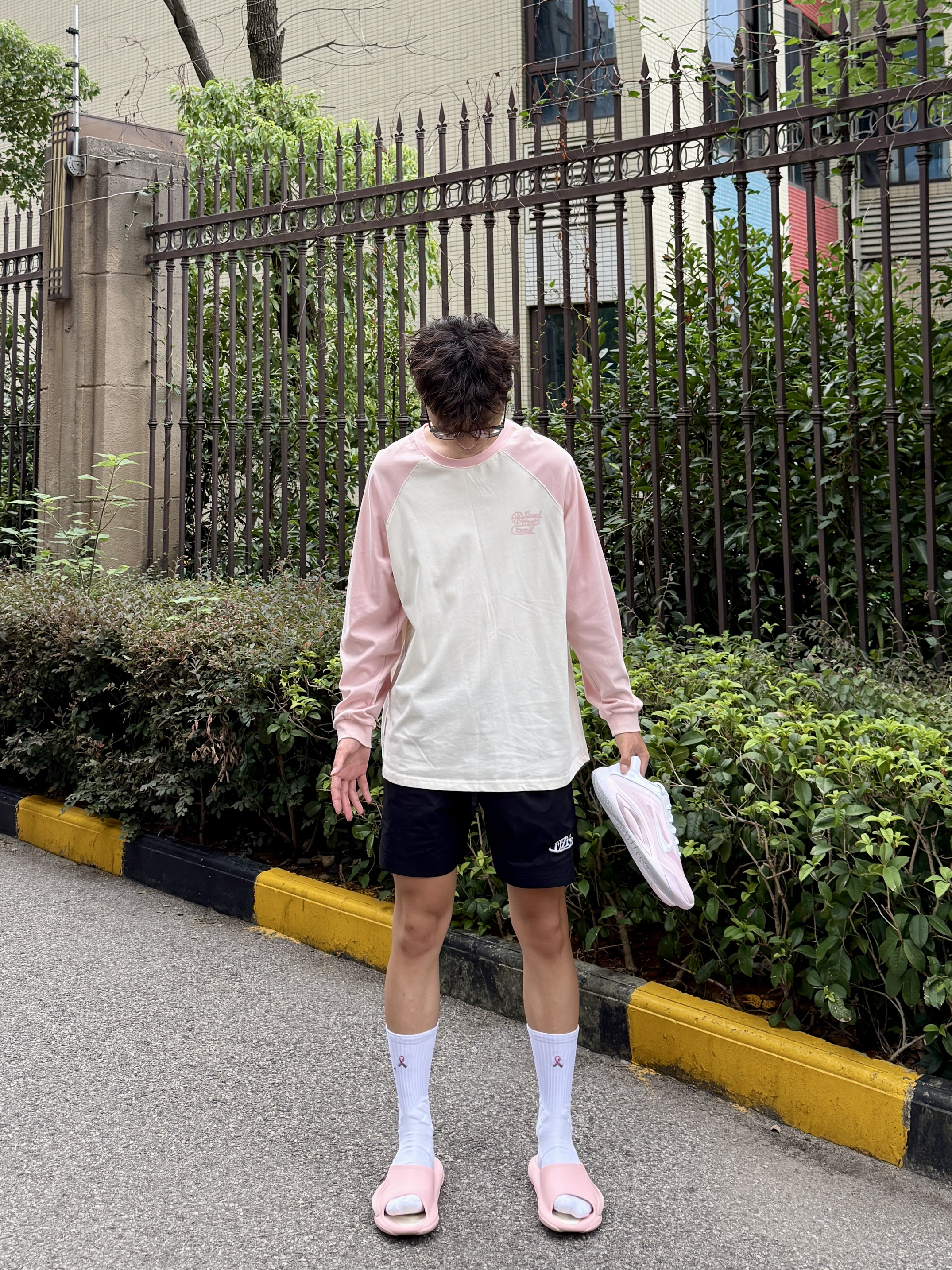 粉色真爱者今日份粉白插肩袖搭配黑短裤利落清爽 颜值不错揣着粉鞋直冲球场 拖鞋与球鞋的切换是属于篮球男孩的穿搭形态!