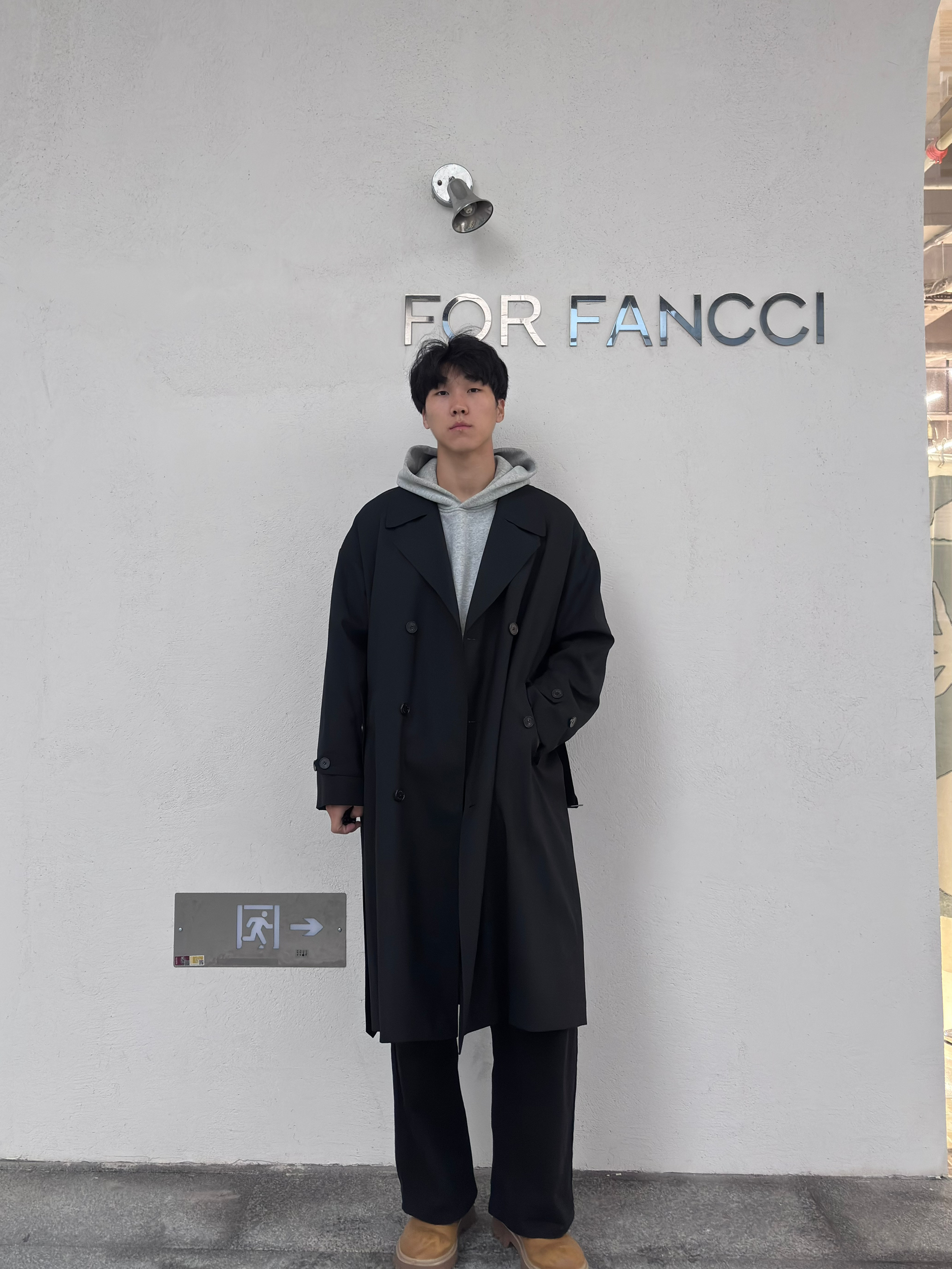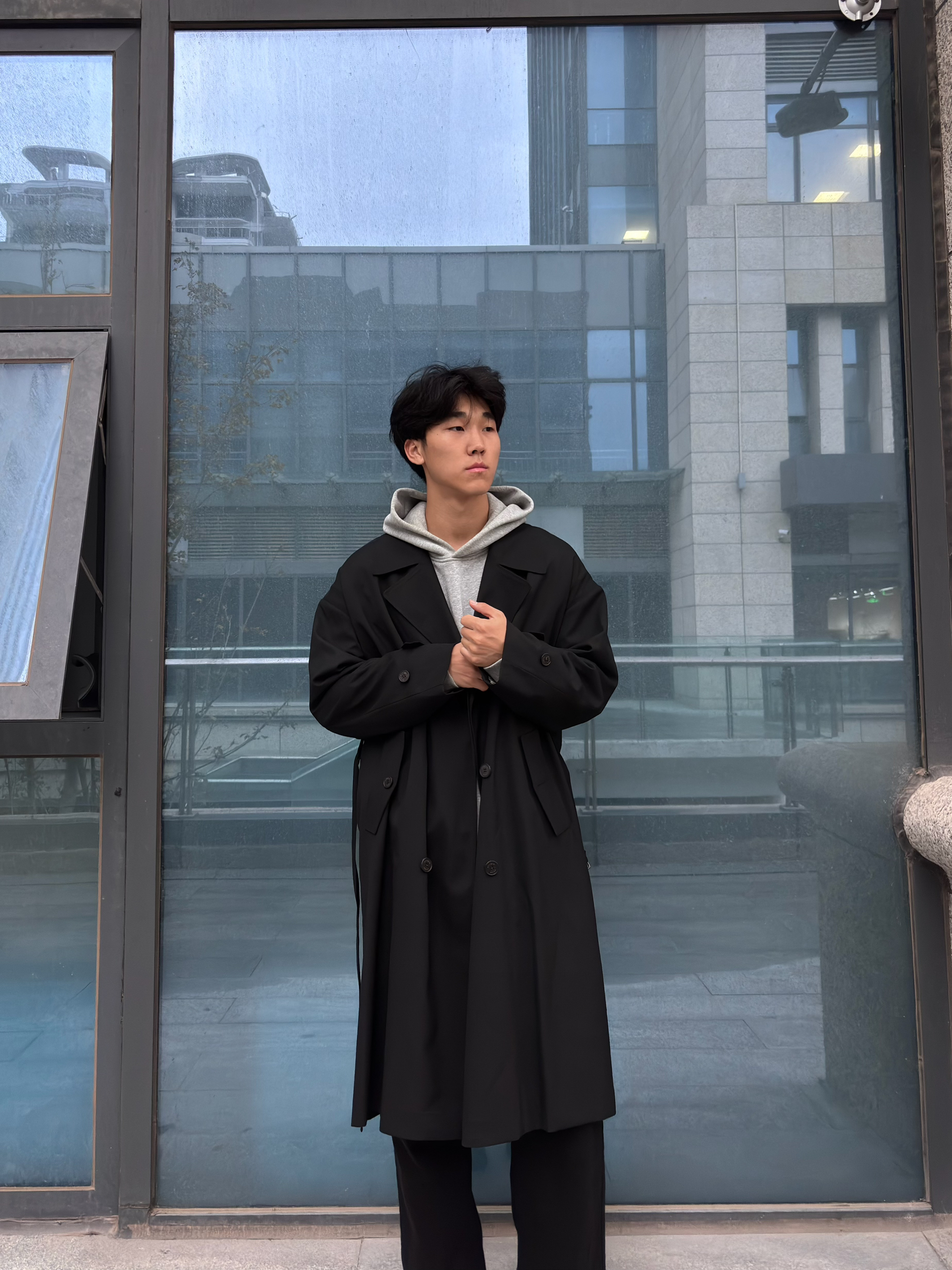 黑色长款风衣搭配,浅灰和黑色的配色经典又高级,视觉上很和谐 先说说卫衣,它的版型宽松又挺括,不会软塌塌地没型,连帽的设计自带青春活力感,面料也是软糯亲肤的那种,单穿就很舒服 风衣整体一上身就非常有氛围感,加上双排扣更能穿出来精致感