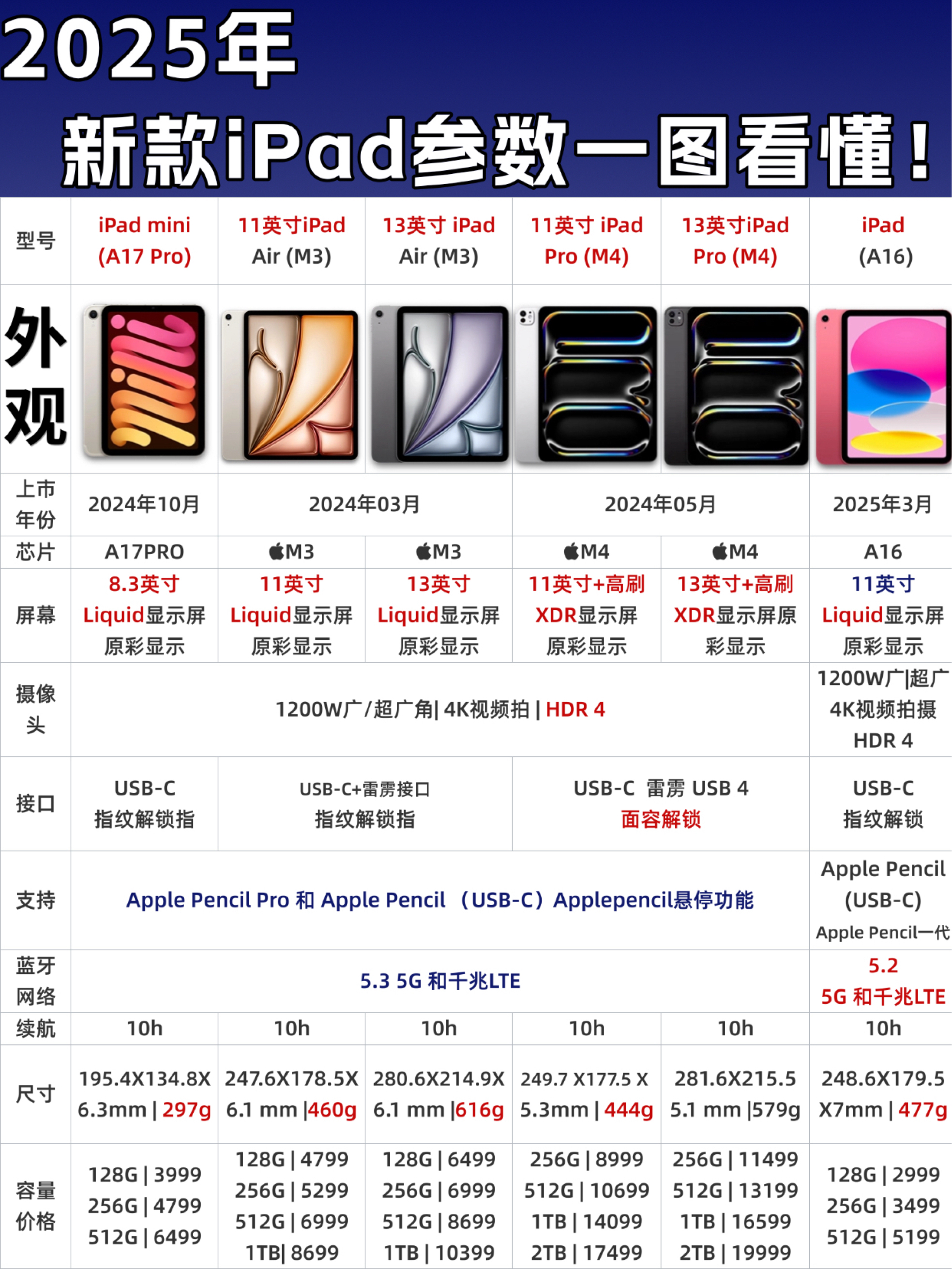 还在纠结2025年买哪款iPad?别盲目跟风!这份攻略帮你按需求精准匹配,每一分钱都花在刀刃上~ 一、四大系列精准定位 • iPad 11(A16芯片):性价比之王,学生党、追剧党直接冲。128GB起步+长续航,网课、记笔记、刷剧完全够用。缺点是非全贴合屏(强光易反光)、60Hz刷新率,且只支持第一代Apple Pencil(充电麻烦),追求实用不折腾选它。 • iPad mini 7(A17 P...