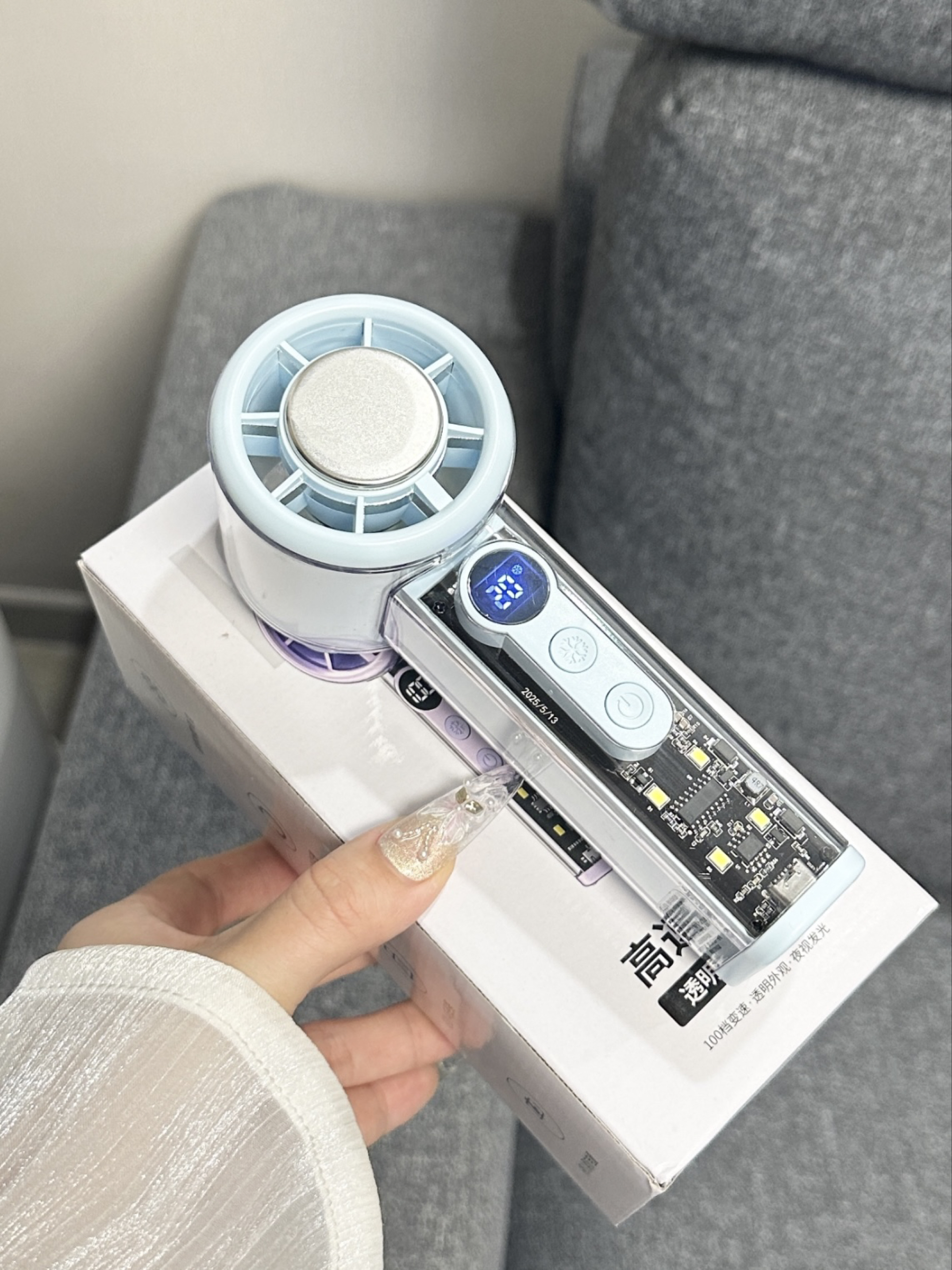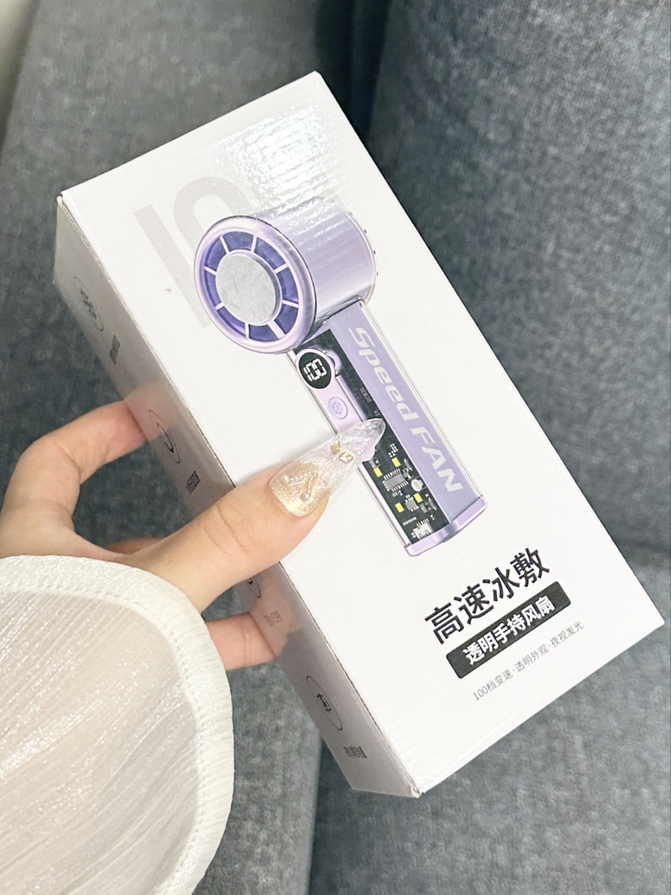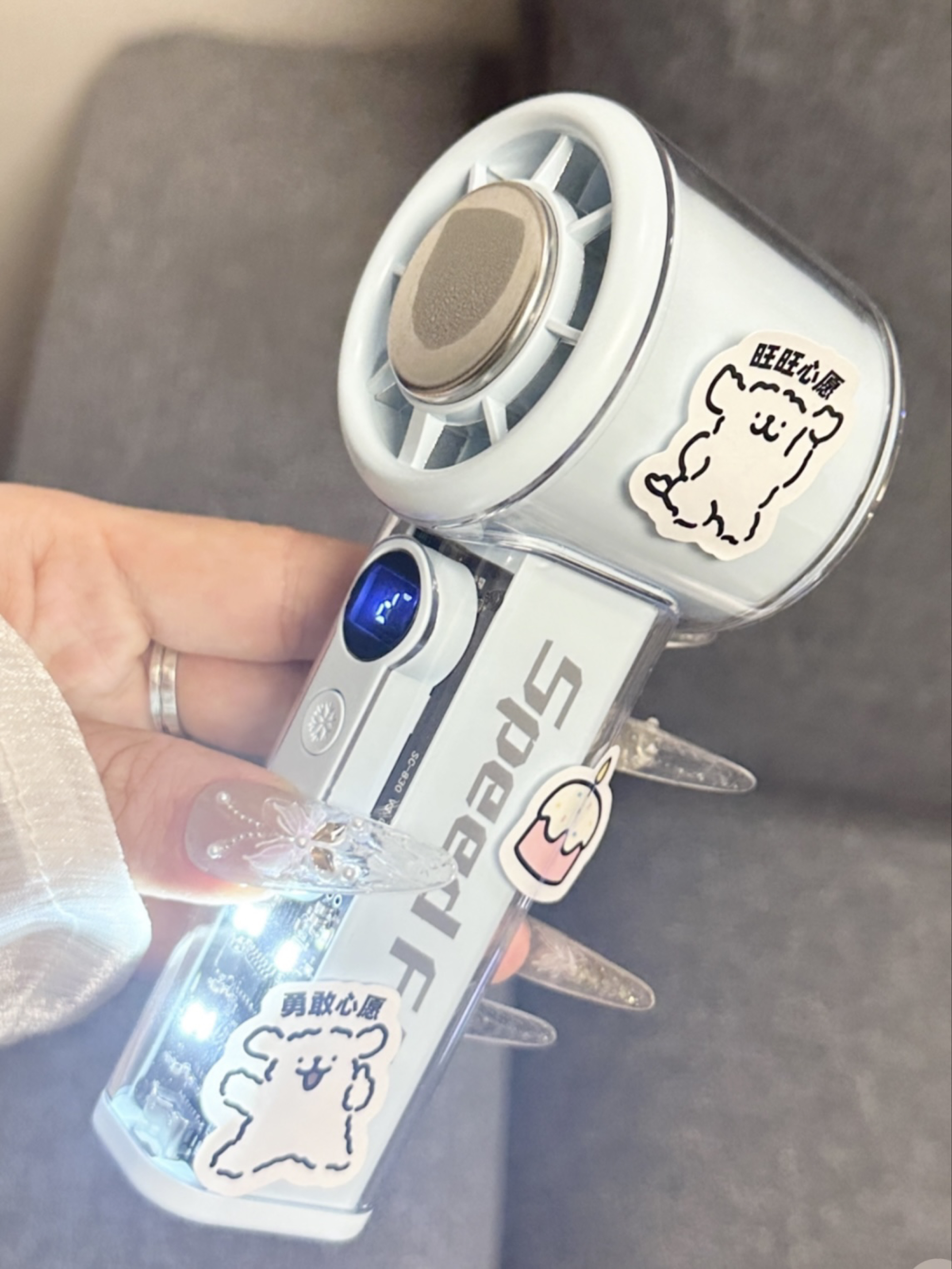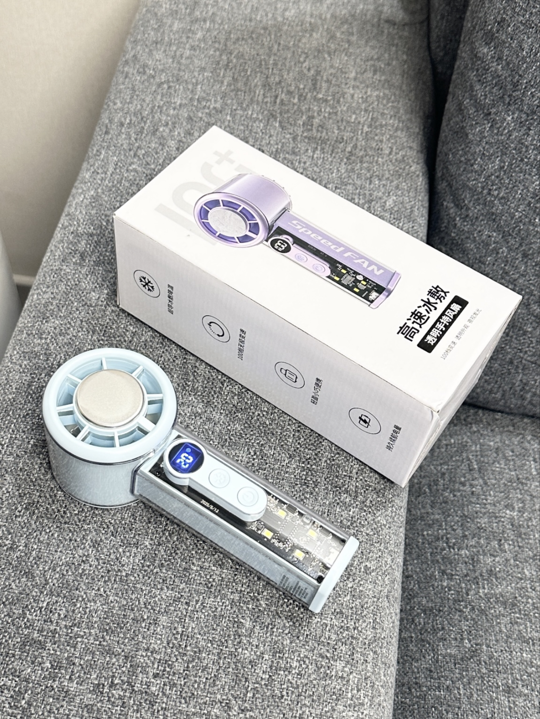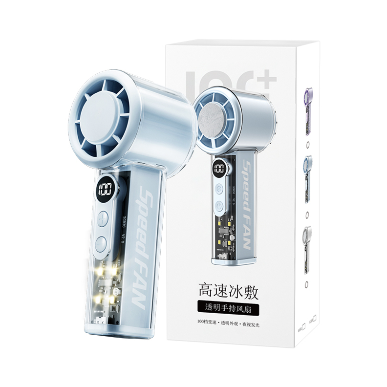 谁懂我们怕热女孩子呀 现在夏天一出门就会流汗脱妆 多亏了介个小风扇呢 蓝色我看起来感觉好清爽呀 有100档我们可以选择呢 而且我们还可以冰磁制冷~ 夏天出门尊滴好方便啦