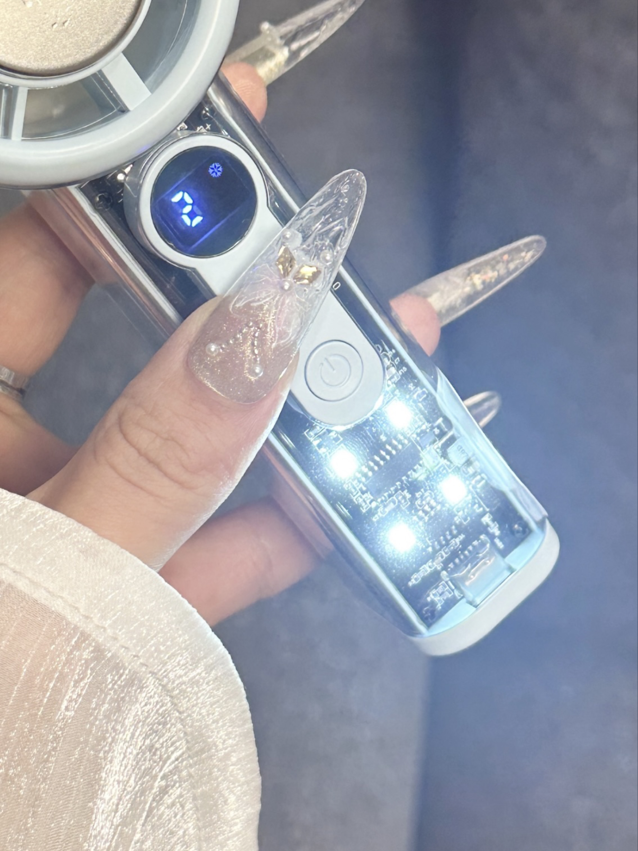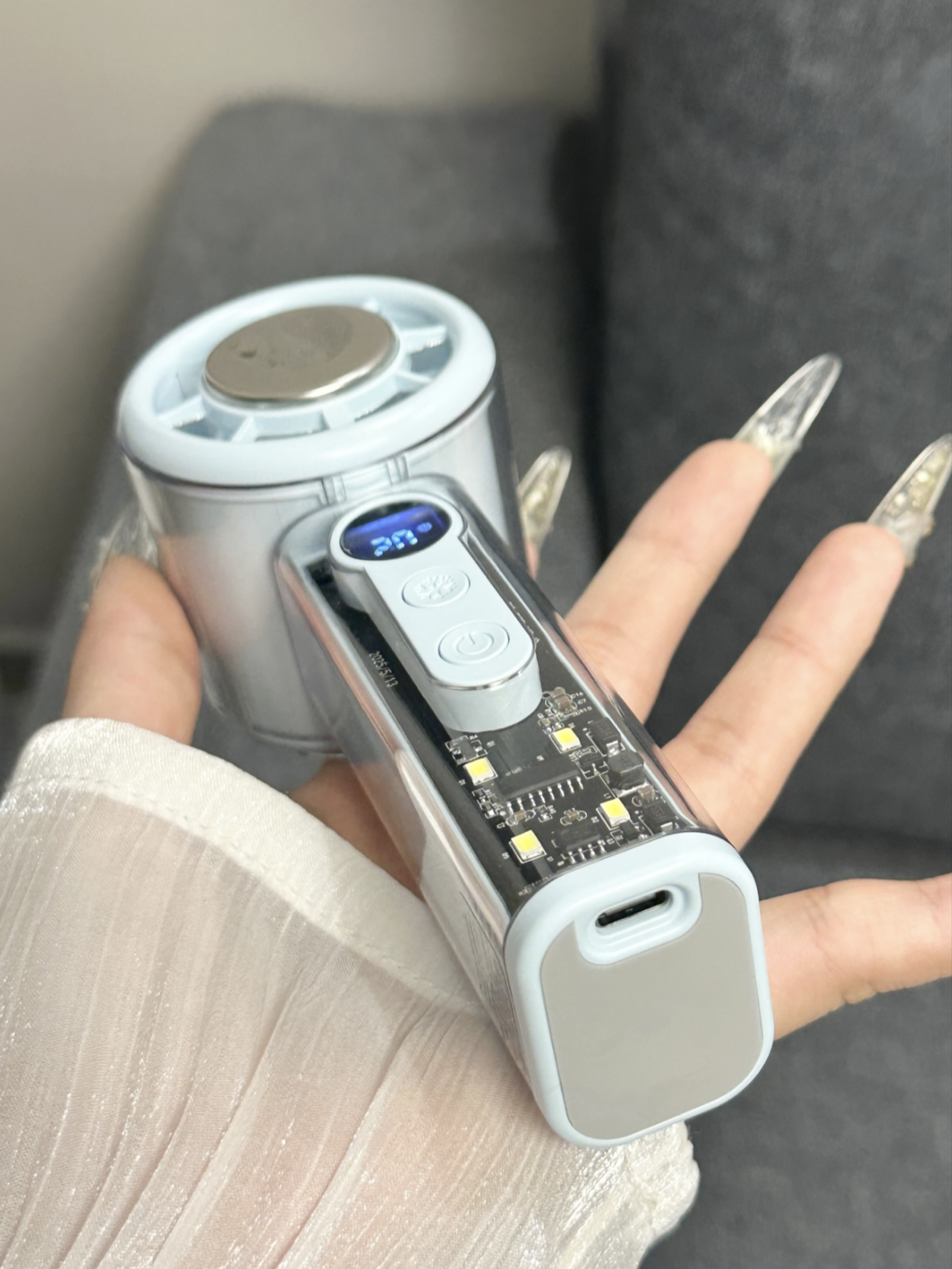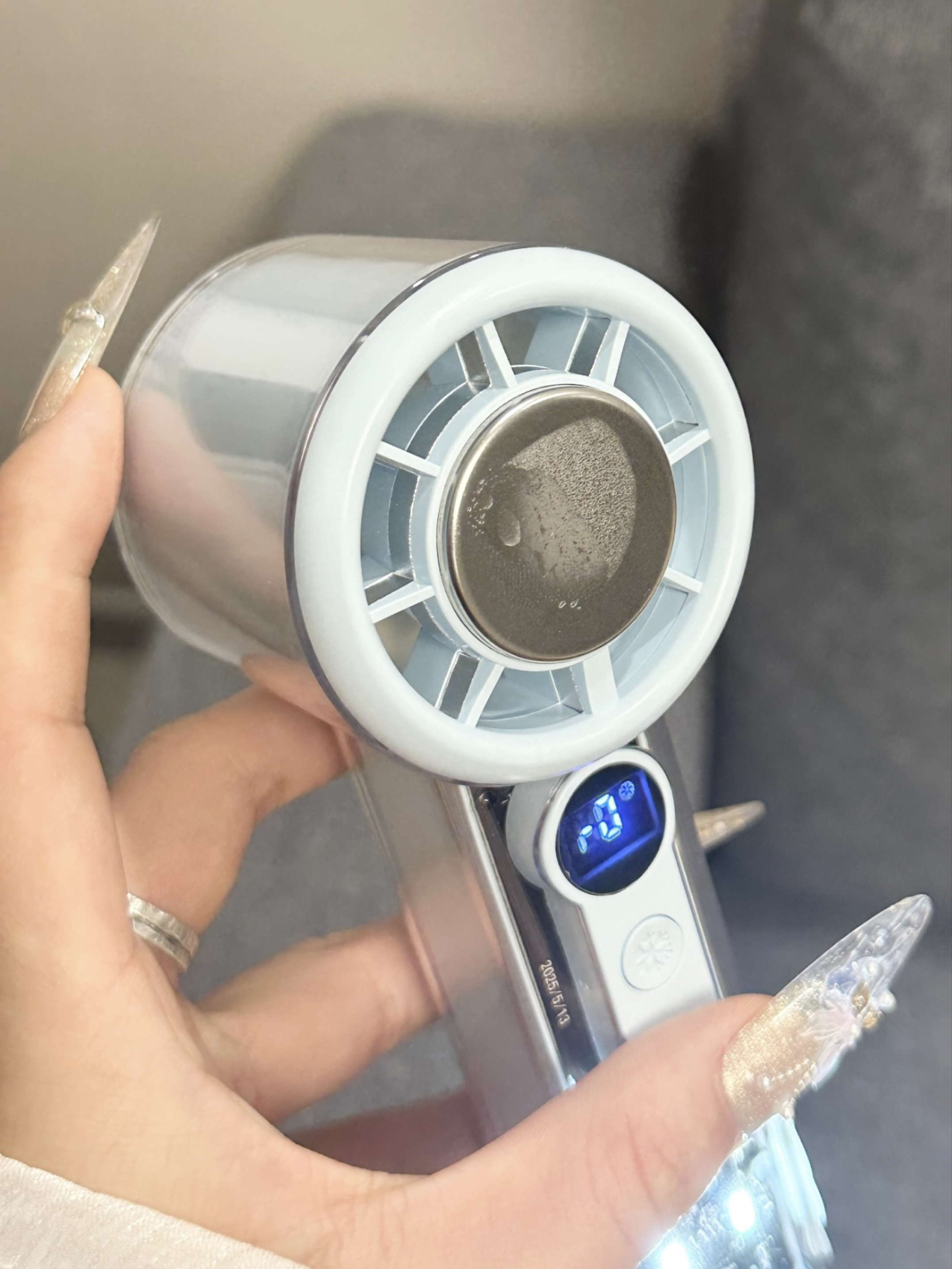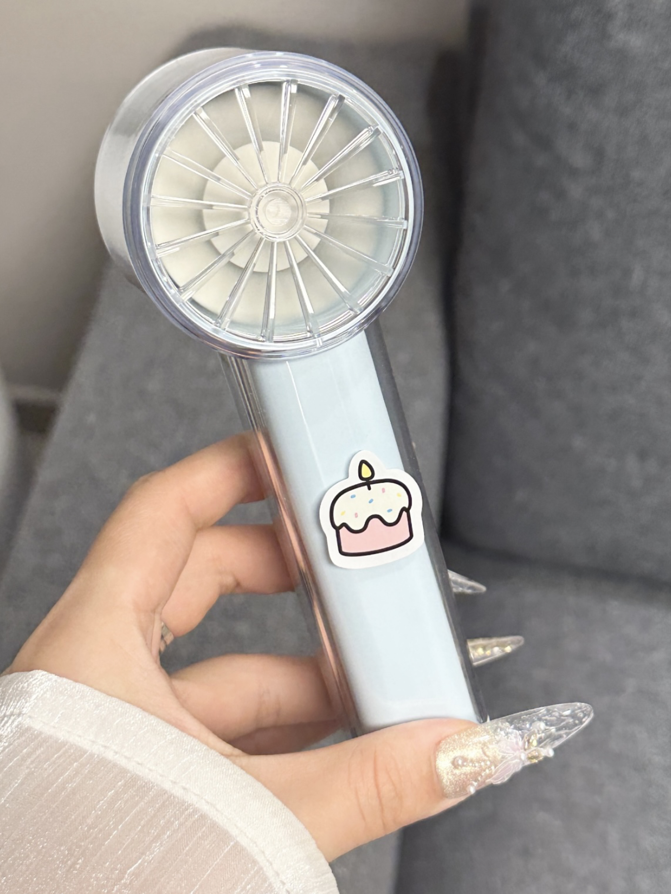谁懂我们怕热女孩子呀 现在夏天一出门就会流汗脱妆 多亏了介个小风扇呢 蓝色我看起来感觉好清爽呀 有100档我们可以选择呢 而且我们还可以冰磁制冷~ 夏天出门尊滴好方便啦