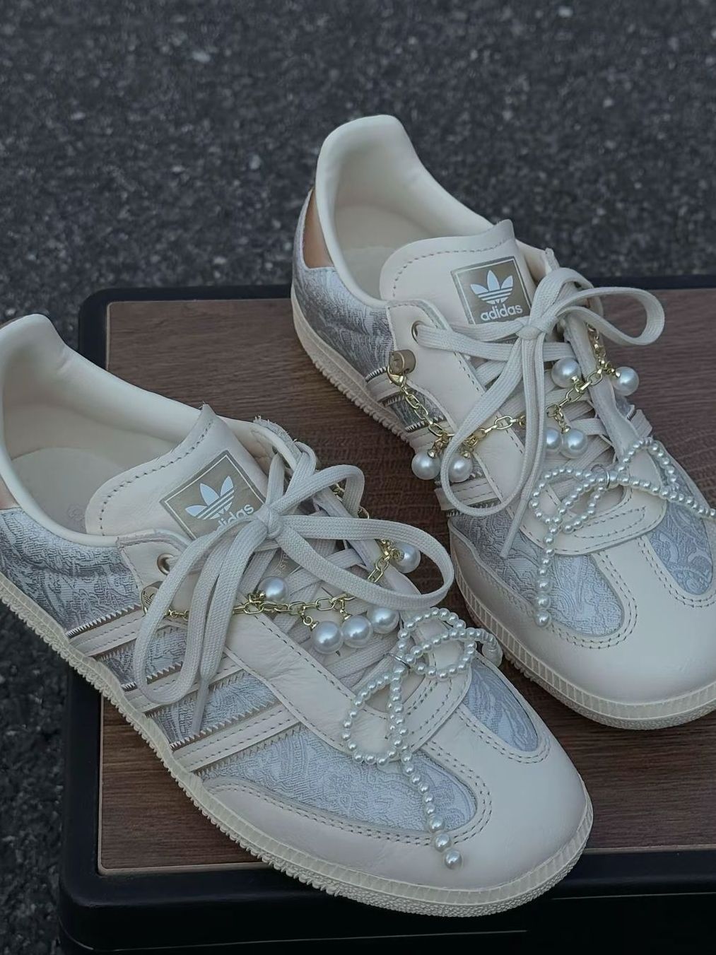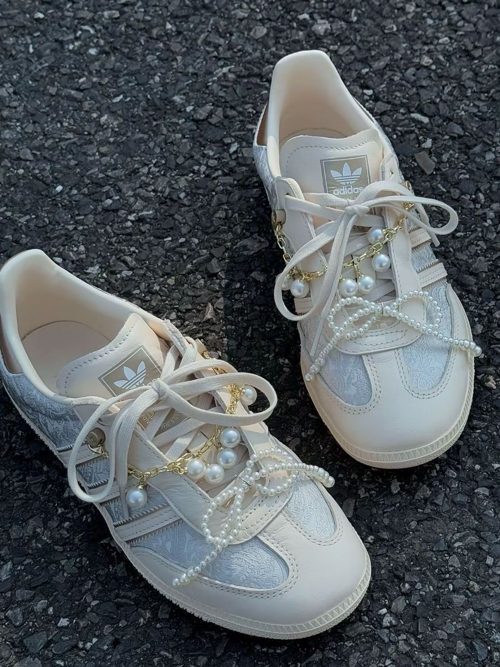 🤍芭蕾风德训鞋真的绝啦! 兼具优雅与舒适,走路都带风~ 上脚秒变温柔千金 温柔的奶茶色☕调搭配珍珠配饰太仙啦 立体浮雕印花复古感十足 珍珠链条 可摘取 仙女们快冲这双🐣