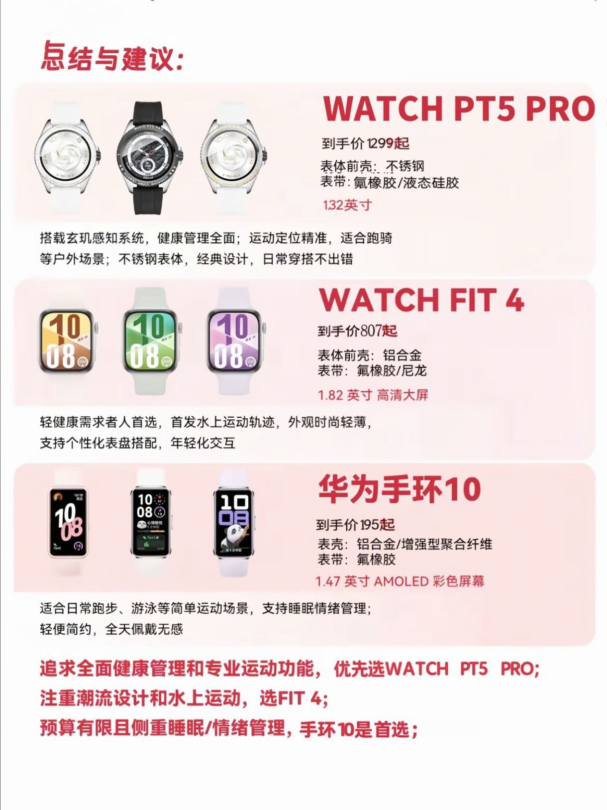 最近在纠结华为手表和手环怎么选?刚好整理了这三款的对比,帮你一眼找到适合自己的款👇 ▪️WATCH GT5 PRO:不锈钢机身质感拉满,适合经常户外运动、注重健康全面监测的宝子。定位超精准,续航也顶,日常穿搭也很显气质~ ▪️WATCH FIT 4:超轻超薄!主打年轻时尚,表盘搭配自由度超高,还支持水上运动记录,夏天冲浪🏄♀️必备! ▪️华为手环10:性价比王者!睡眠、情绪管理做得挺细,戴...