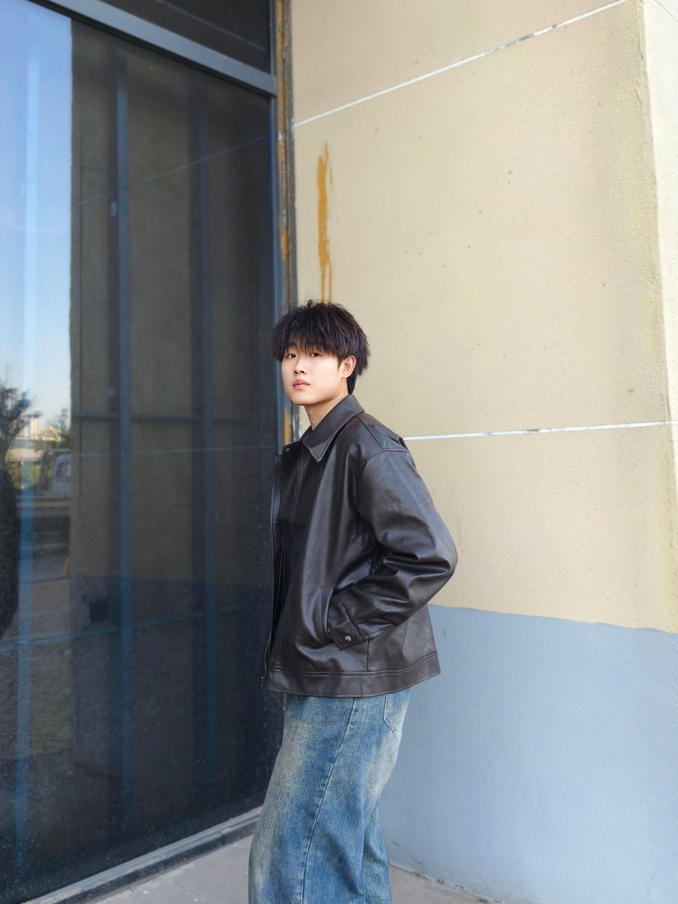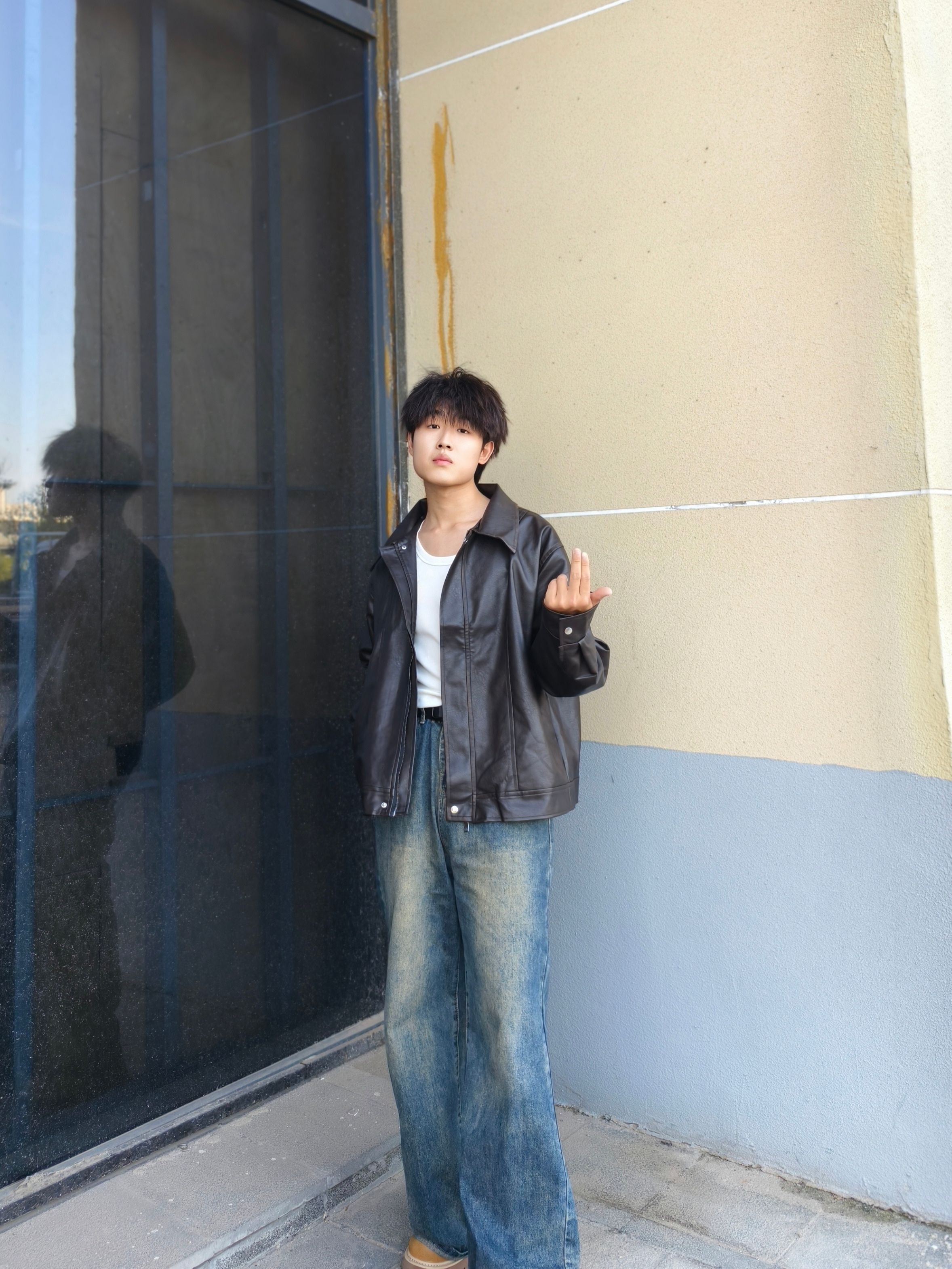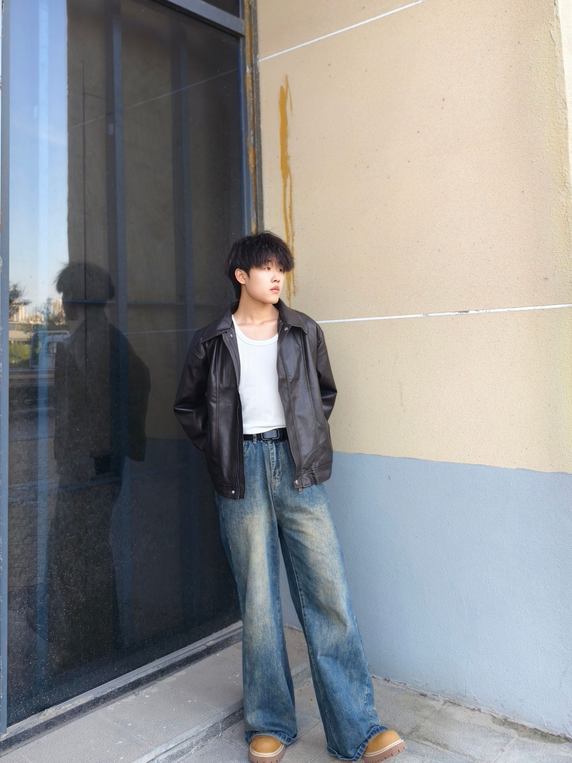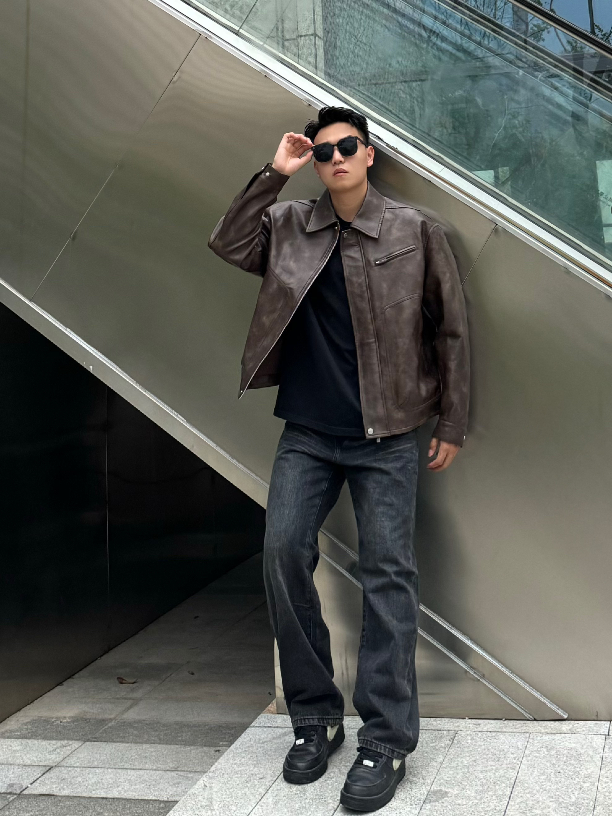 秋季怎么穿才型格在线? 一件黑色皮夹克就搞定,宽松版型上身利落又有范儿,搭配做旧阔腿牛仔裤和棕褐工装靴,冬天可以内搭卫衣 日常出街痞帅感直接拉满~ 本人178cm/70kg,选的XL码宽松度刚好,皮面质感挺括不软塌,日常通勤或周末逛街区都很出挑,这种风格会特显精神,喜欢酷感穿搭的兄弟可以参考这个搭配,亲测显高又耐看~
