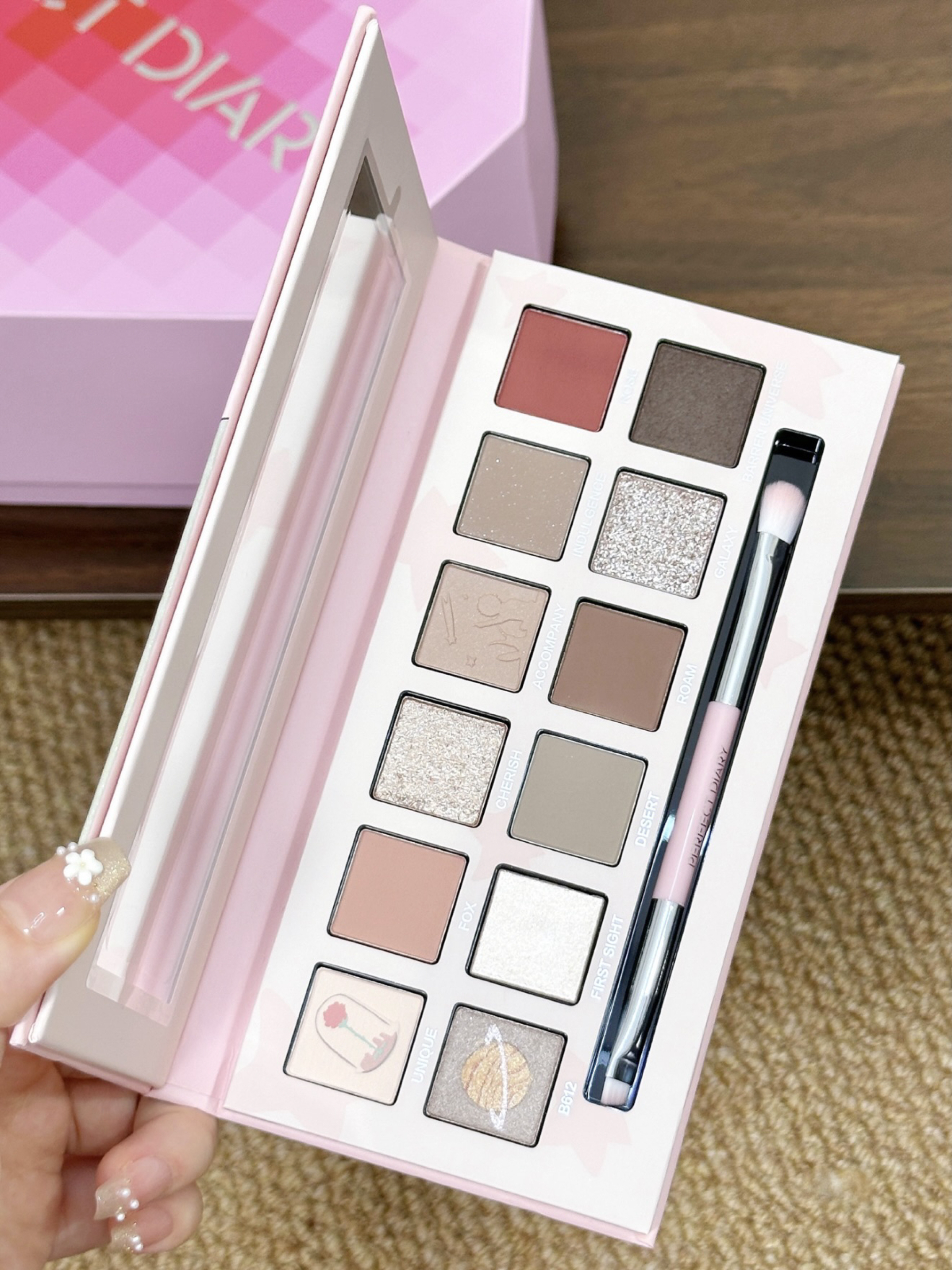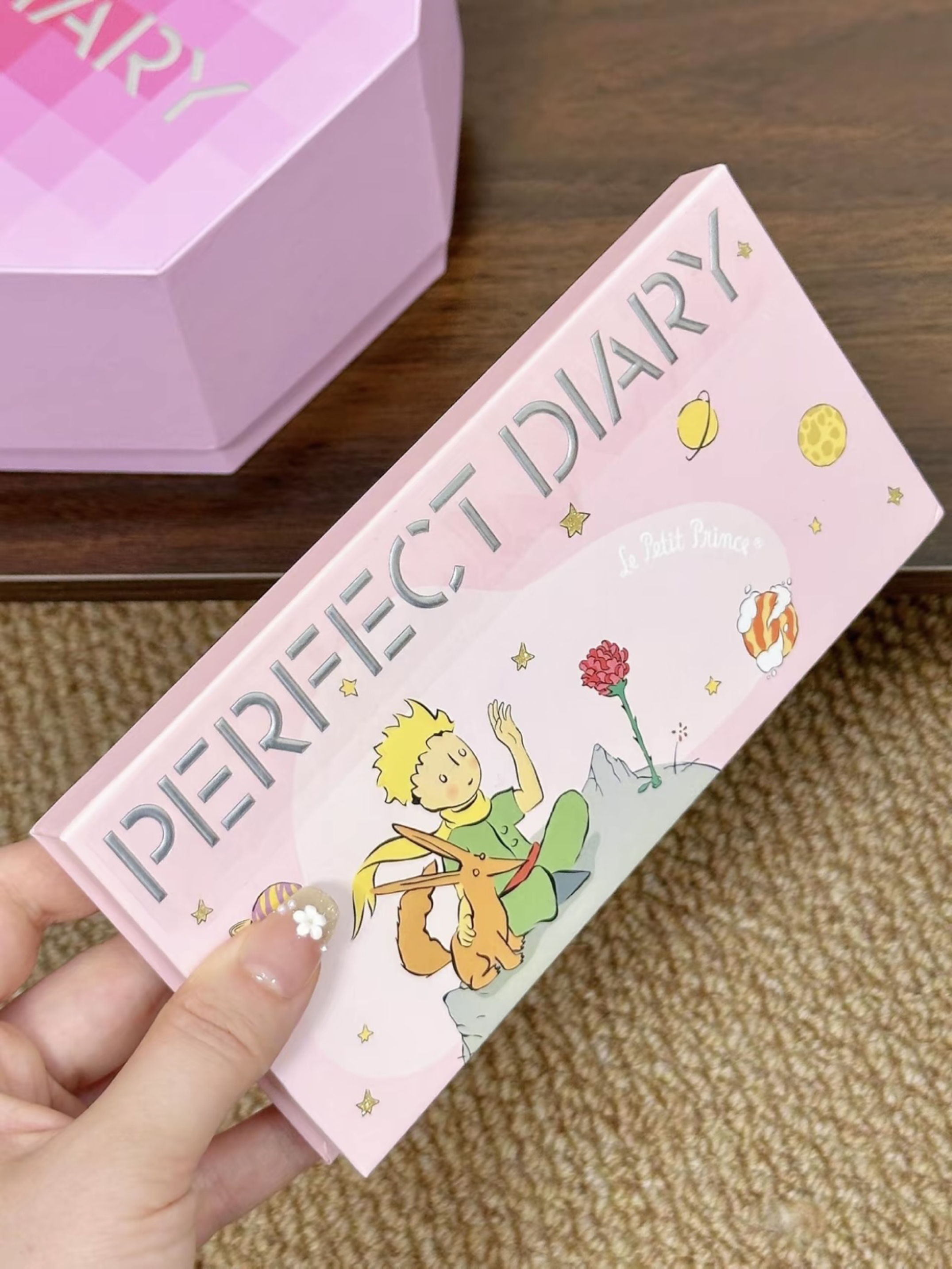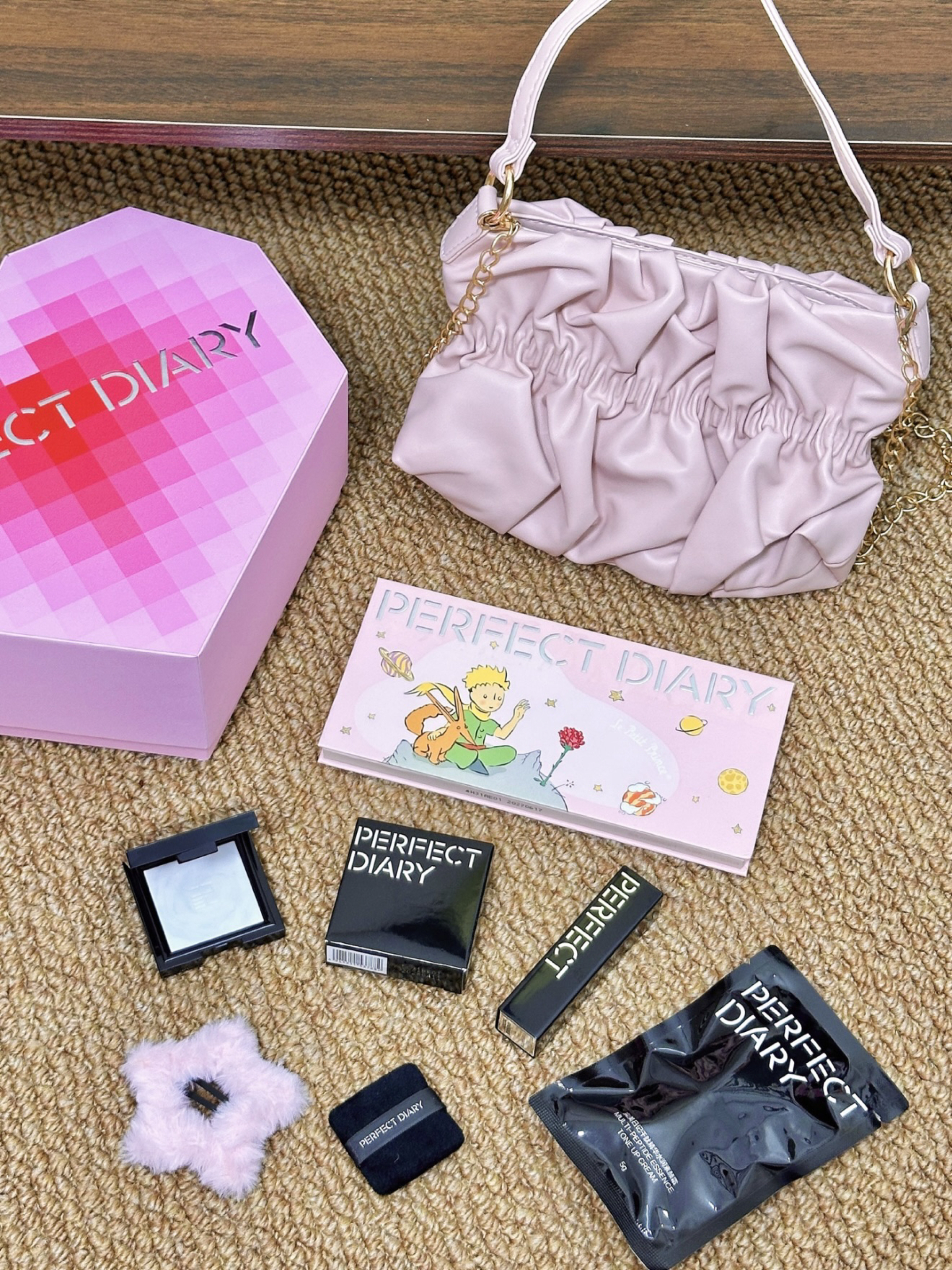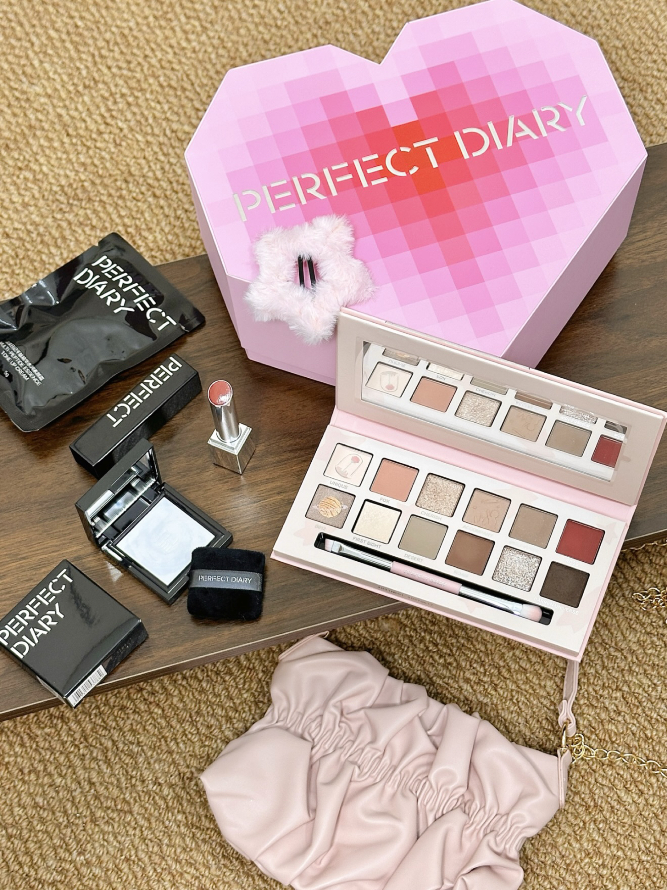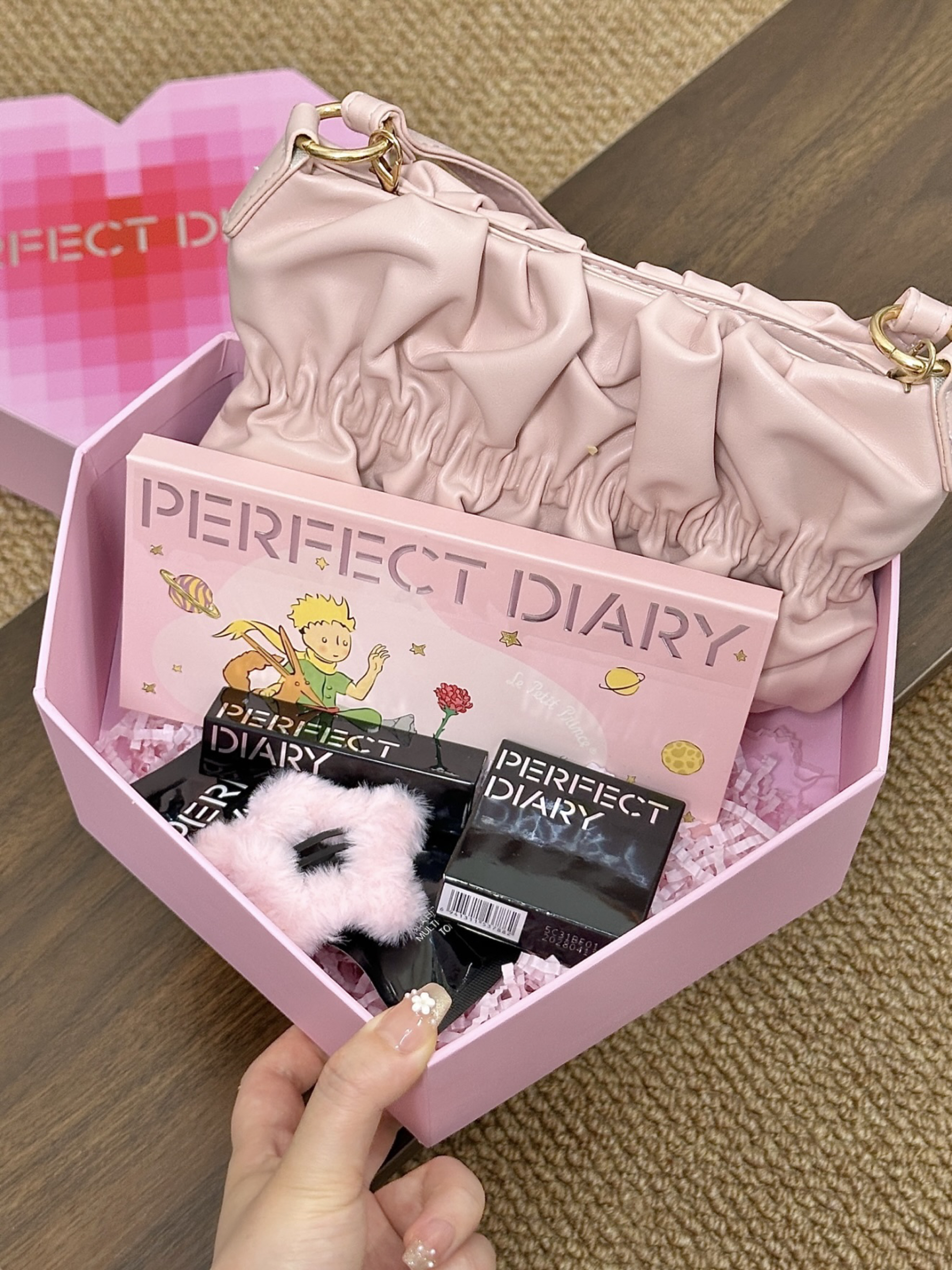 就是完美日记家的介个心动礼盒 粉色爱心形状的礼盒还蛮特别的! 打开之后里面有:小王子联名眼影盘、仿生膜口红、蜜粉饼和素颜霜 眼影盘和口红的色号都是日常百搭的那种 通勤约会涂都不会出错~ 还送了粉色发卡和包包 少女心爆棚哇