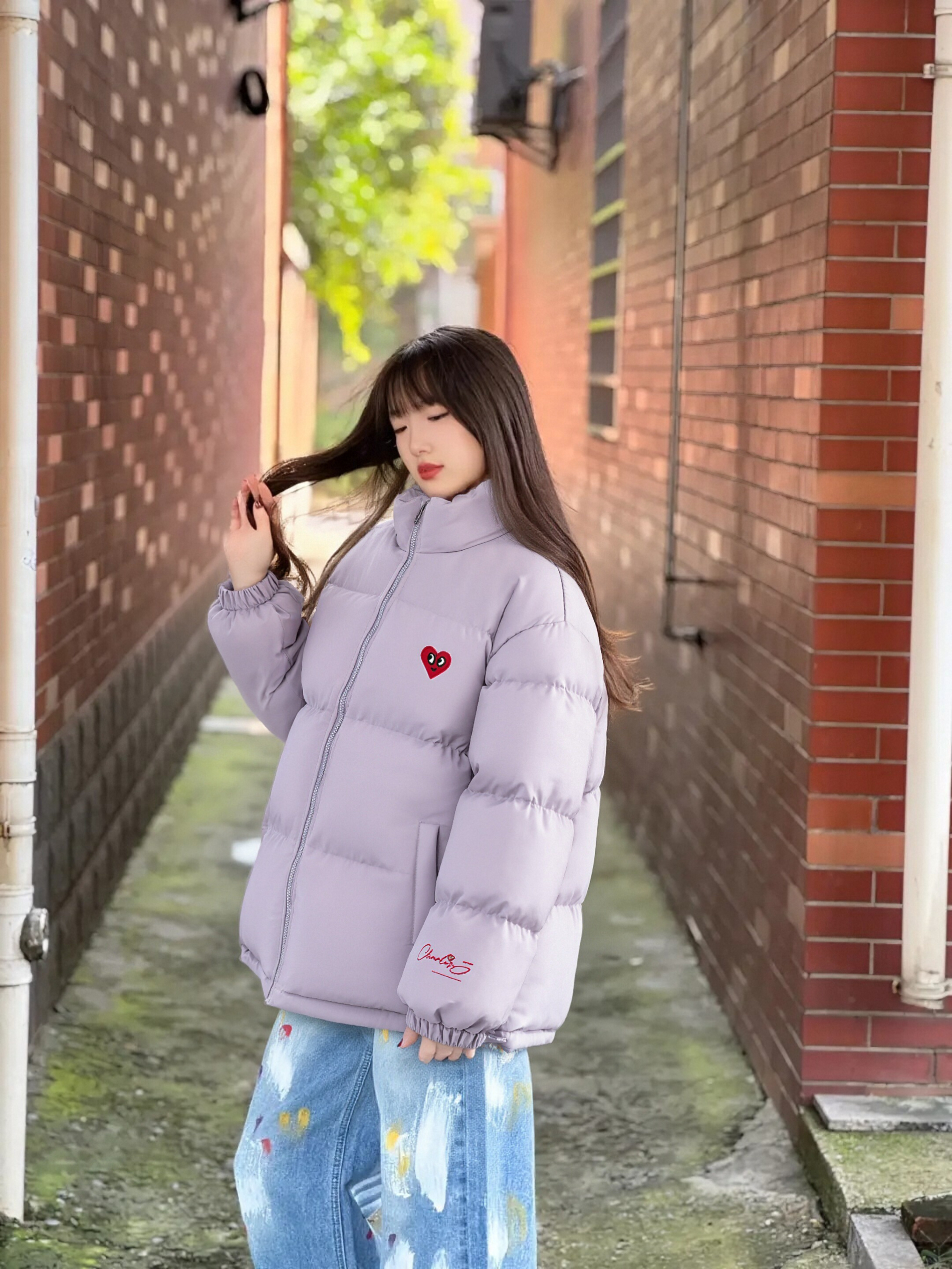 这件查尔斯桃心立领棉服外套,不仅颜色温柔,细节也是满当当~正面小桃心印花不突兀,袖口小英文 logo,抬手时不经意露出来,精致感直接拉满~