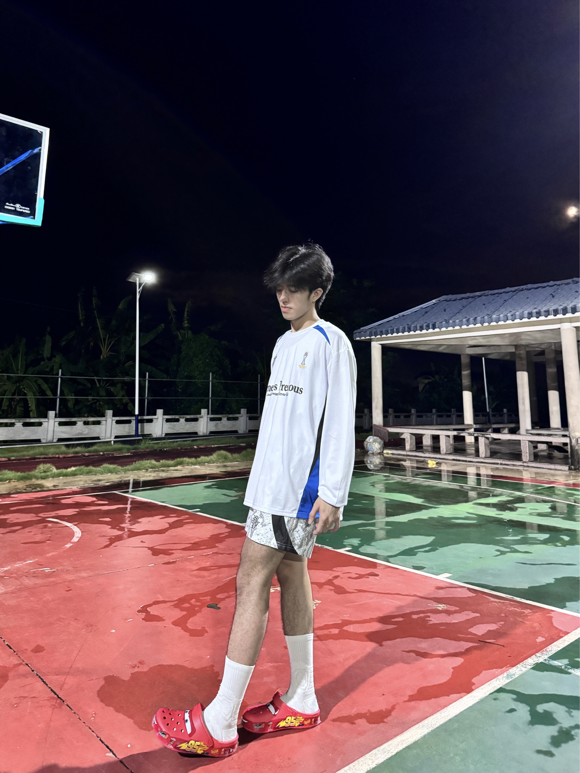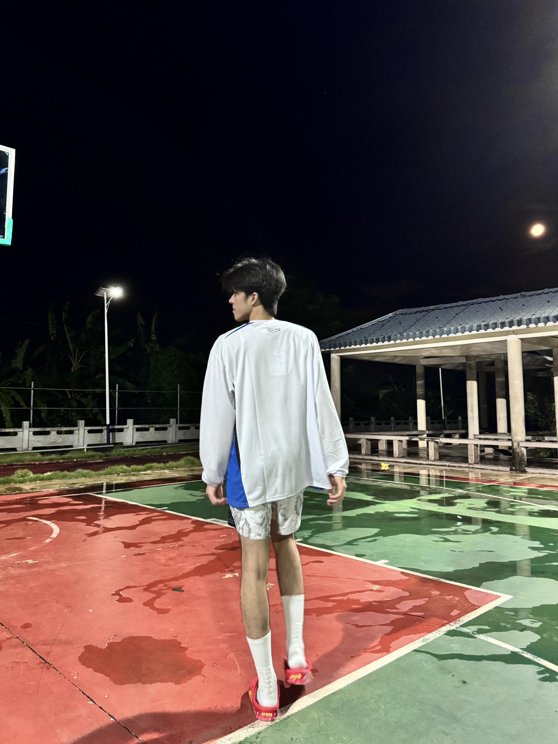 晚上下过雨,球场地上还有湿印子。我穿着平常的衣服,踩双红拖鞋就来了。没约人打球,就想在这儿站会儿。路灯亮着,周围安安静静的,只有风吹过的声音。也不用想什么,就这么和自己待着,挺舒服的。