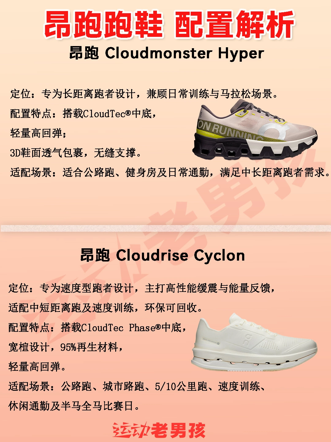 昂跑2018年进入中国市场以来,闯入跑圈并跻身“新中产三宝”阵容,跑鞋一路飙升,受欢迎程度直逼耐克、阿迪等老牌运动巨头。 昂跑的跑鞋系列丰富,覆盖竞速、缓震、稳定、越野等多个场景,主要系列及定位如下: 一、竞速跑鞋:适合进行速度训练的跑步爱好者或专业运动员,平衡性能与耐用的日常利器。 昂跑 Cloudmonster Hyper 昂跑 Cloudrise Cyclon 昂跑 Clo...