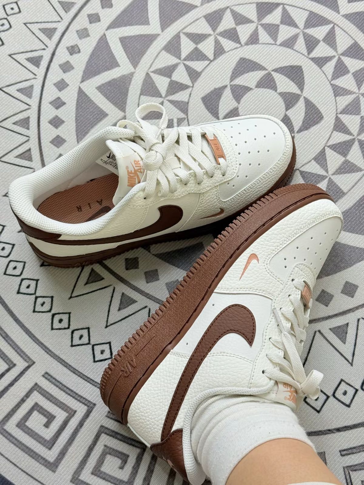 这双**Nike Air Force 1 Low米白板鞋**我穿了快半年,真的越穿越喜欢,但也不是完全没缺点,分享一下真实感受。 ▪️ **鞋型 & 材质** 经典AF1低帮版型,鞋头不会太宽,脚型偏瘦或正常的人穿都合适。鞋面是**米白色皮革**,不是那种死白,带点暖调,比纯白耐脏。深棕色的Swoosh和鞋底搭配起来很复古,比全白款特别一点。鞋舌上的“AIR”是玫瑰金色,低调但有细节。