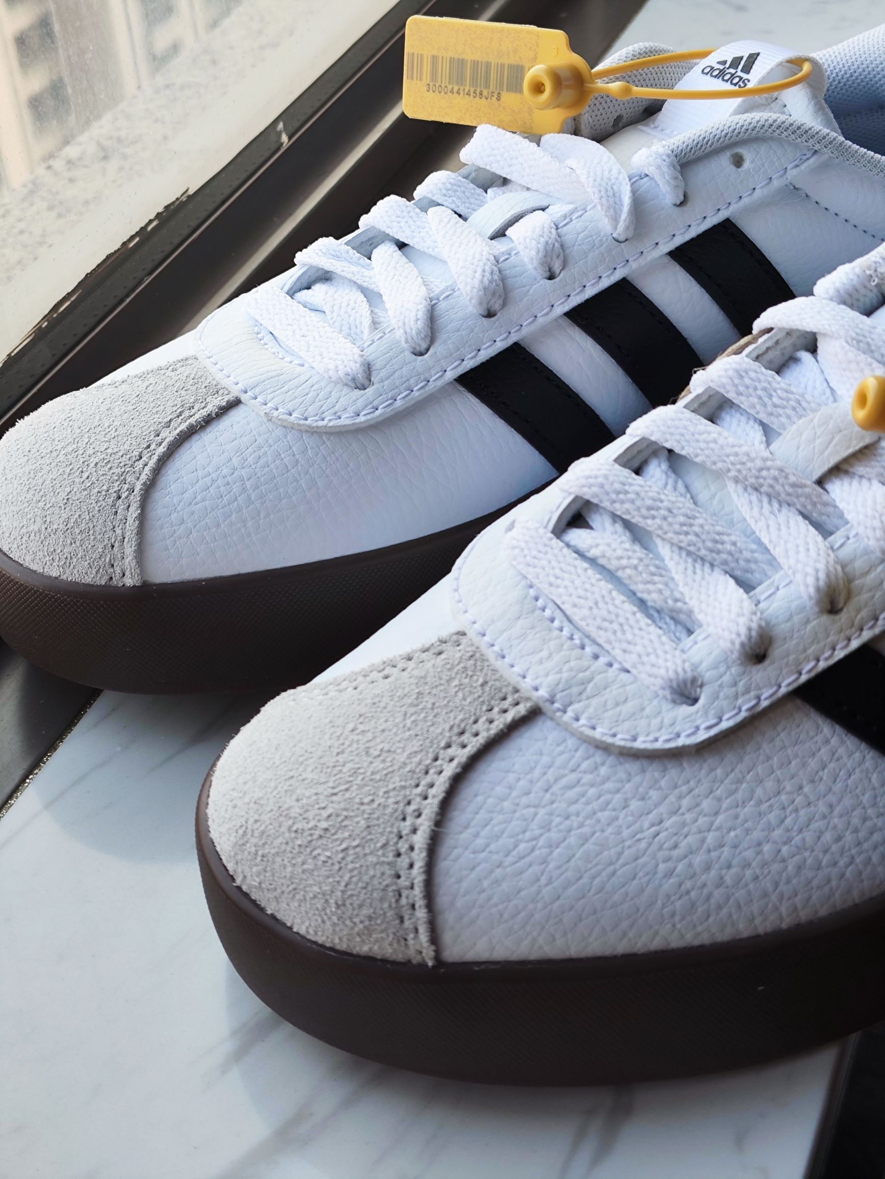 刚收到adidas VL COURT 3.0白色款,拆开快递第一眼就哇塞了!奶白+浅棕的配色也太干净了吧✨,鞋边那圈经典黑三条杠真的是灵魂,把阿迪的简约感拿捏得死死的,不花哨但越看越耐看~ 鞋面拼接设计太加分了!小部分麂皮摸起来软软糯糯的,剩下的皮革部分又很挺括,两种材质撞在一起层次感直接拉满,鞋侧和鞋舌的小logo也不突兀,低调炫身份的感觉刚刚好~ 低帮版型真的显脚踝细!我搭了条直筒牛仔...
