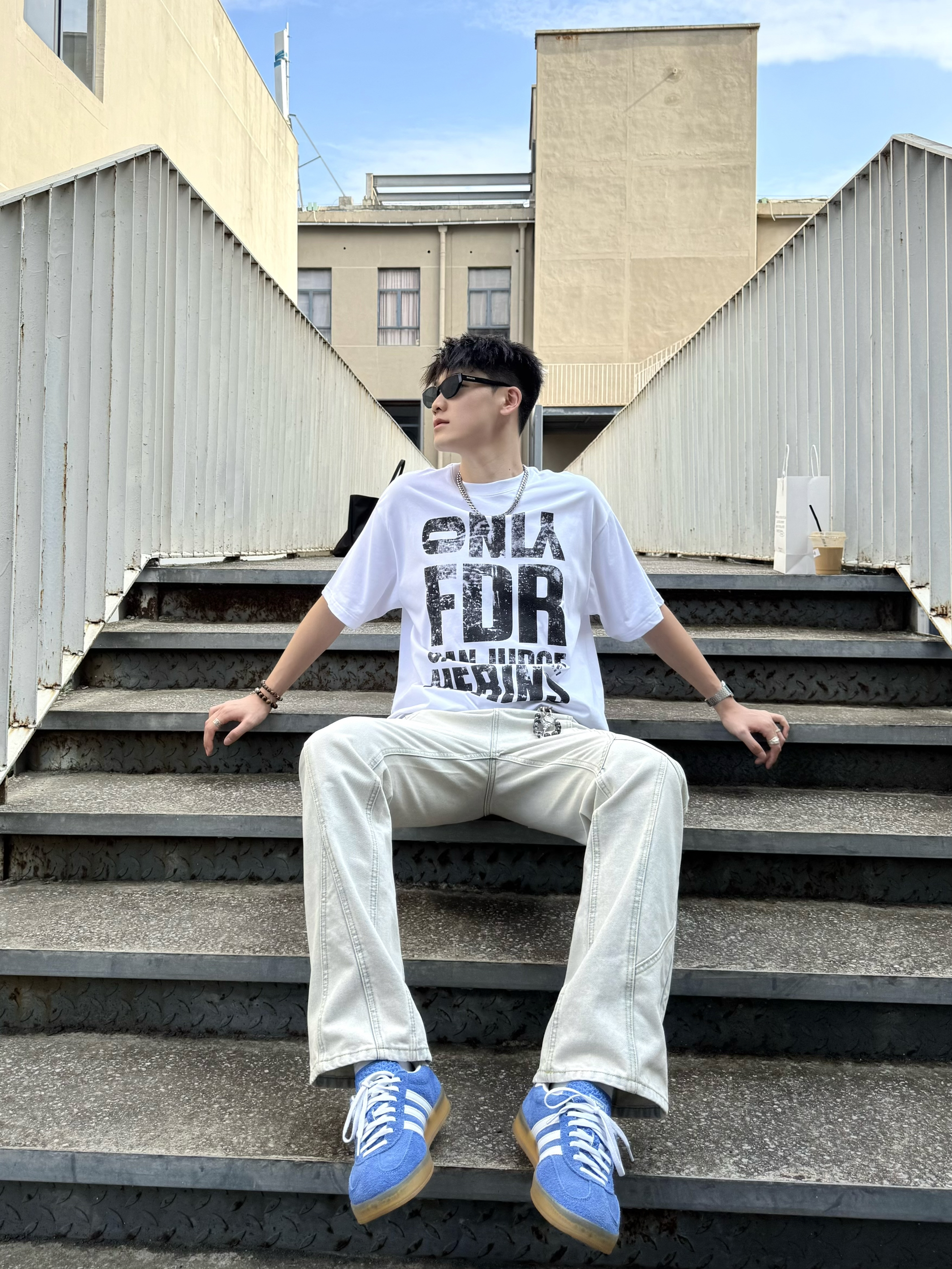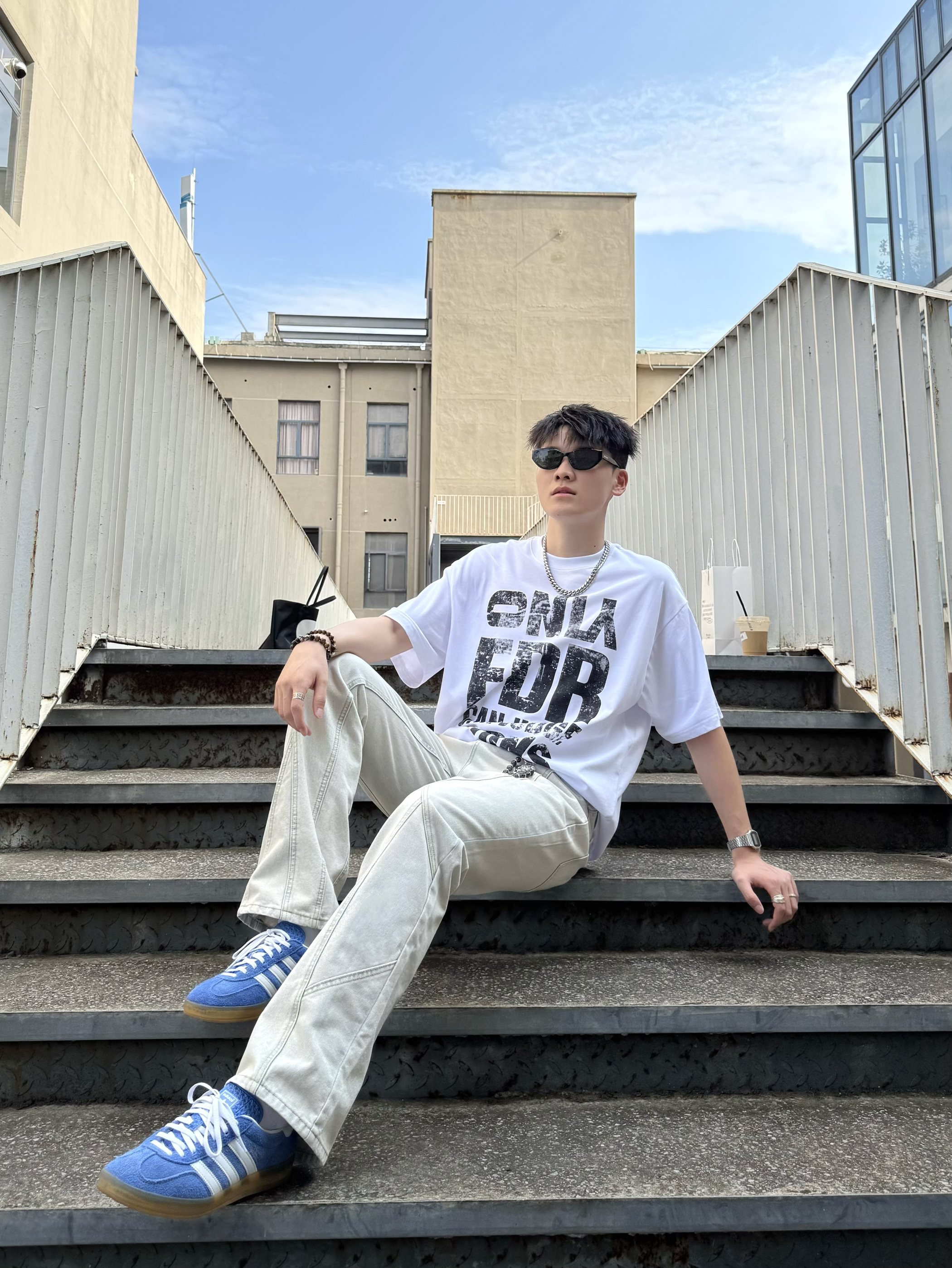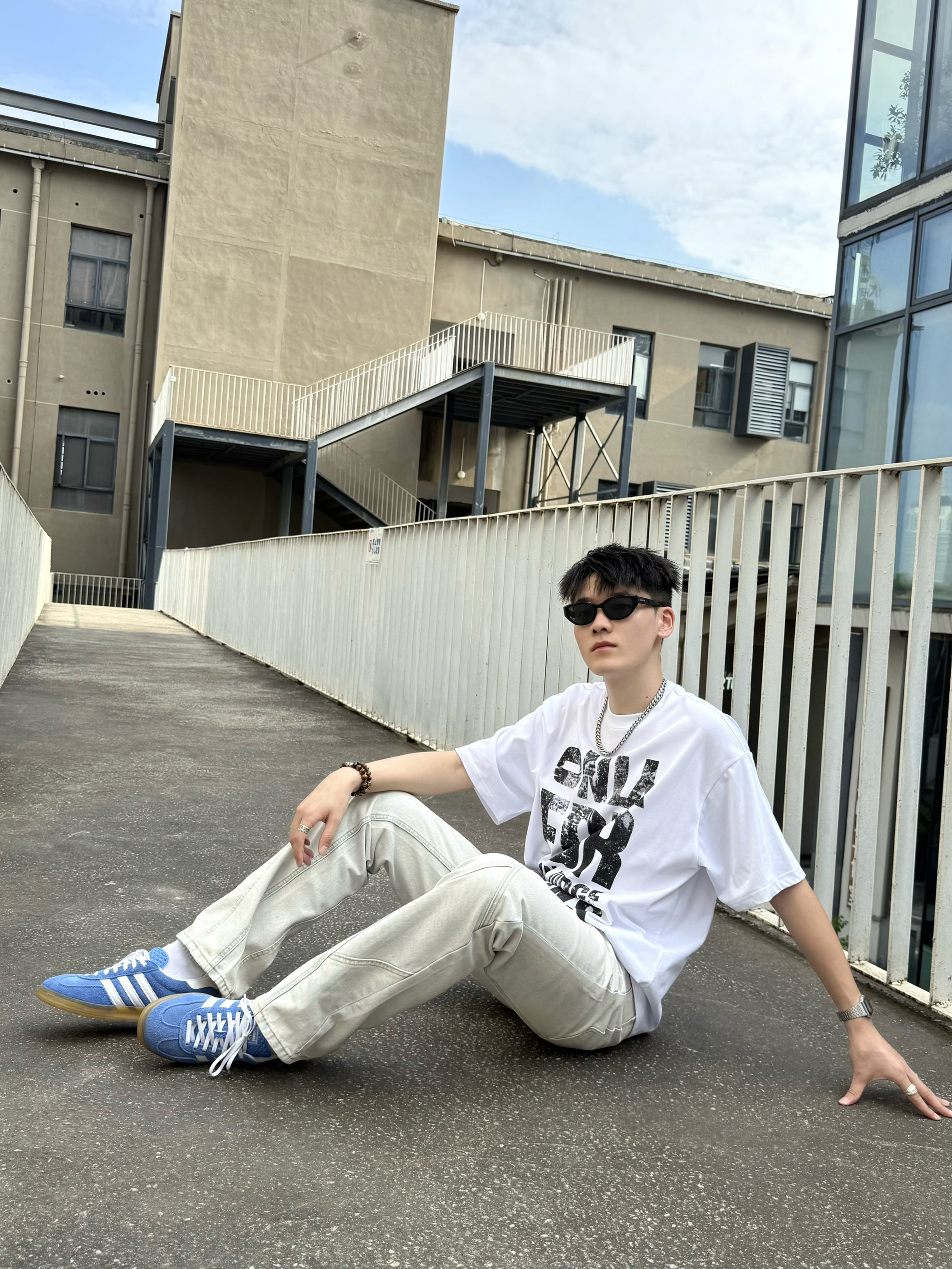 不帅的衣服我不穿! 快到国庆假期咯✔️ 假期出游穿搭准备好了嘛~ 白色T恤配泥黄色牛仔裤 可以说帅气又街头了🛹 再脚踩蓝色板鞋 舒适又时髦的存在 你就穿吧 一穿一个帅的不吱声!
