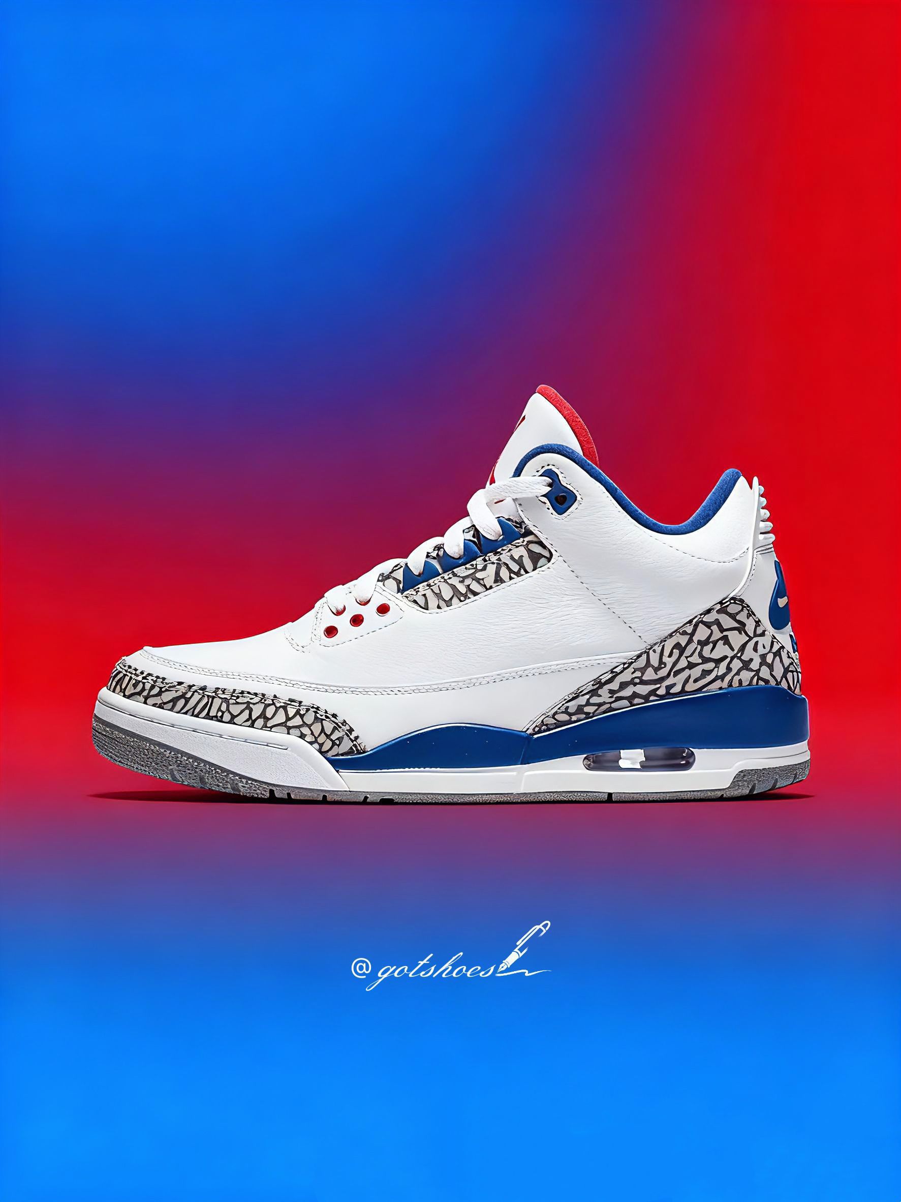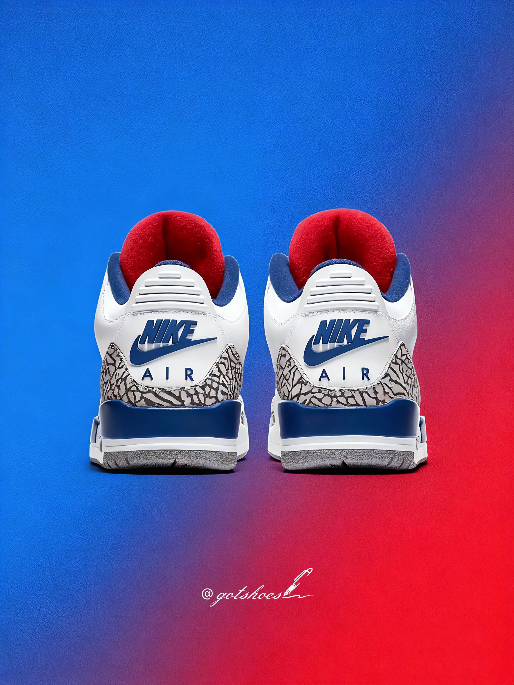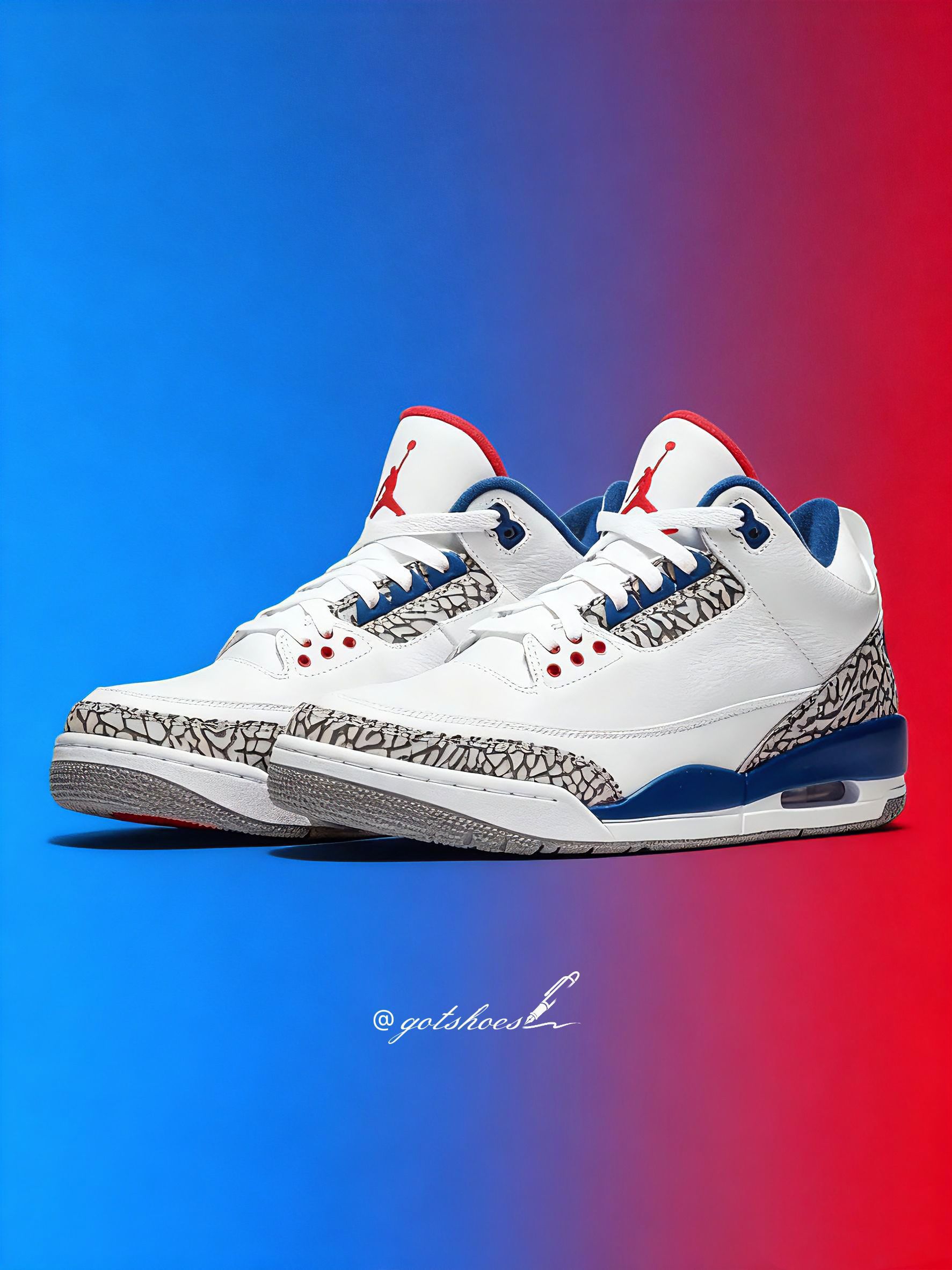 作为Air Jordan 3的元年配色之一,“True Blue”无疑是许多资深鞋迷心中的经典款式,迈克尔·乔丹本人也曾多次在比赛中穿着。据海外消息透露,这双备受瞩目的鞋款将于2026年再次复刻回归! 整双鞋采用大面积的白色皮革打造,搭配AJ3标志性的爆裂纹元素,整体造型简约却不失辨识度。中底、鞋带孔等细节处融入海军蓝配色,鞋舌上点缀红色Jumpman Logo,撞色设计格外抢眼...