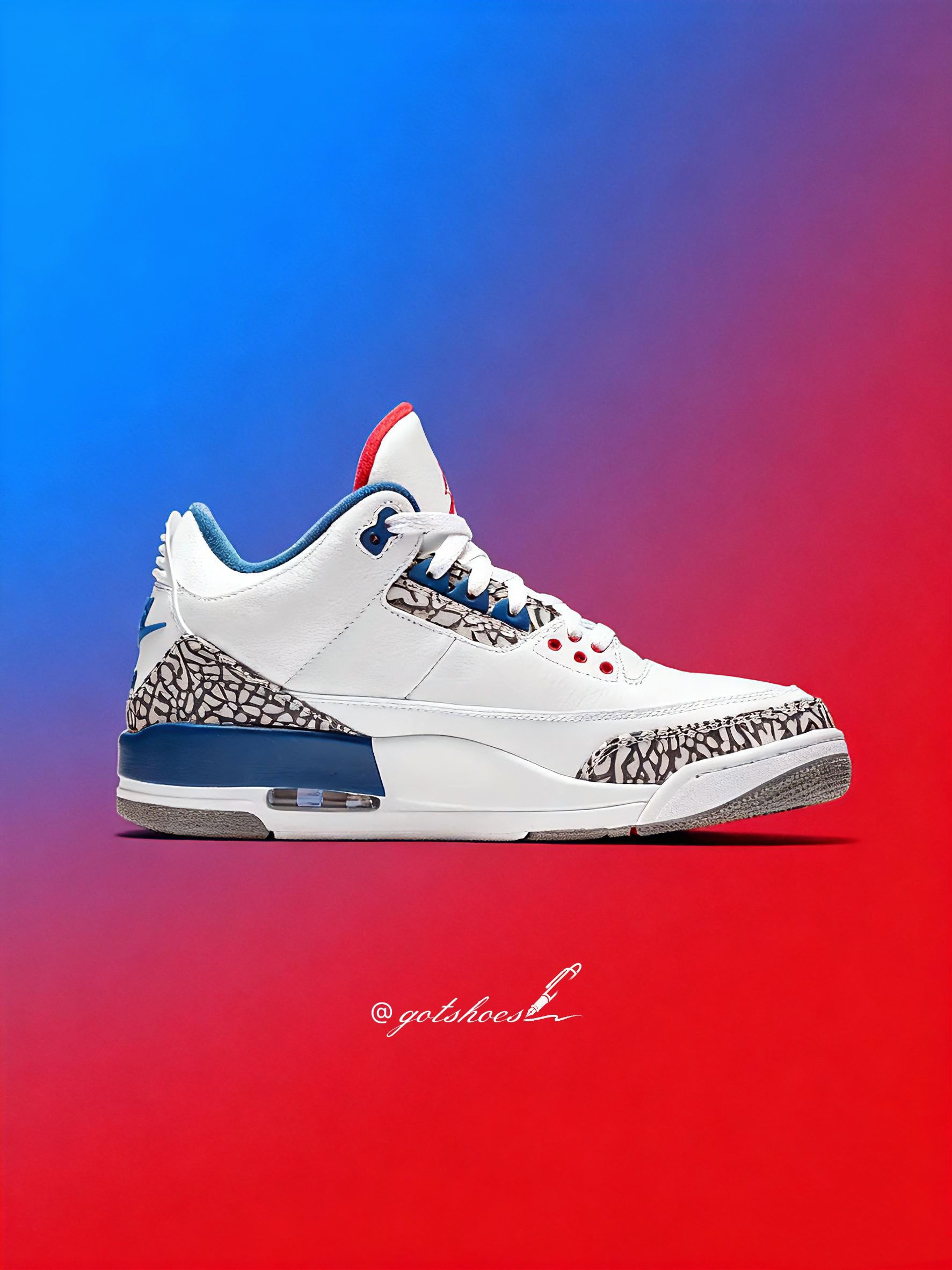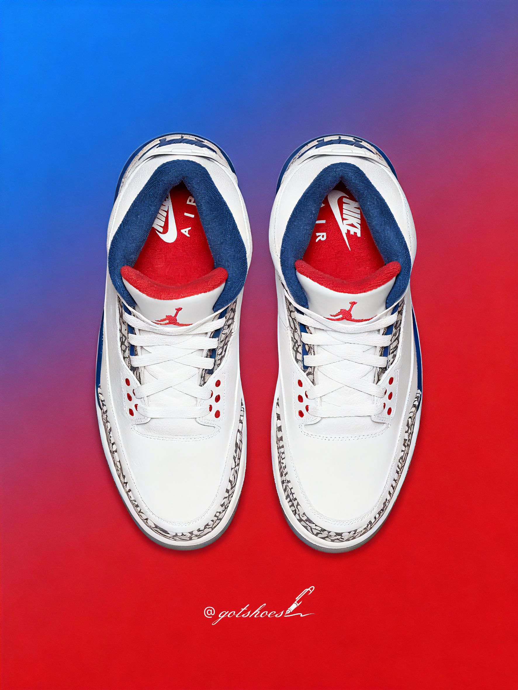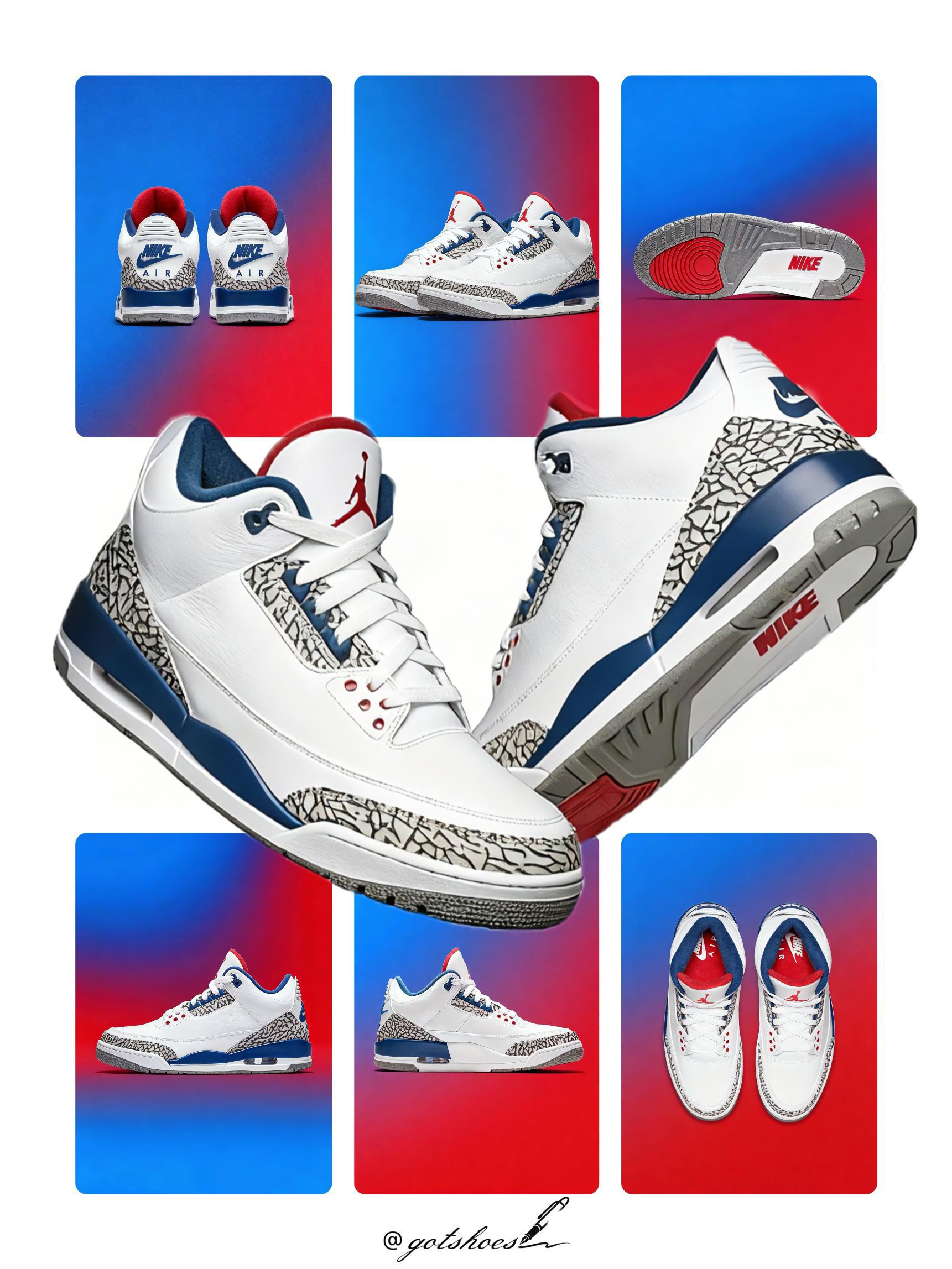 作为Air Jordan 3的元年配色之一,“True Blue”无疑是许多资深鞋迷心中的经典款式,迈克尔·乔丹本人也曾多次在比赛中穿着。据海外消息透露,这双备受瞩目的鞋款将于2026年再次复刻回归! 整双鞋采用大面积的白色皮革打造,搭配AJ3标志性的爆裂纹元素,整体造型简约却不失辨识度。中底、鞋带孔等细节处融入海军蓝配色,鞋舌上点缀红色Jumpman Logo,撞色设计格外抢眼...