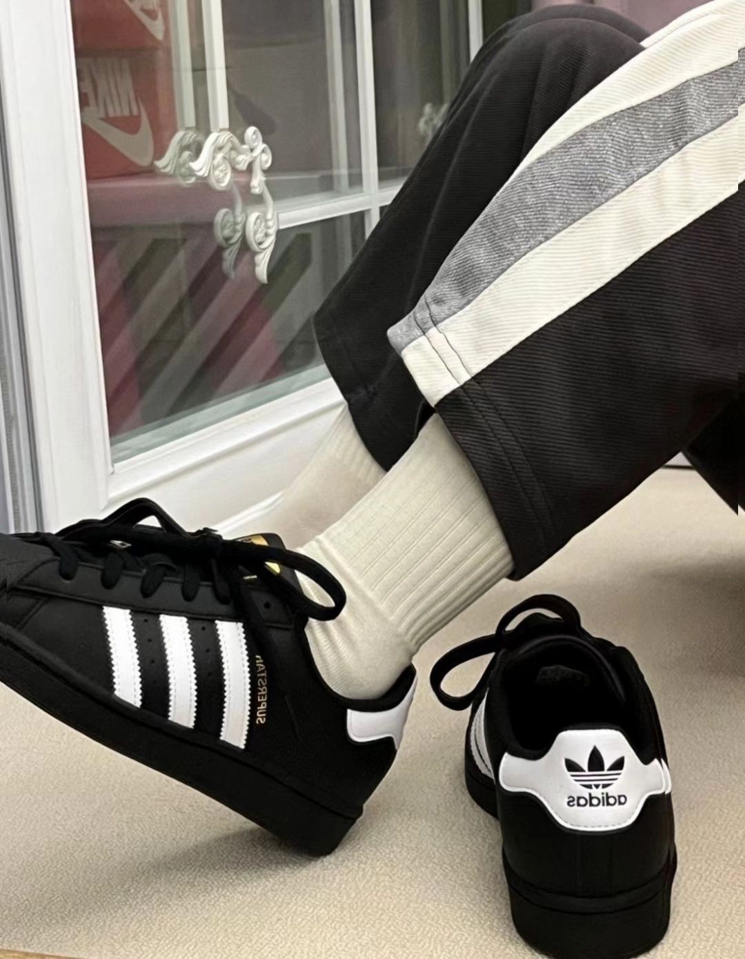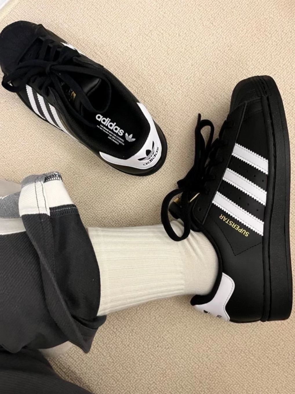这双阿迪黑武士贝壳头真的是穿搭“作弊神器”✨!经典贝壳头设计,黑白色调酷飒又百搭,不管是配牛仔裤还是运动裤,甚至搭个小裙子都很有风格,走在街上回头率绝了~ 皮质很软,穿久了也不会磨脚,日常通勤、逛街暴走都能扛,舒适度给满分💯!而且它的复古感真的很戳人,细节处的金色标和后跟三叶草logo,质感直接拉满~