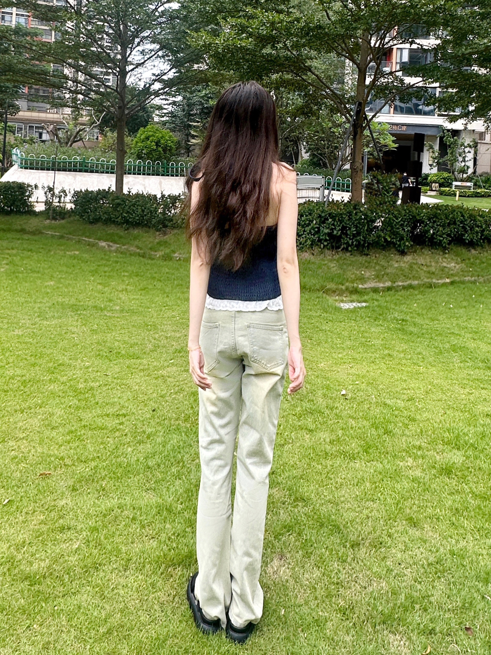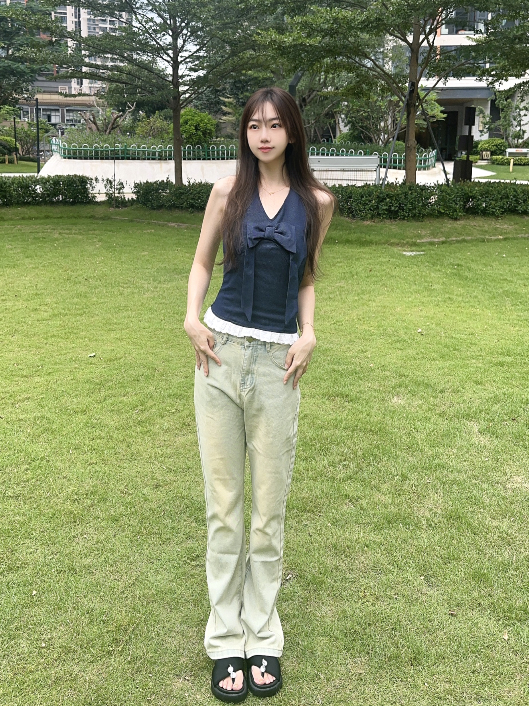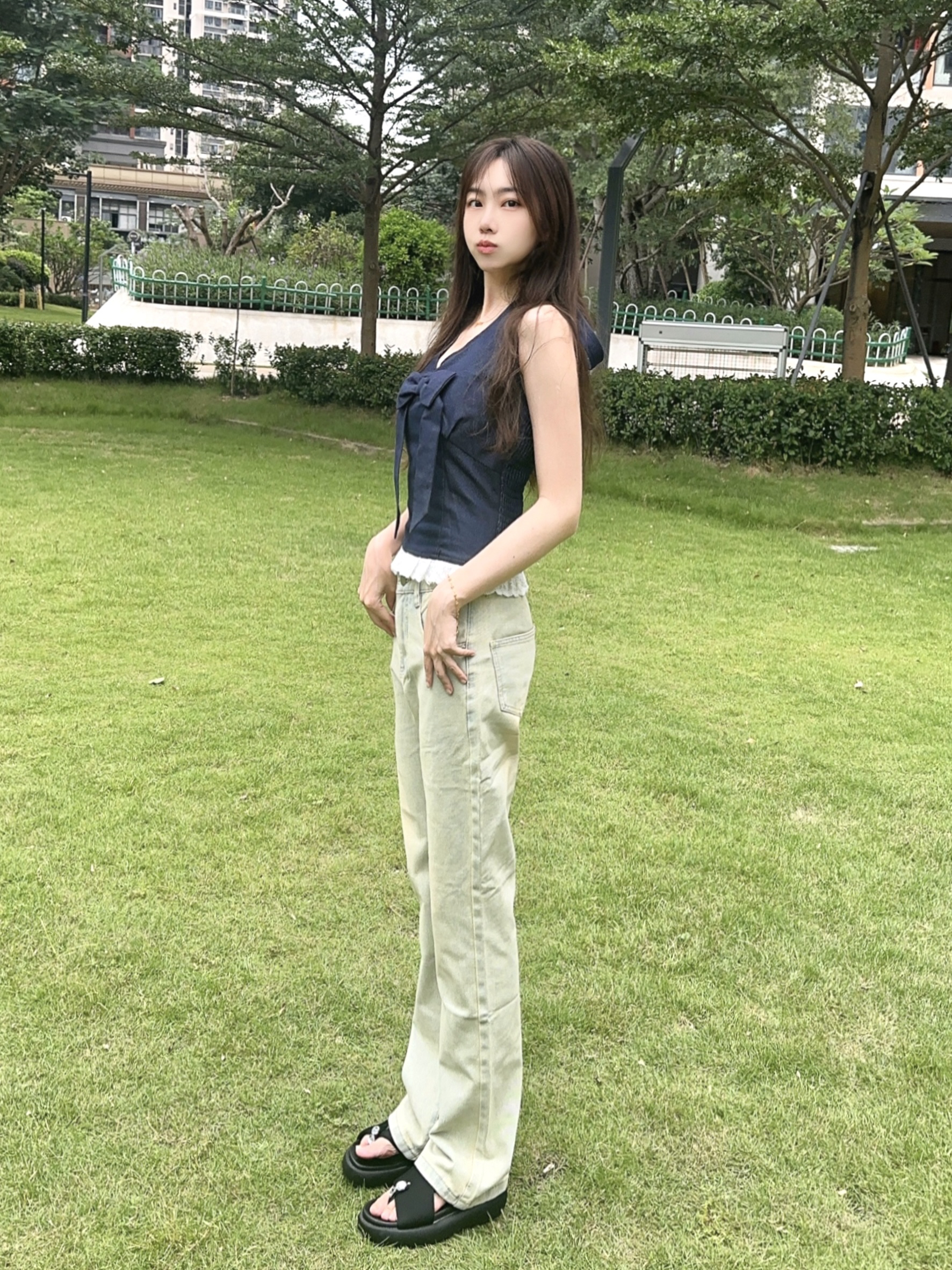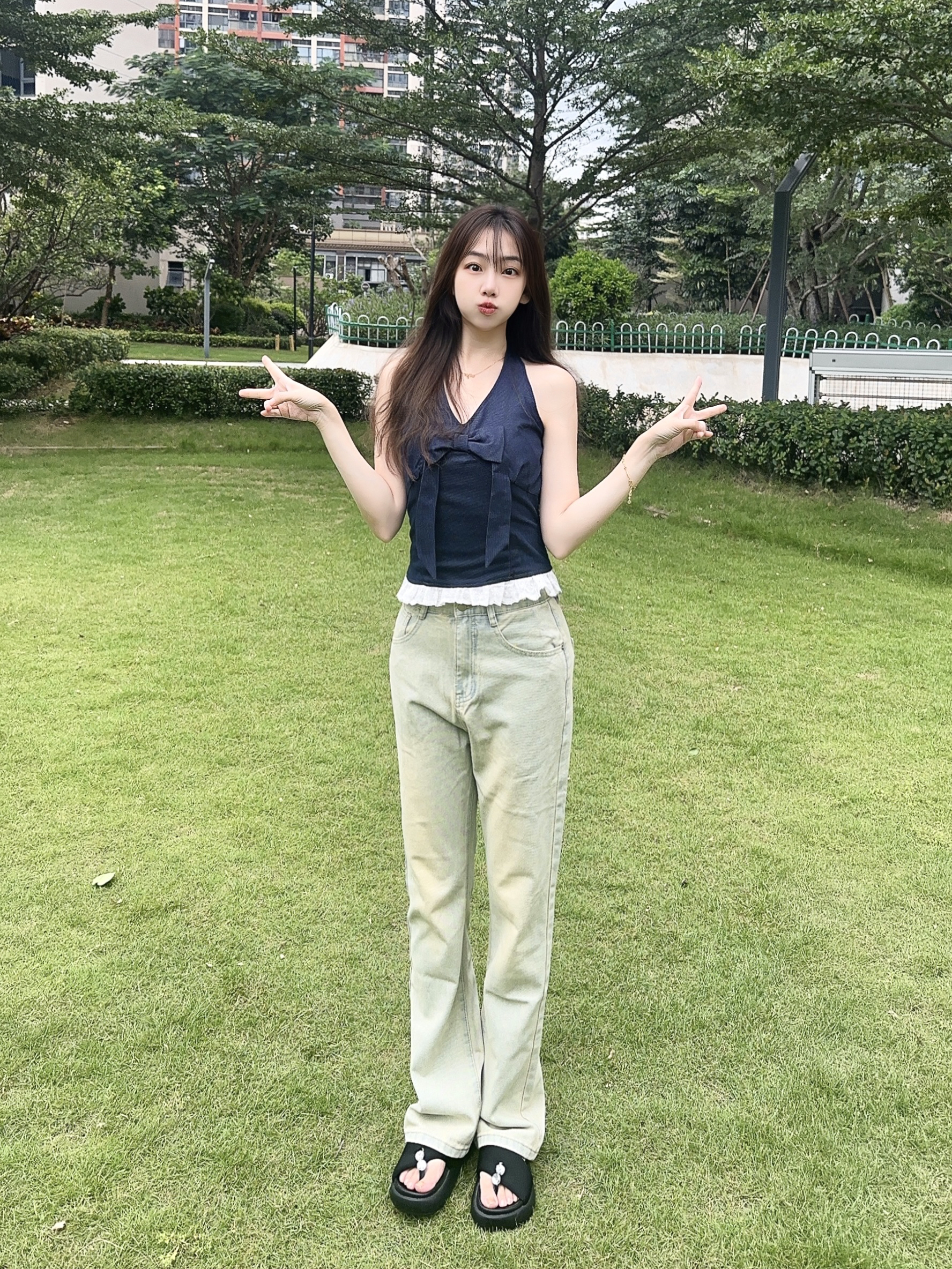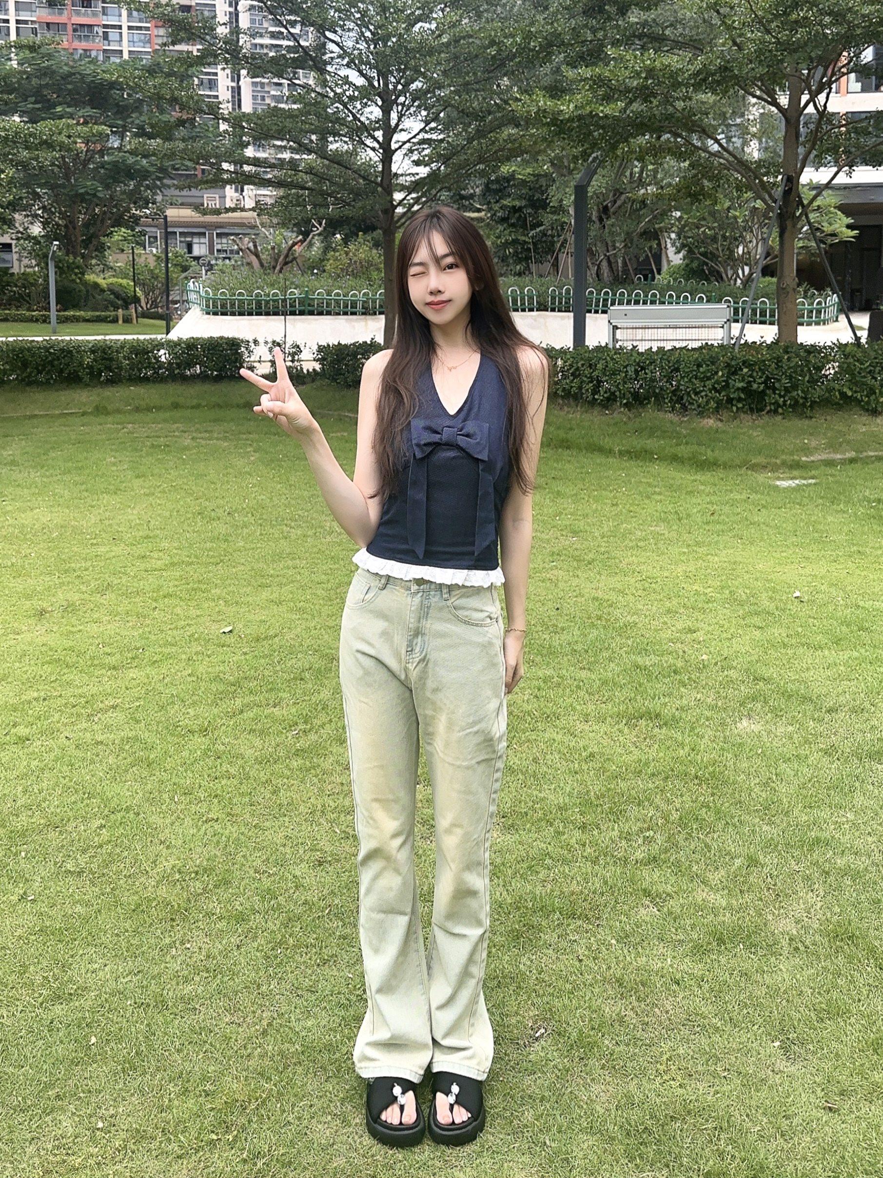 今天的这套look主打甜酷辣妹风 挂脖蝴蝶结上衣+ 黄泥色牛仔裤 这样穿蛮有松弛感的,不费力的时尚 黄泥色牛仔裤很有美式复古的风格 微喇设计显得腿又长又细的~🫢