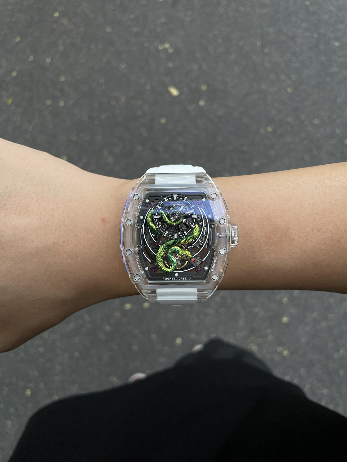 我给对象挑的这块表,说是小年轻第一块轻奢款没毛病~配色真的帅,夜光、镂空设计很有个性,机械自动上链也方便!不过表带是硅胶的,夏天戴透气但质感上没有皮质那么高级。平时他运动、休闲搭这块都很潮,送男友当礼物超合适滴🥳!
