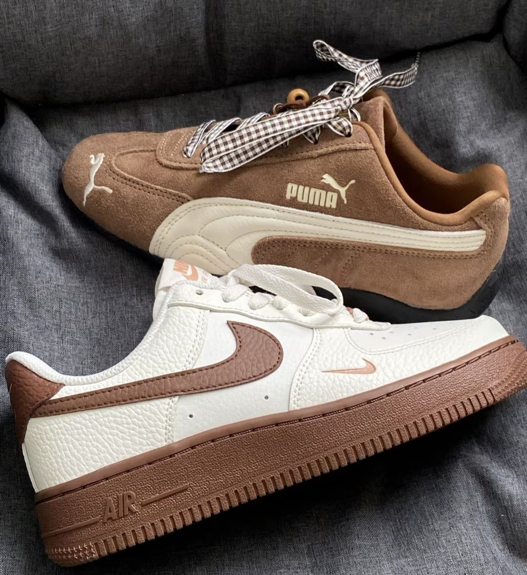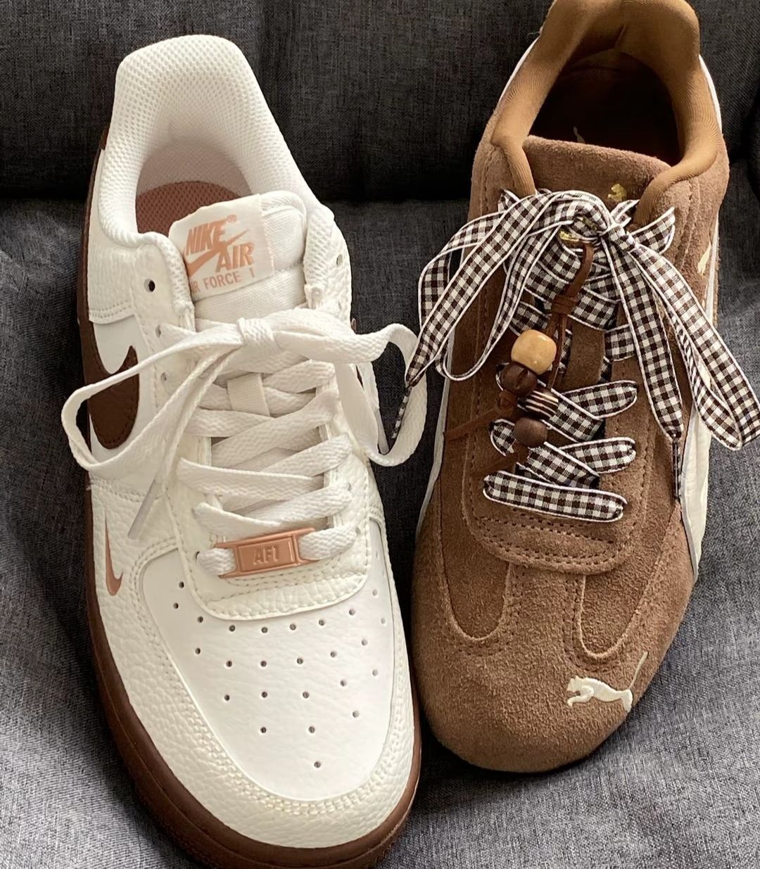 先说说这双Nike Air Force 1,配色是那种奶咖+深棕的组合,搭牛仔裤、卡其裤都挺和谐👖。上脚包裹感还可以,不过有个小缺点,刚穿那两天,鞋舌有点磨脚踝,得穿厚点的袜子过渡一下。日常走路是舒服的,但要是长时间逛街,会觉得有点沉,脚底板会有点累。 另一双Puma的,棕白撞色挺复古的。它比AF1轻一些,走路更轻快,但鞋型偏窄,脚宽的朋友可能会觉得挤脚🦶,我穿久了脚趾有点闷。 还有那双棕褐拼色的...