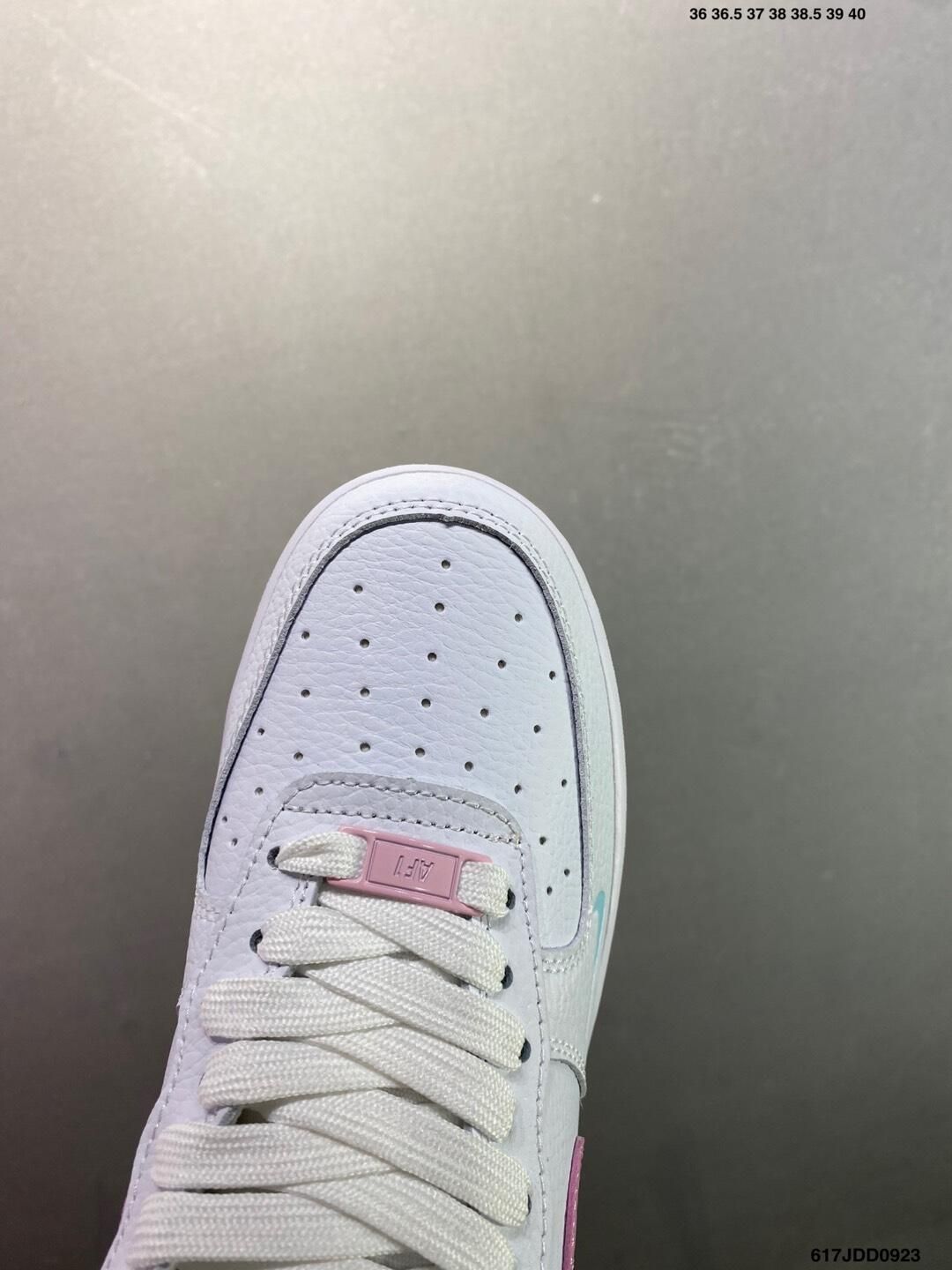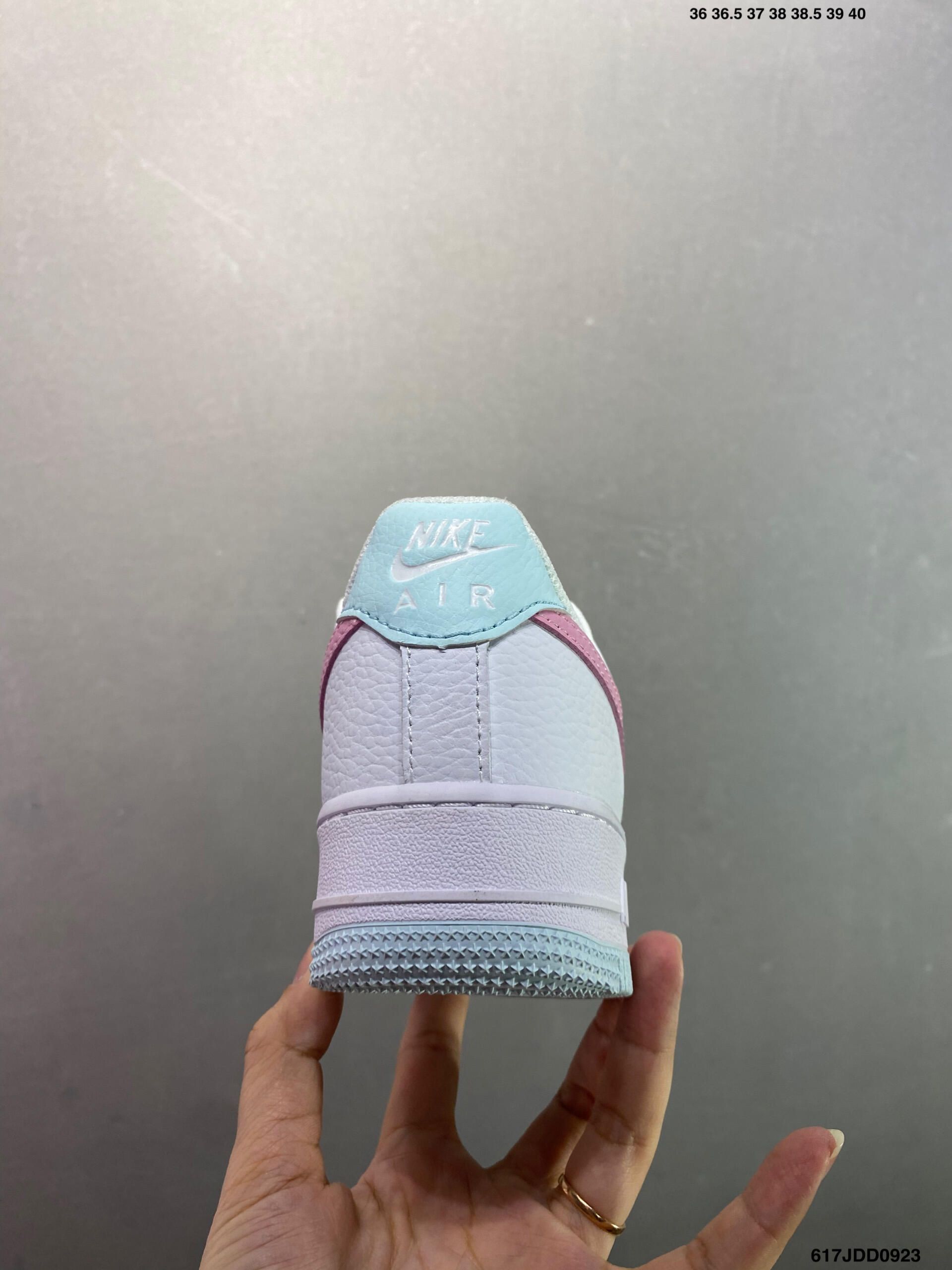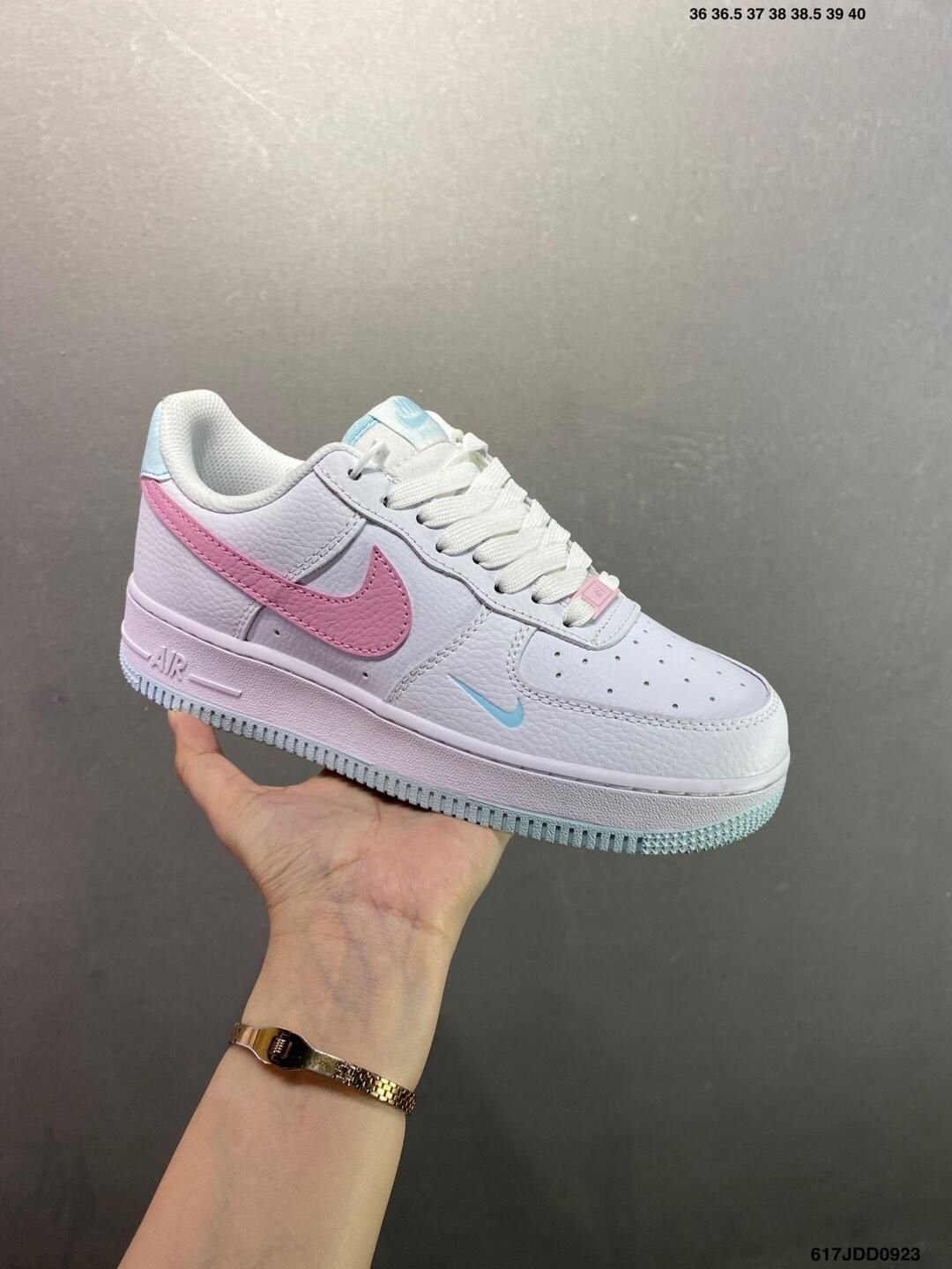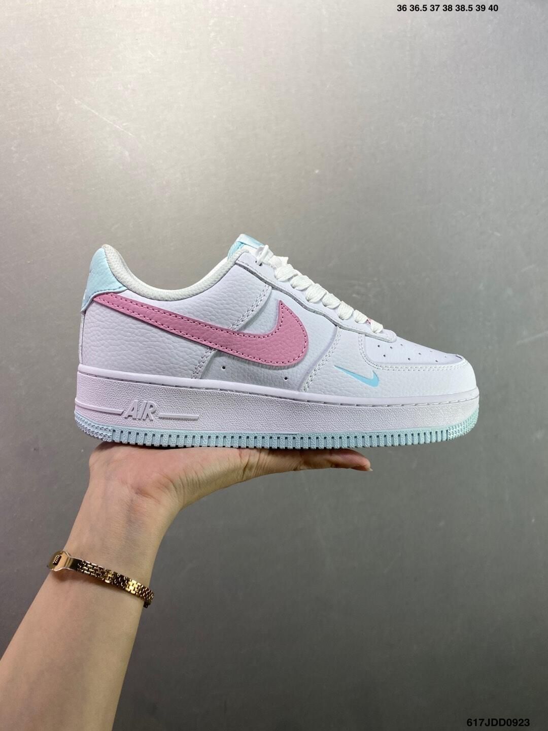 Nike Air Force 1以白为基底,搭配粉、浅蓝马卡龙色调,皮革鞋面质感细腻。粉色Swoosh与浅蓝细节点缀其间,外底渐变浅蓝清新雅致,“AIR”标识经典醒目。整体风格甜美柔和,尺码覆盖女鞋主流区间,是日常穿搭中打造少女感、适配多种风格的潮流选择,颜值与实穿性兼具。