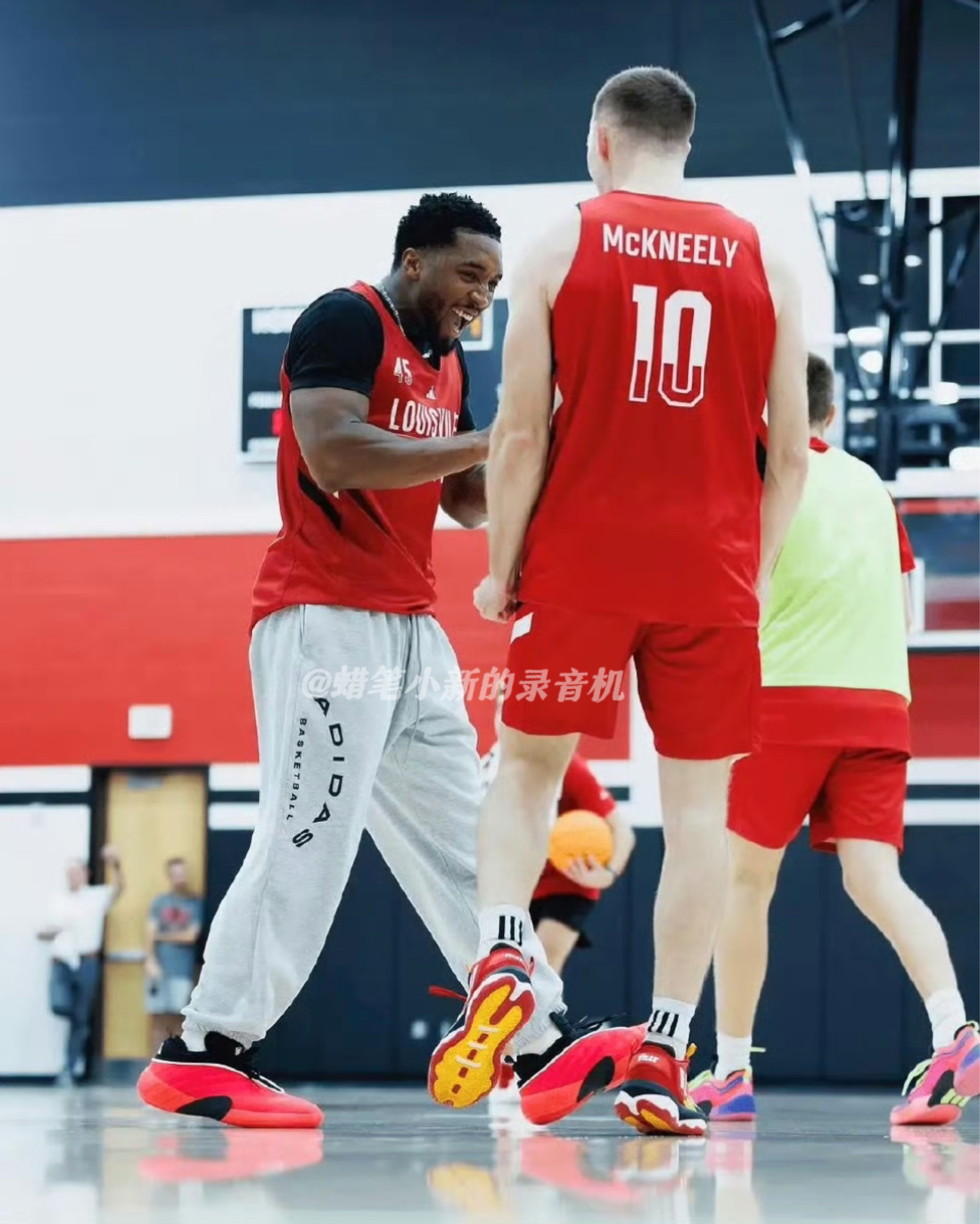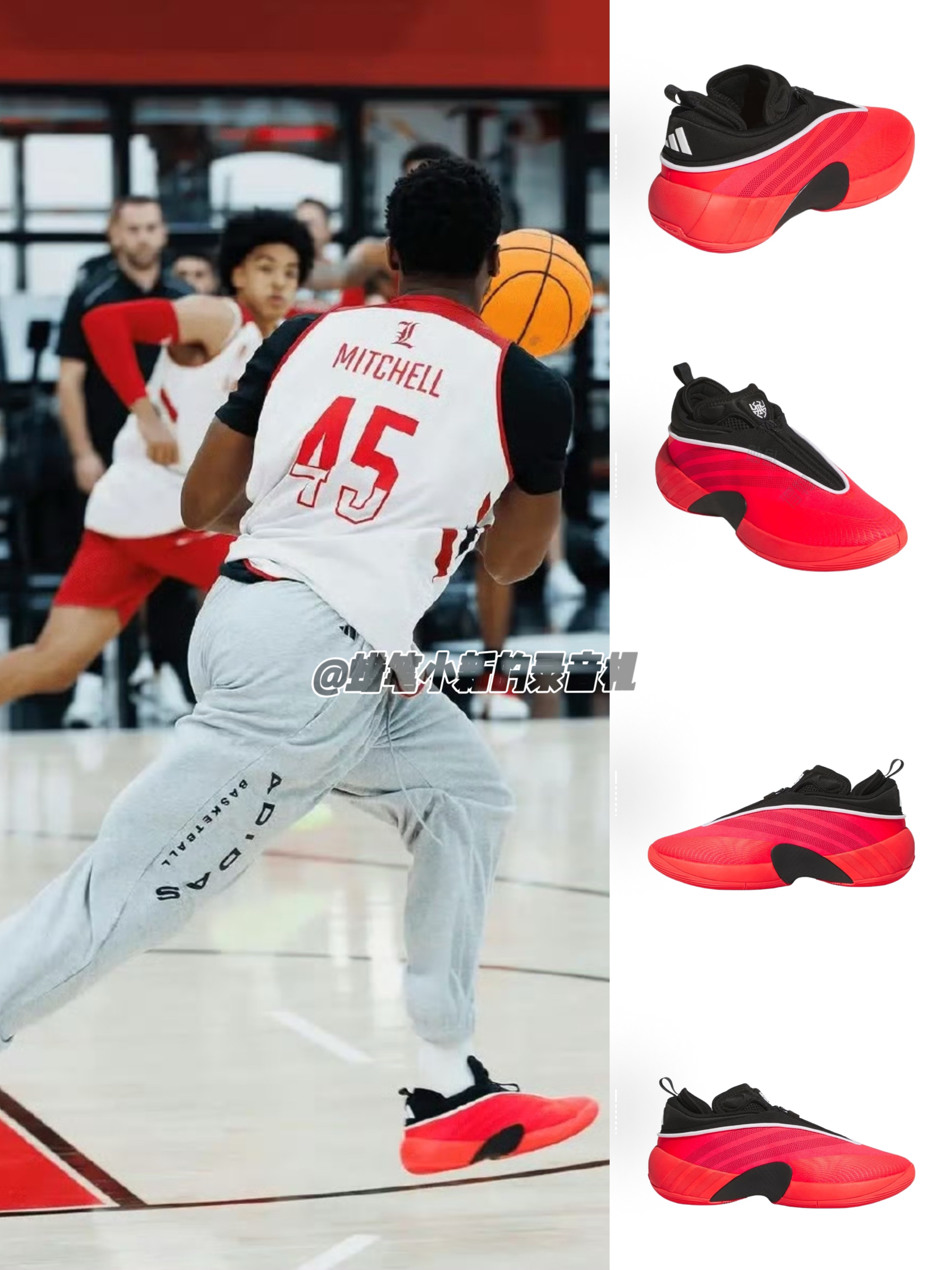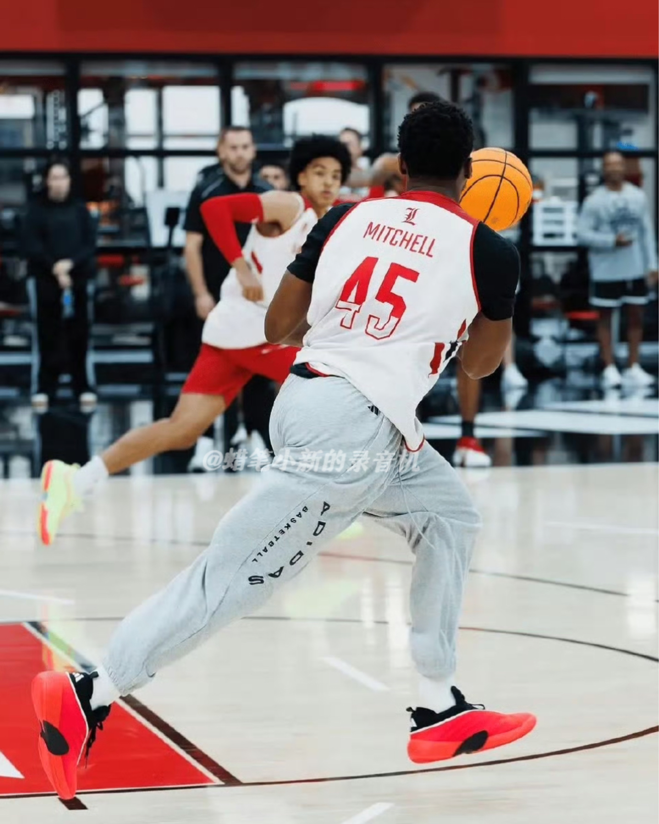 今日NBA球星资讯!人型蜘蛛侠、克利夫兰新星、71分先生,多诺万米切尔!近期他回到路易斯维尔大学红雀队与自己的学弟们一同训练!训练中的他,上脚了一双最新配色的DON.7“路易斯维尔红雀配色,搭配上他大学鲜红色的训练服与球馆地板,太帅了!
