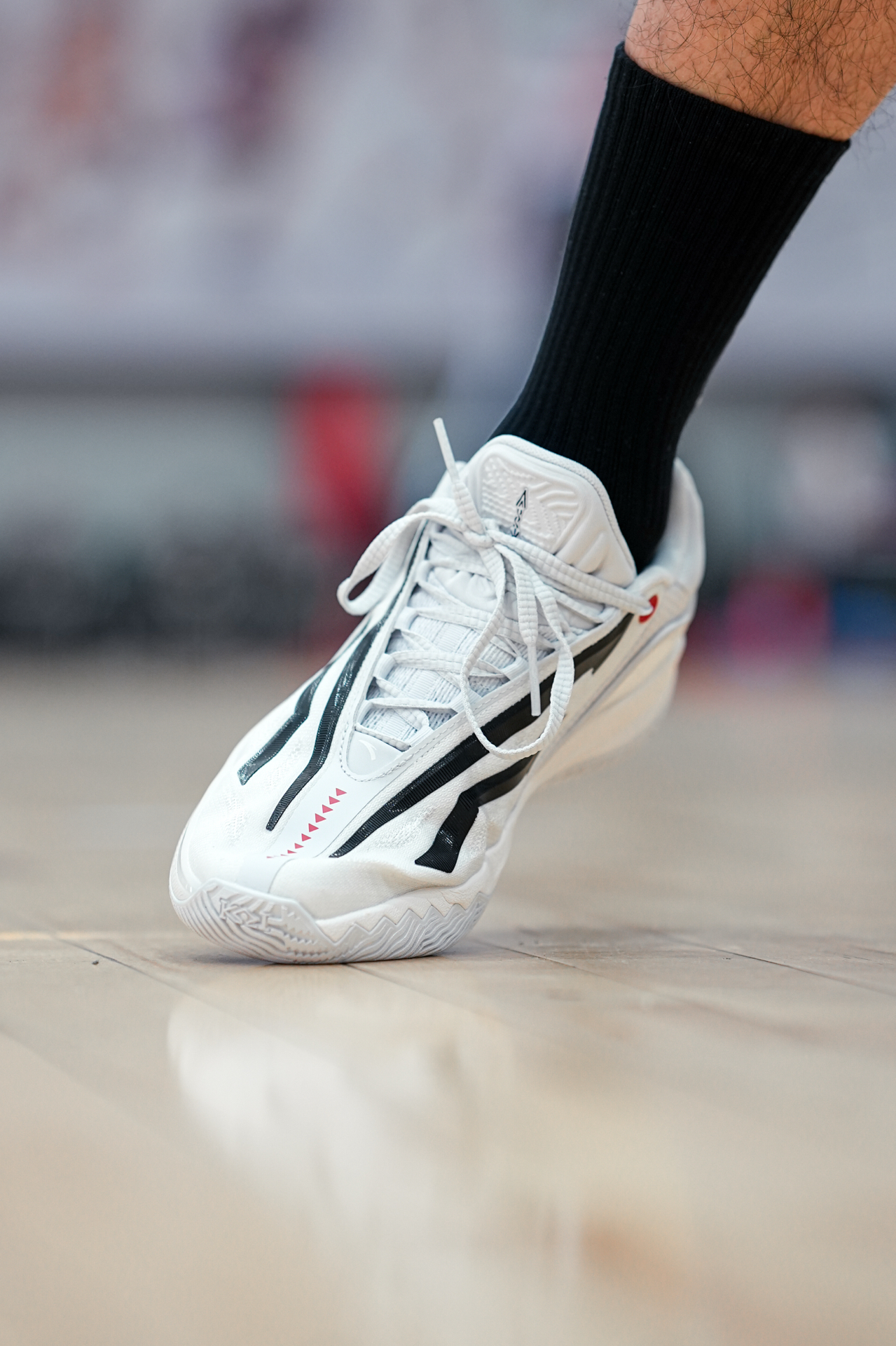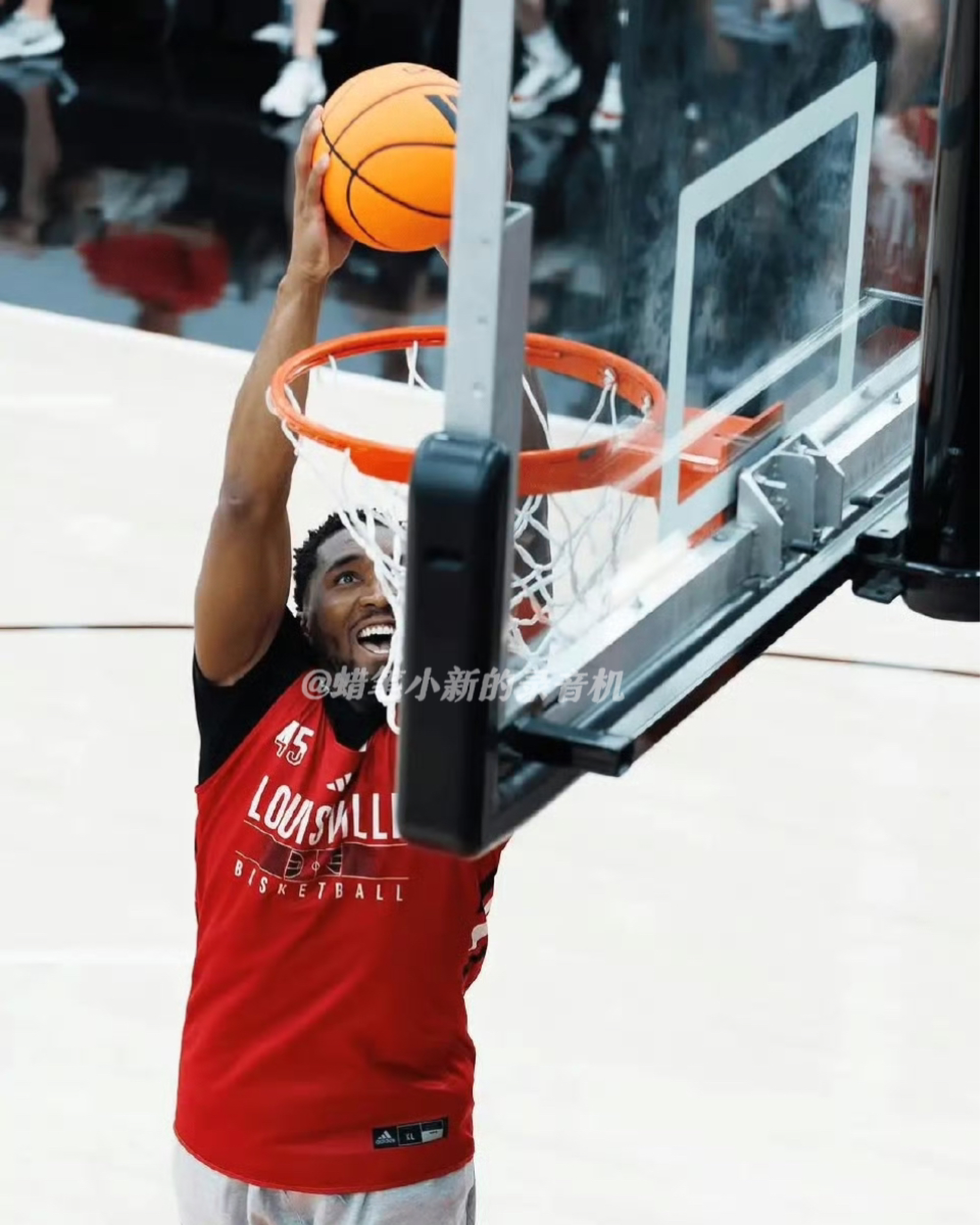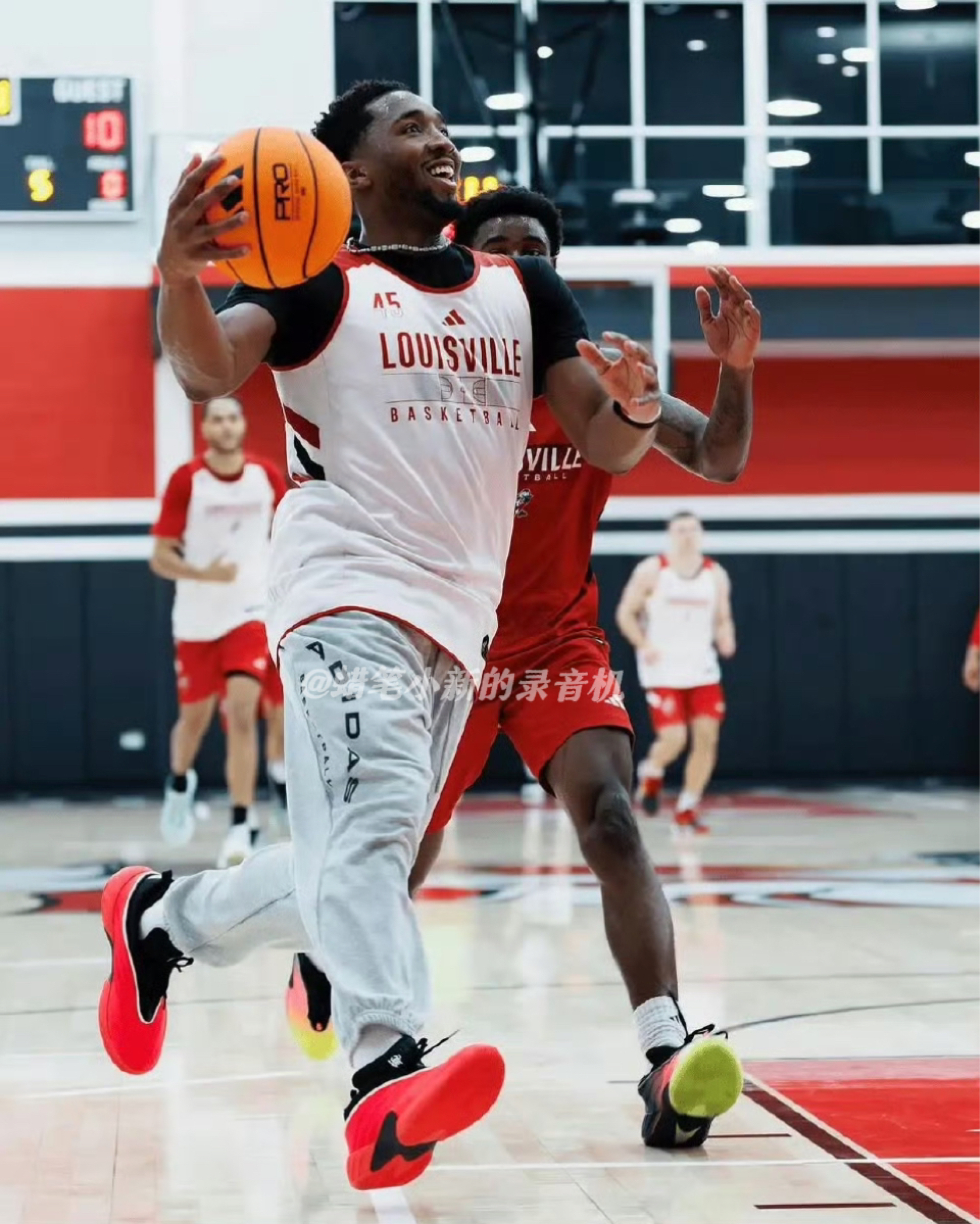 今日NBA球星资讯!人型蜘蛛侠、克利夫兰新星、71分先生,多诺万米切尔!近期他回到路易斯维尔大学红雀队与自己的学弟们一同训练!训练中的他,上脚了一双最新配色的DON.7“路易斯维尔红雀配色,搭配上他大学鲜红色的训练服与球馆地板,太帅了!