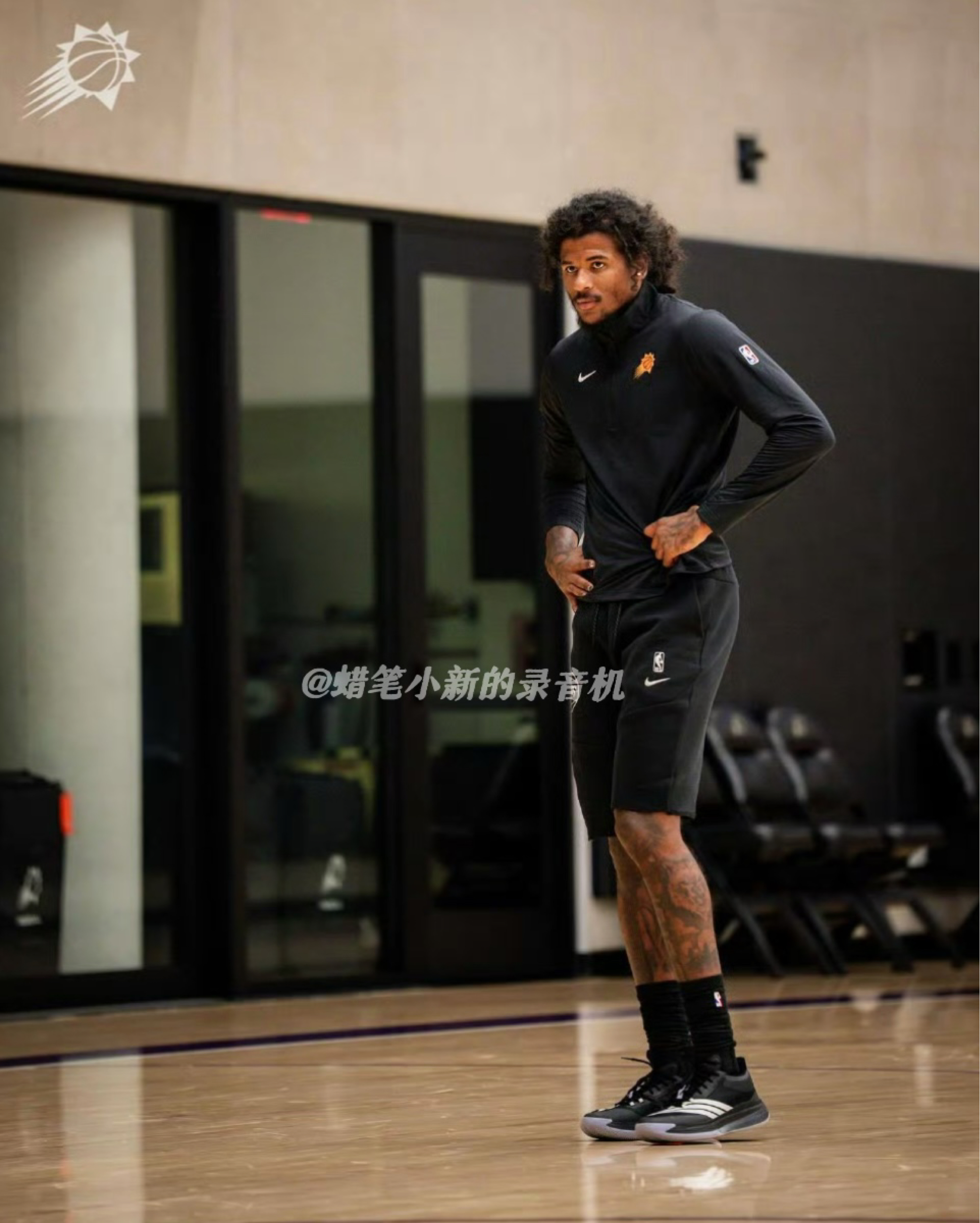 今日NBA球星资讯!NBA新赛季不到半个月就开打了!新赛季被火箭交易到太阳的潜力新星杰伦格林也火急火燎开启了最后的训练冲刺!近日,他身穿太阳训练黑色长袖,搭配NBA联盟Nike训练裤,上脚阿迪达斯Select3.0黑色球鞋,亮相球馆训练!一身黑色的球场搭配,似乎也预示着他新赛季要证明自己实力的决心!