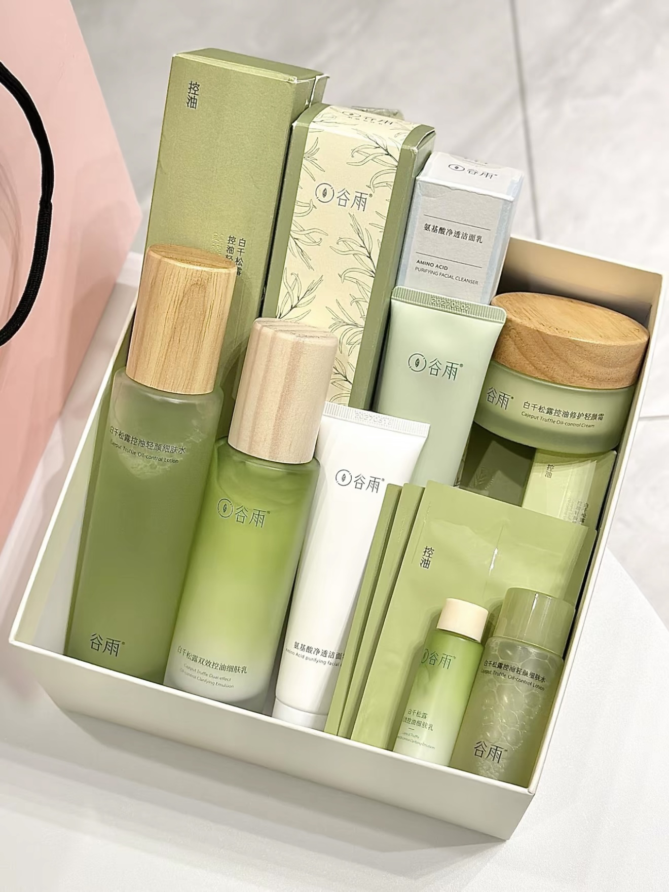 该说不说 谷雨的介个白千松露礼盒真的有两把刷子 打开之后满满一大盒:水、乳、洁面、泥膜、面膜和水乳小样 水是水粉分离的质地 需要摇匀后在上脸 水乳都是偏清爽挂的 上脸之后不闷脸 霜的质地轻盈好推开 氨基酸洁面清洁力在线 同时又不会拔干 本油皮每天坚持使用下来皮肤清爽了不少~ 以后再也不用吸油纸了!
