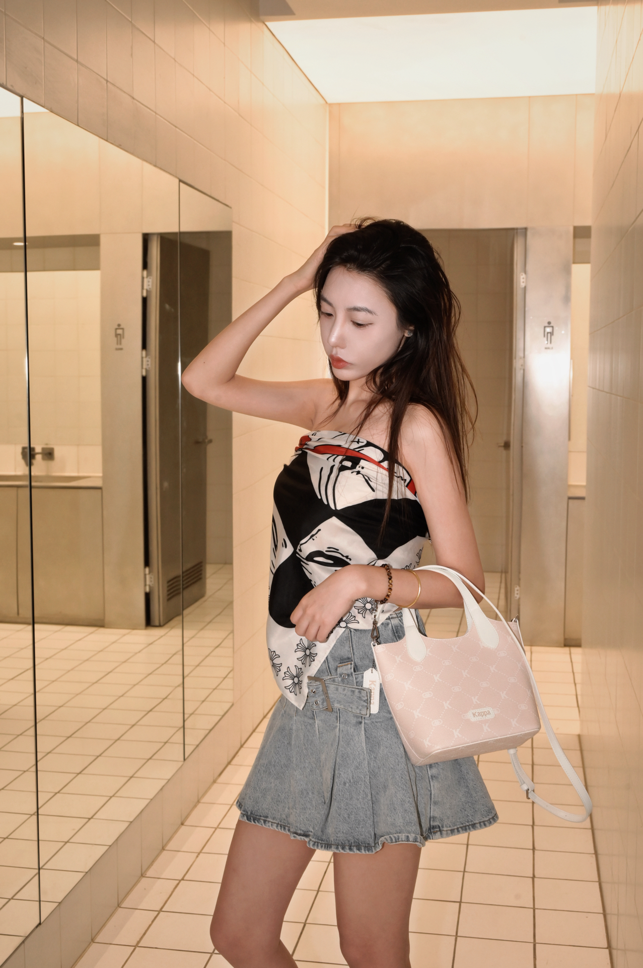 不要冷白皮 只要黑皮辣妹! 夏日末尾当然要抓紧时间再辣一下 据说这是杭州最漂亮的WC!!! 长长的走廊和干净的镜子 谁能想到这是个卫生间🚻 今天点辣妹穿搭叫我超酷! 上衣穿了一个克罗心的抹胸~ 这种大丝巾当你抹胸真的很好看也是我第一次尝试抹胸的这种穿法~ 搭配了一个牛仔短裙和一款超级帅的牛仔鞋子 奢牌的老花工艺 并且在国际时装周也走秀过! 徐后搭配了 #Kappa 的包包做点缀! 黑夏完美收尾...