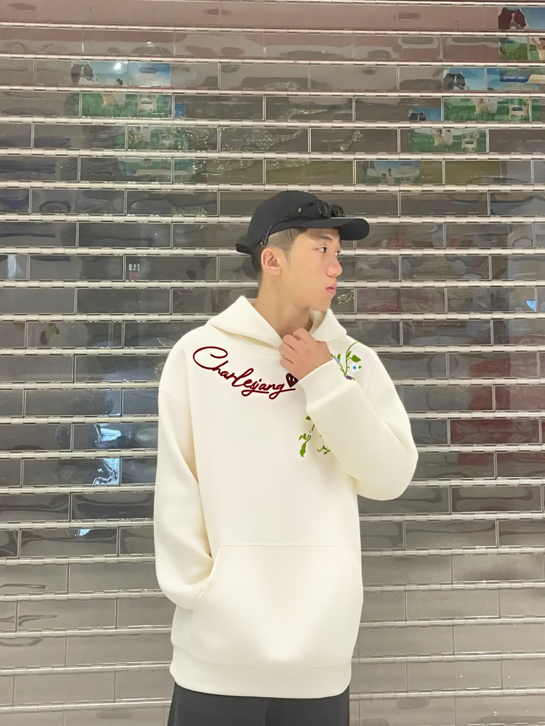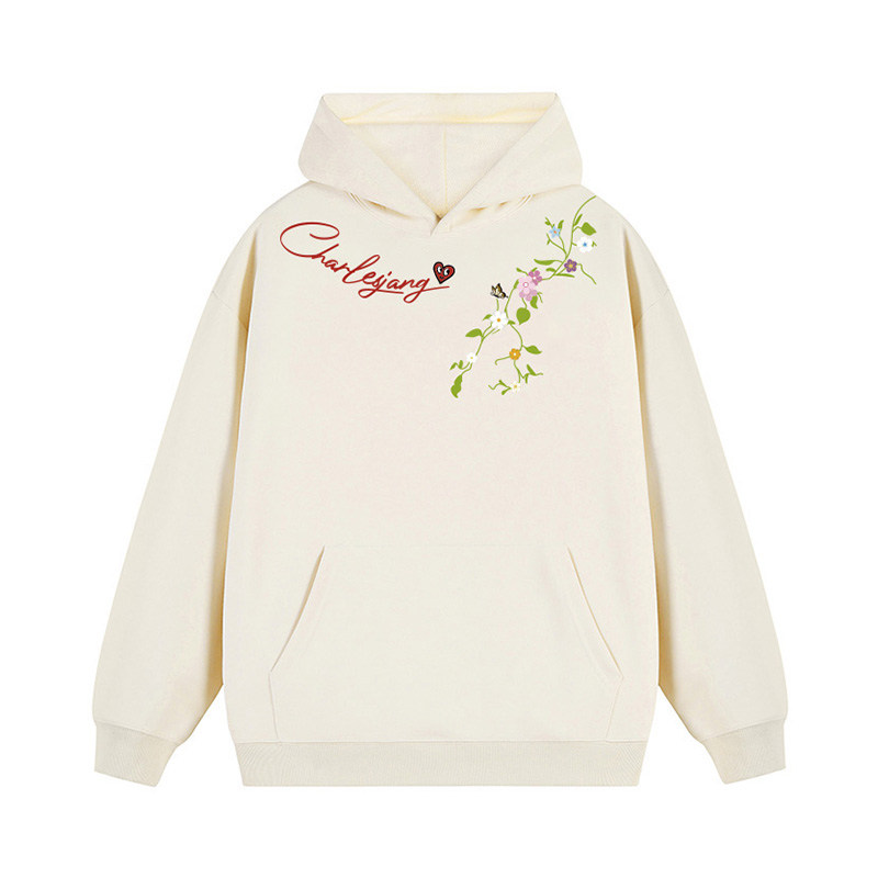 春日去公园、野餐怎么穿?这件查尔斯桃心连帽套头卫衣太合适了!浅薄荷绿花卉像刚冒芽的青草,在衣服活灵活现的~