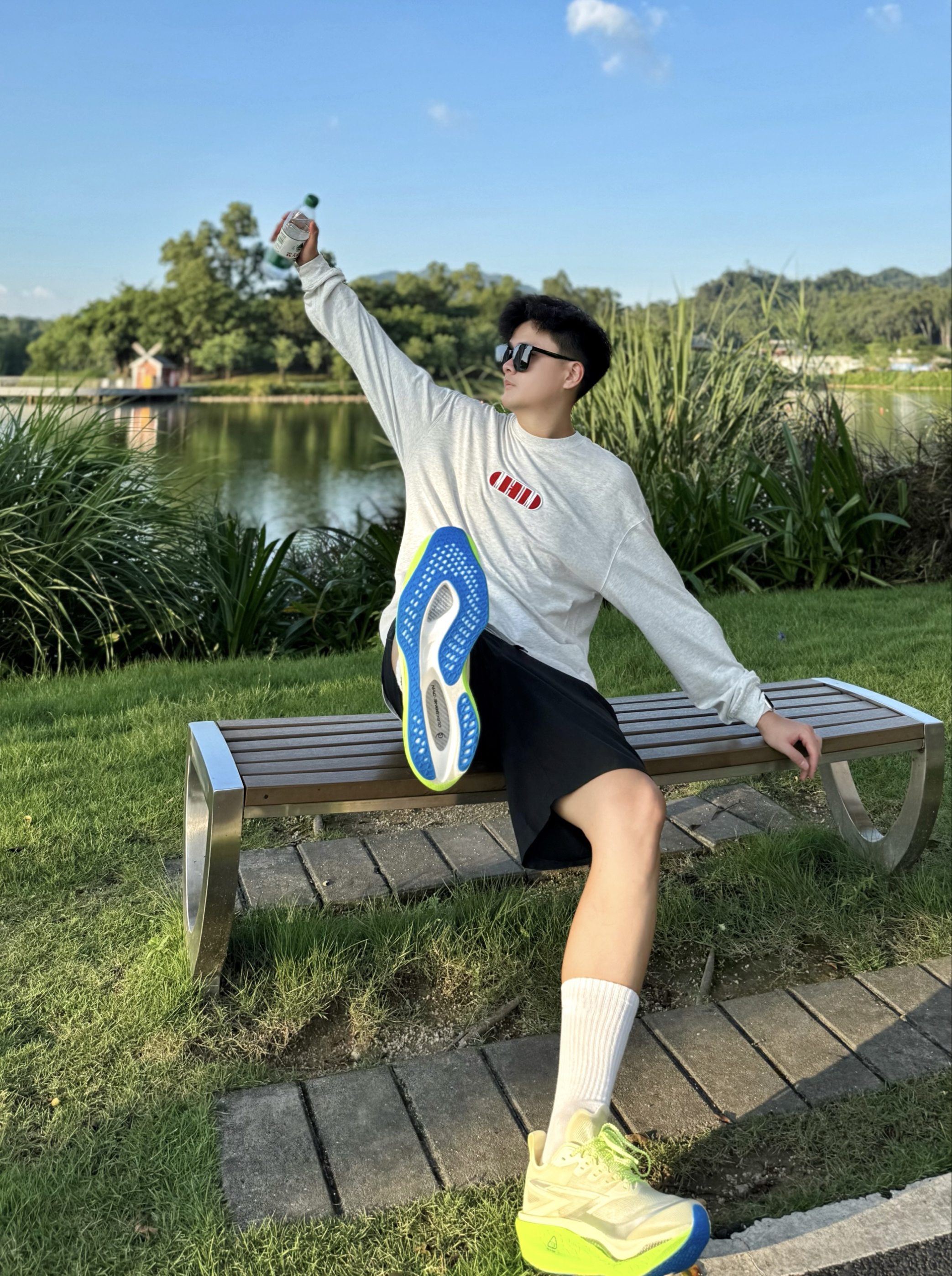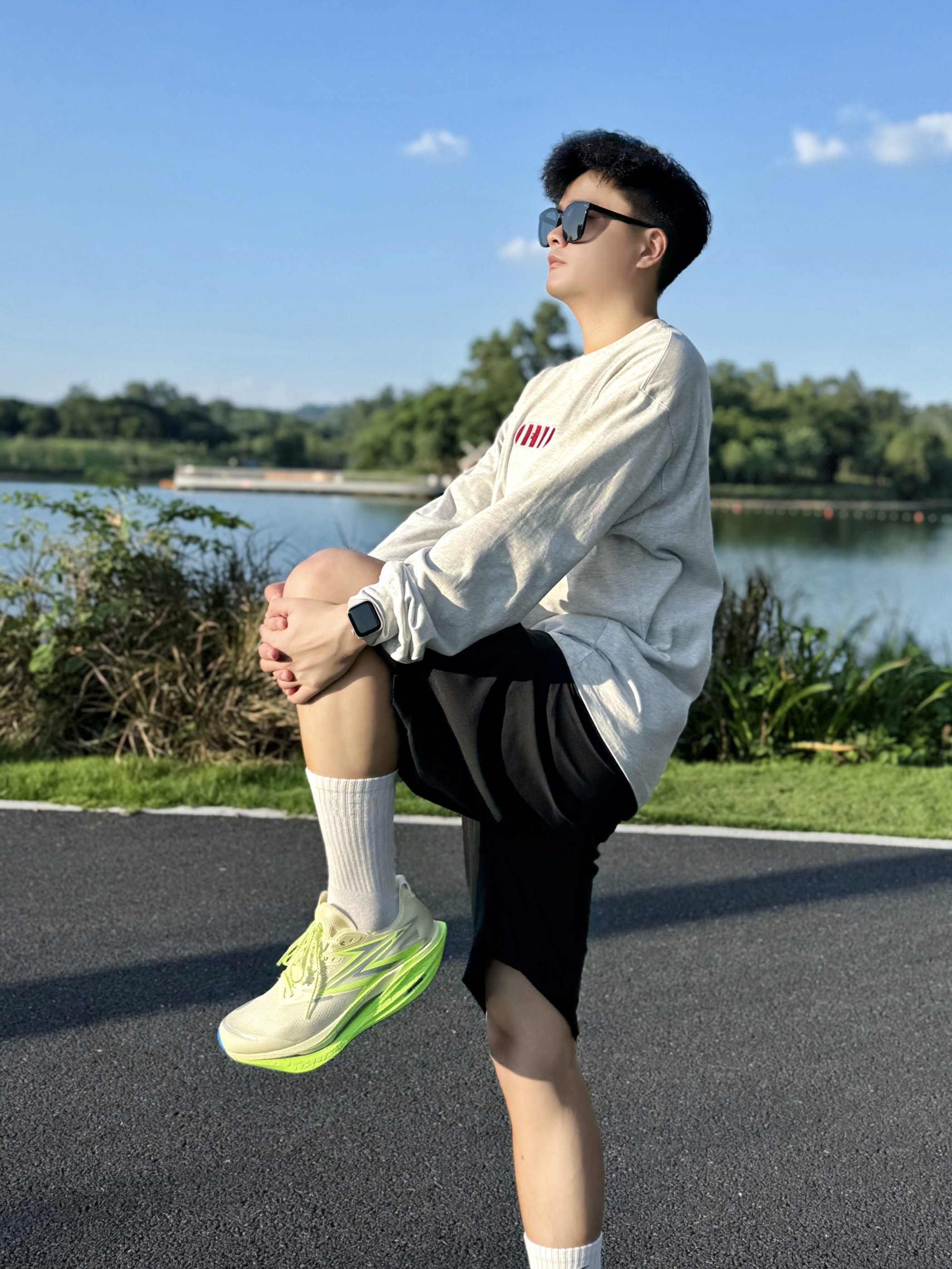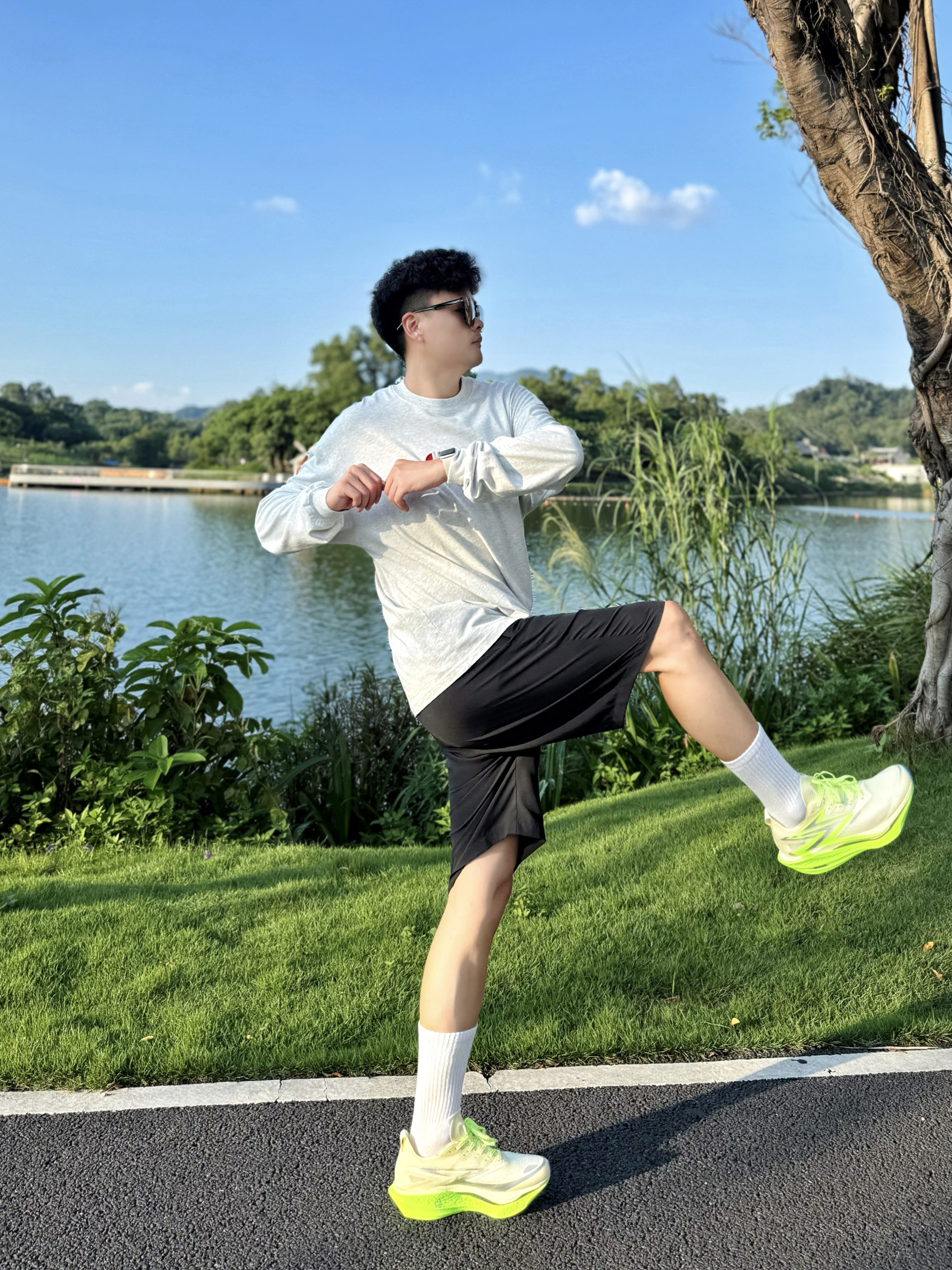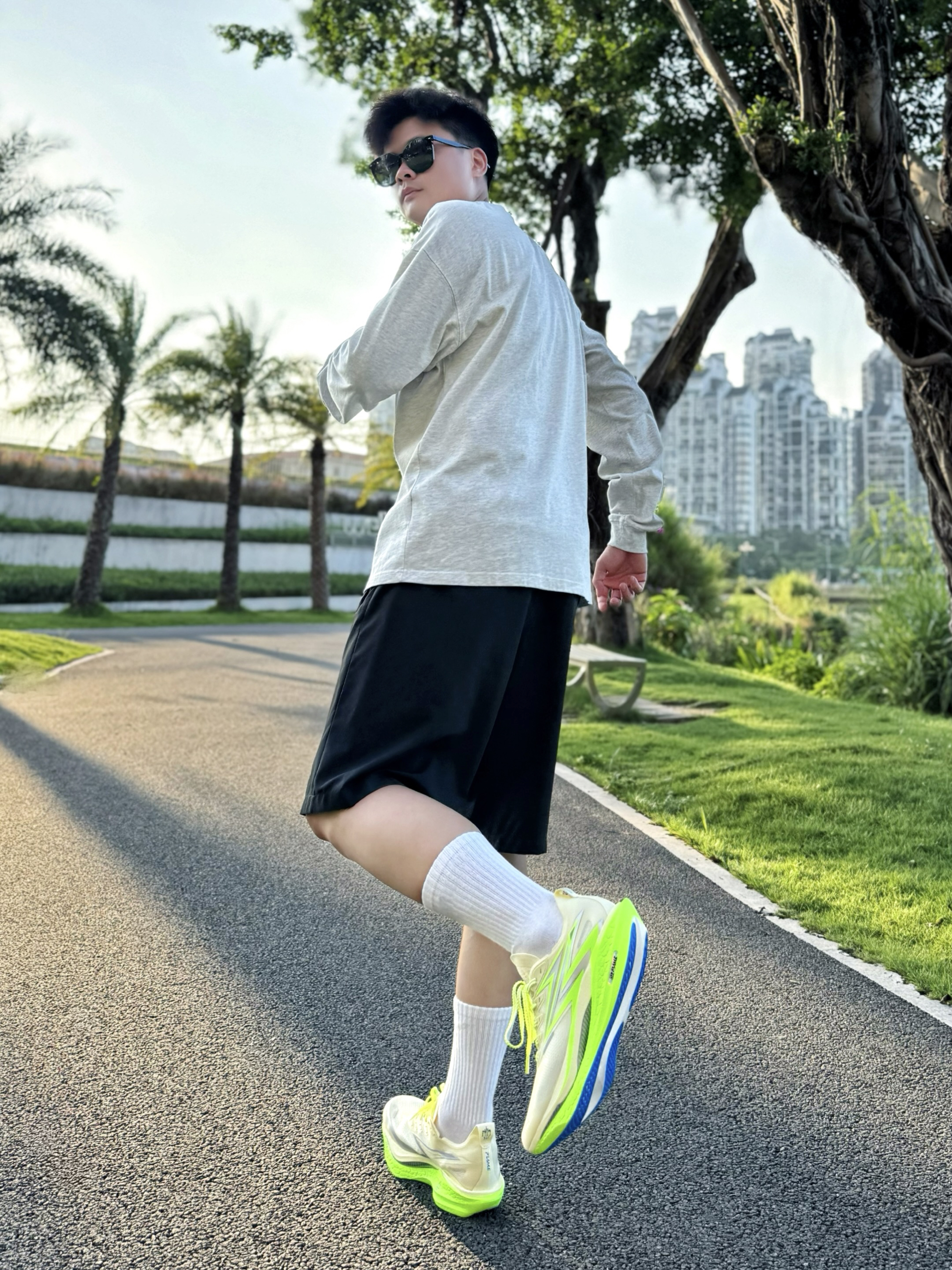 阳光正好,阿b仔来公园跑跑步🏃🏻♂️ 随手拍拍,分享我的运动穿搭look.. 👔灰色长袖T恤+🩳黑色运动短裤 👟搭配361°飞燃4.5传奇之路配色跑鞋 运动风get,少年感hold住 跑起来脚感软弹弹嘟我爱了 我是44脚,穿的44码okk刚好