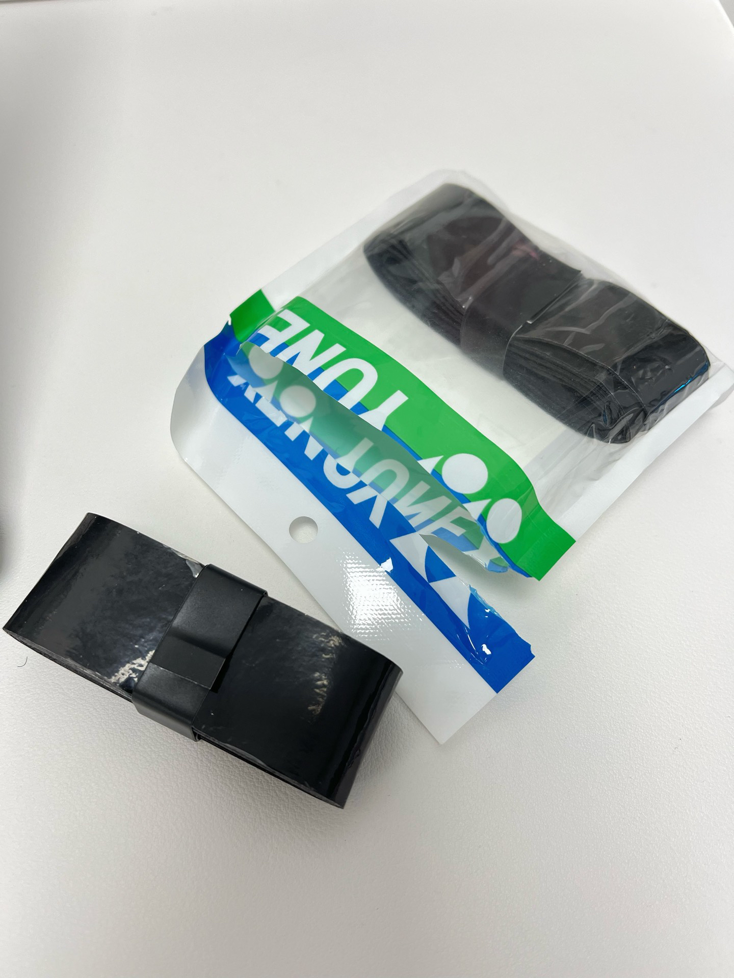我选了耐脏的黑色手胶(其实是买东西送的🤣)。撕了塑封膜,按步骤缠:大头对折对准球拍底盖缠一圈,拉紧;底盖四个方向折出正方形,接着往下拉紧缠。最后封口,完成后握感还不错~不过这是薰风专用缠法,我下次得找个薰风拍子再试试,看适配度咋样~