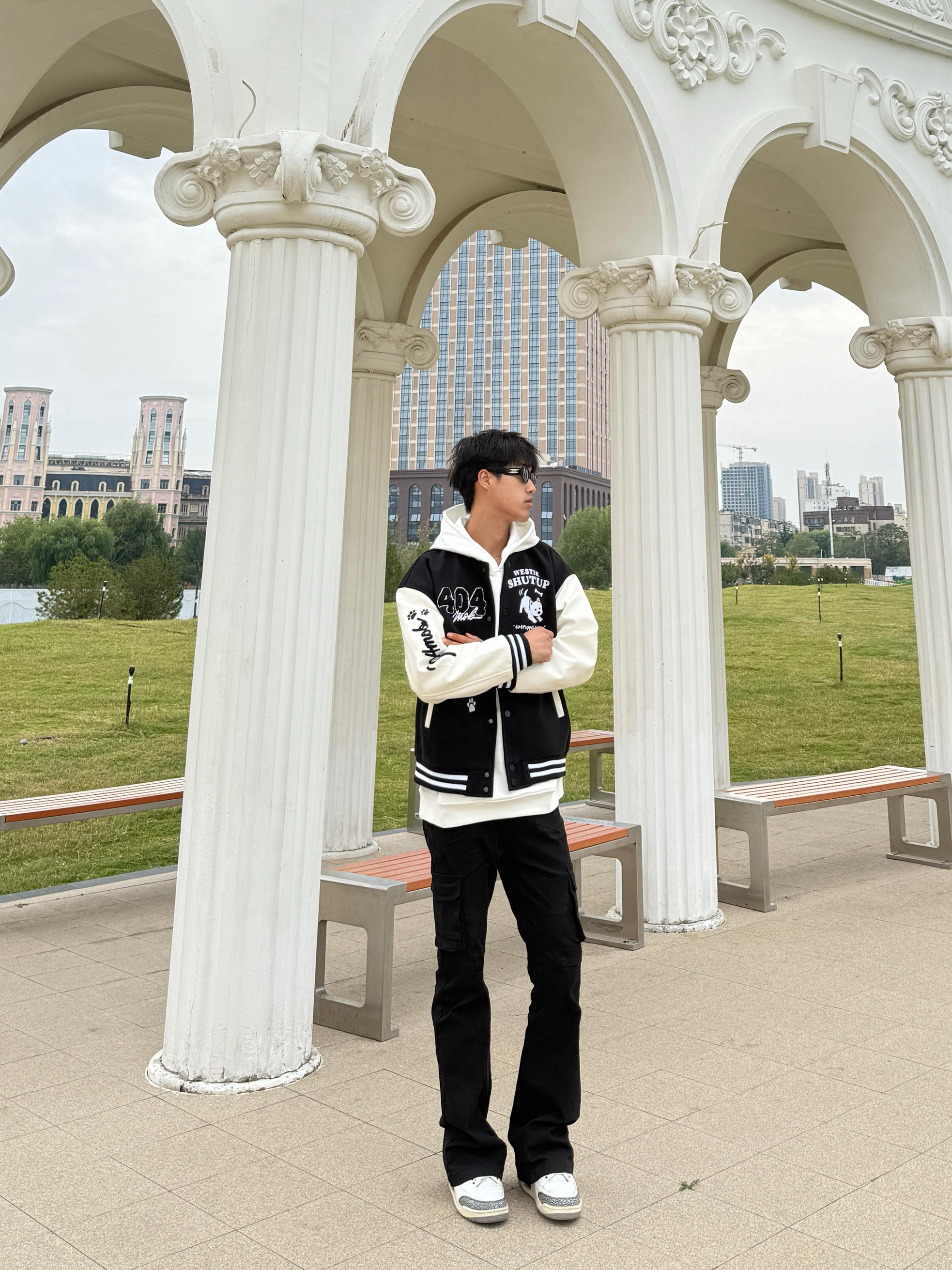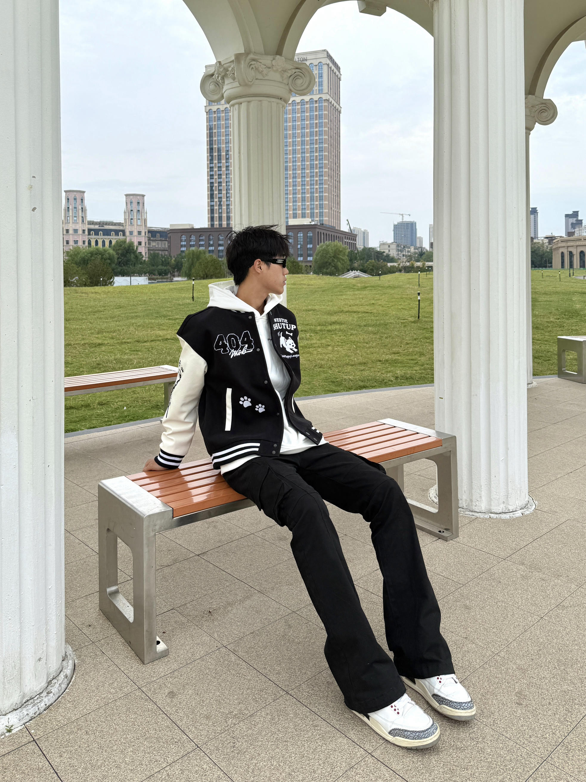 身高|体重:183/65 🧍♂️ 穿搭风格:校园男大风 👔 上衣:是一件黑白色刺绣夹克 👖 下装是一条黑色微喇牛仔裤 👟 鞋子:白水泥aj3