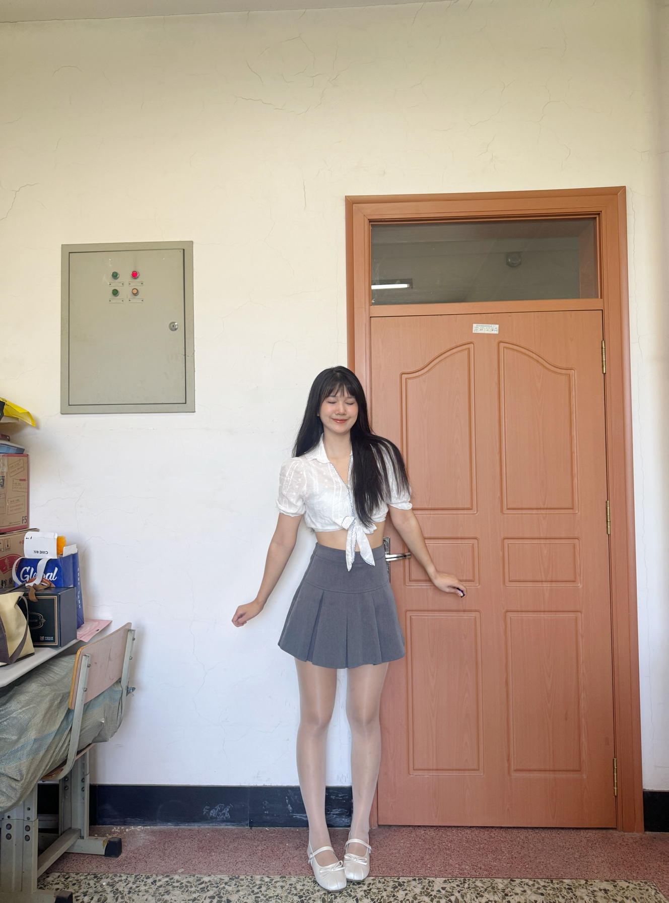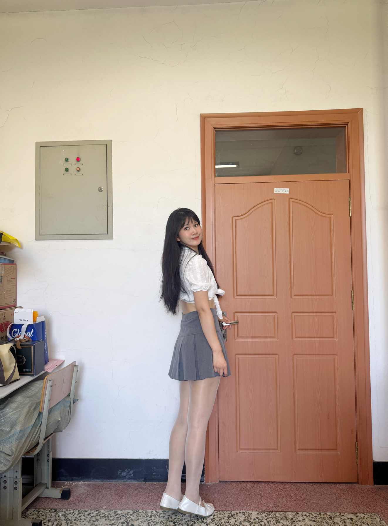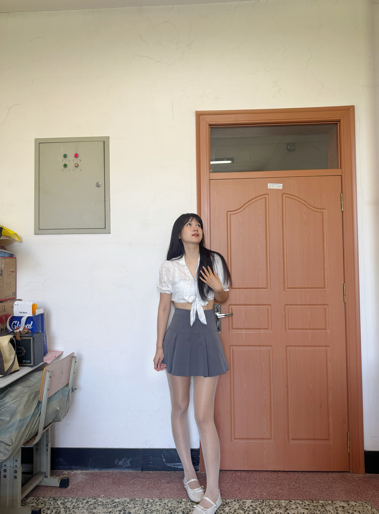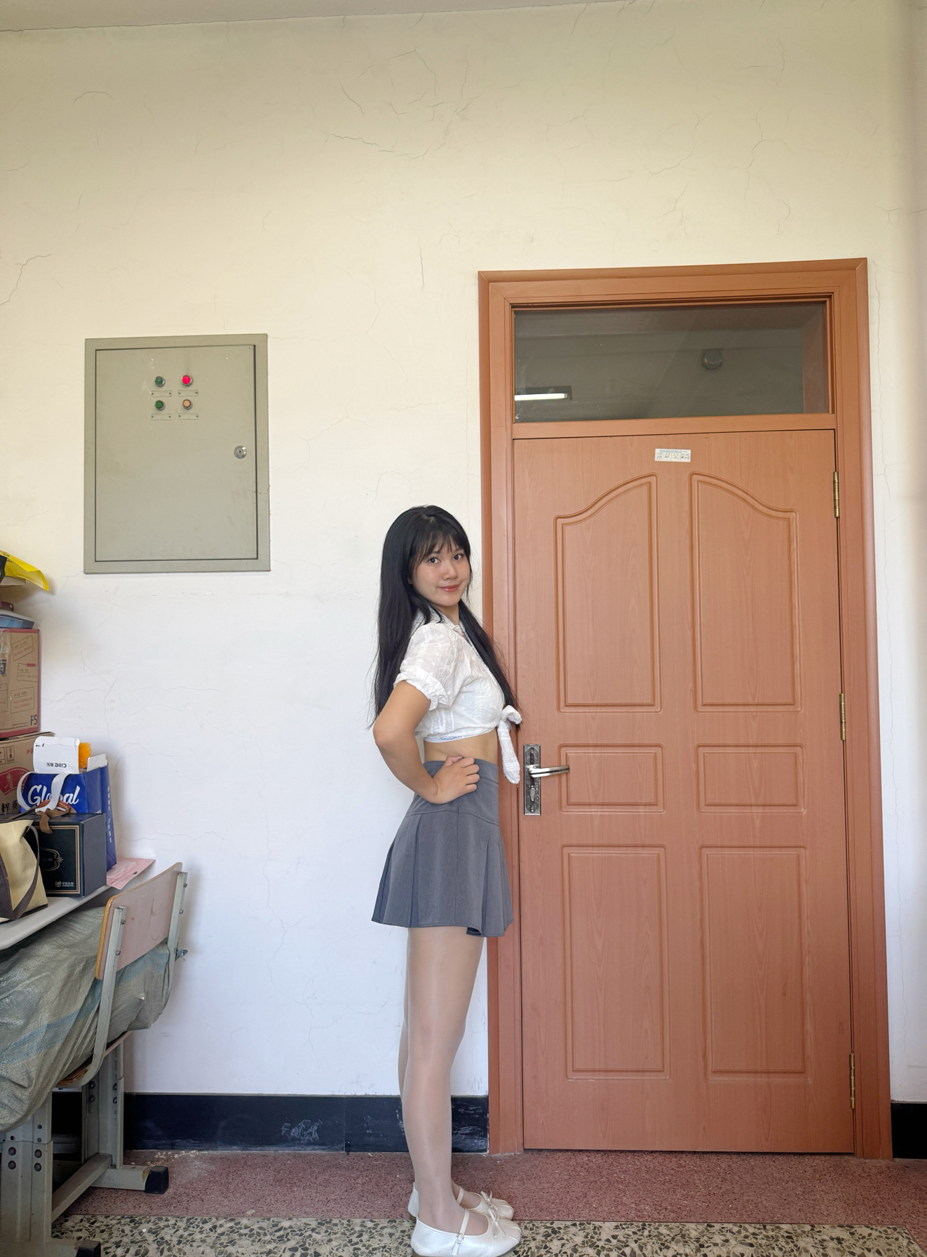 白色小上衣搭配灰色短裙👗 出去citywalk还是要多变一点了啦~ 身高体重:170cm 59kg L码