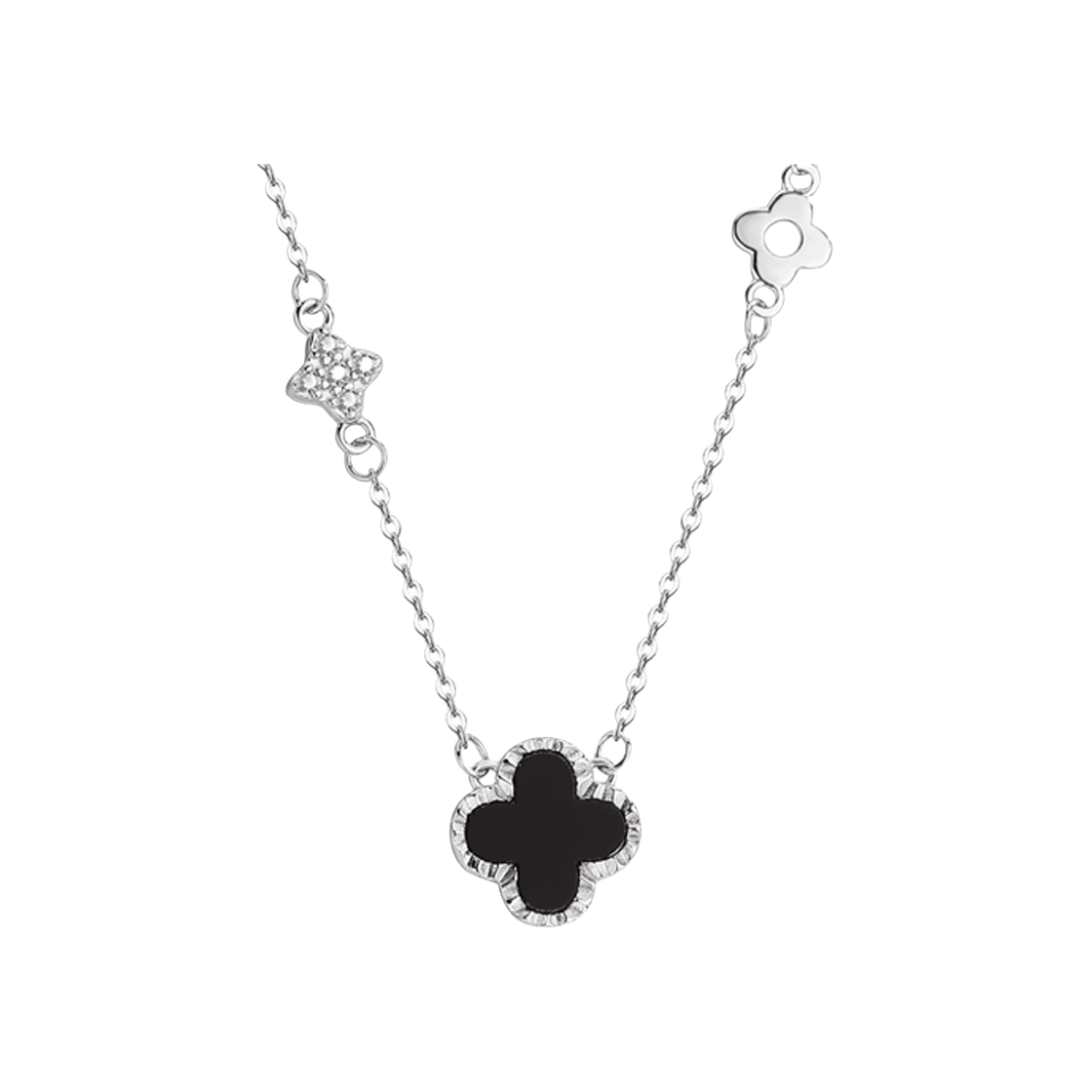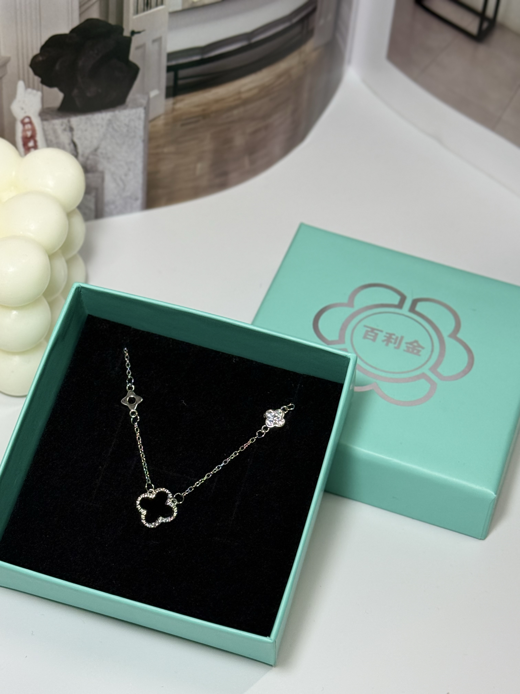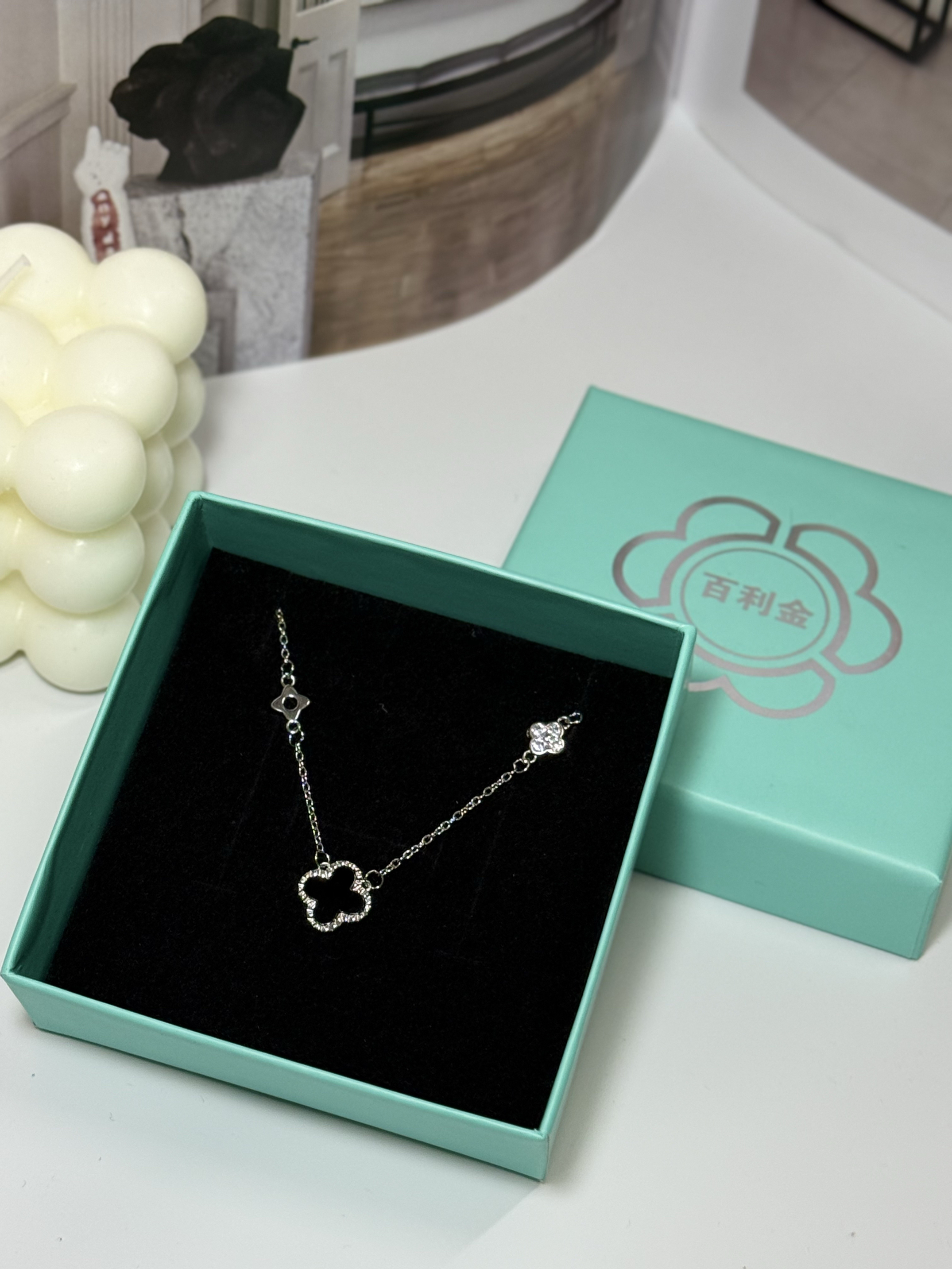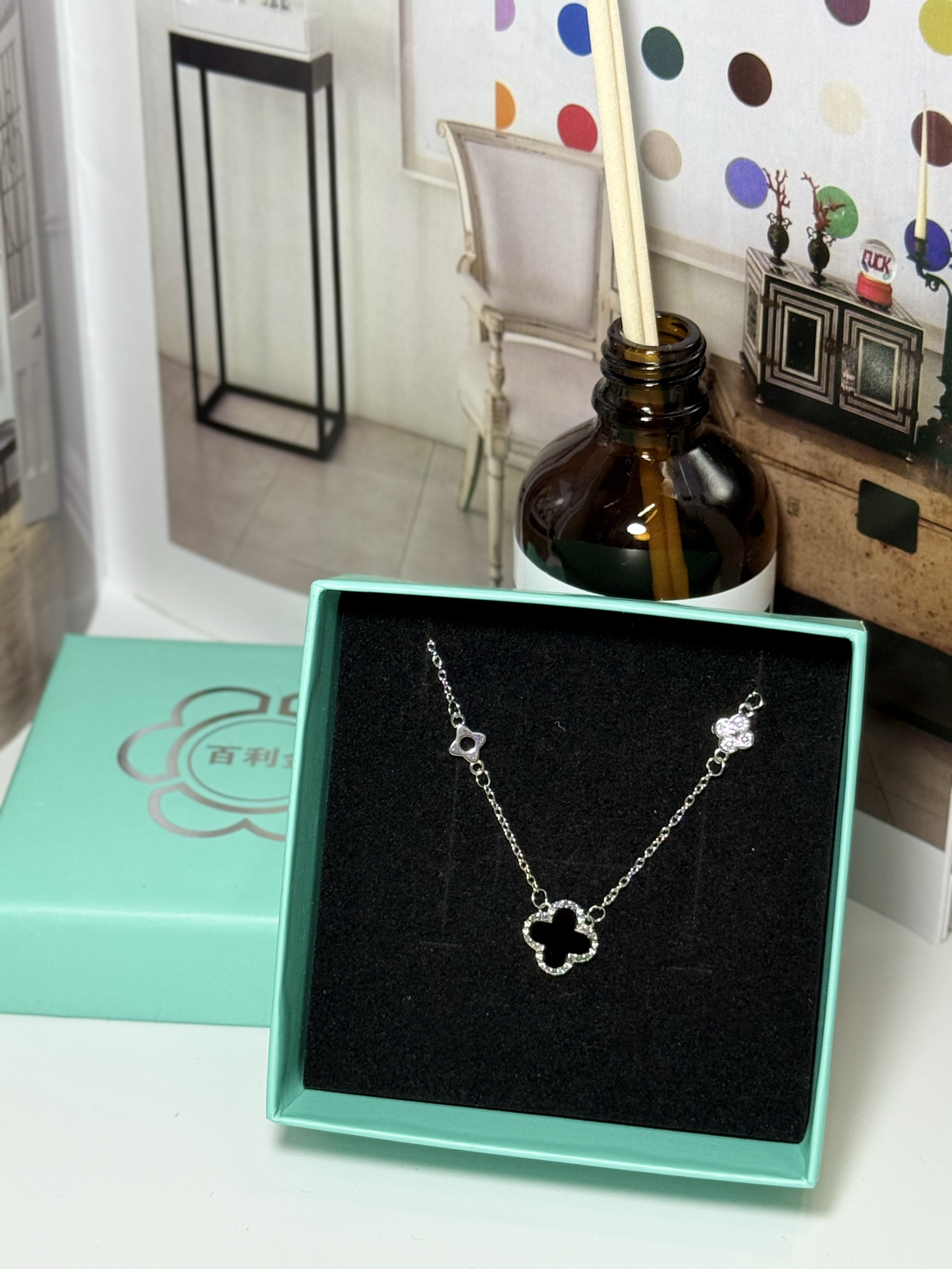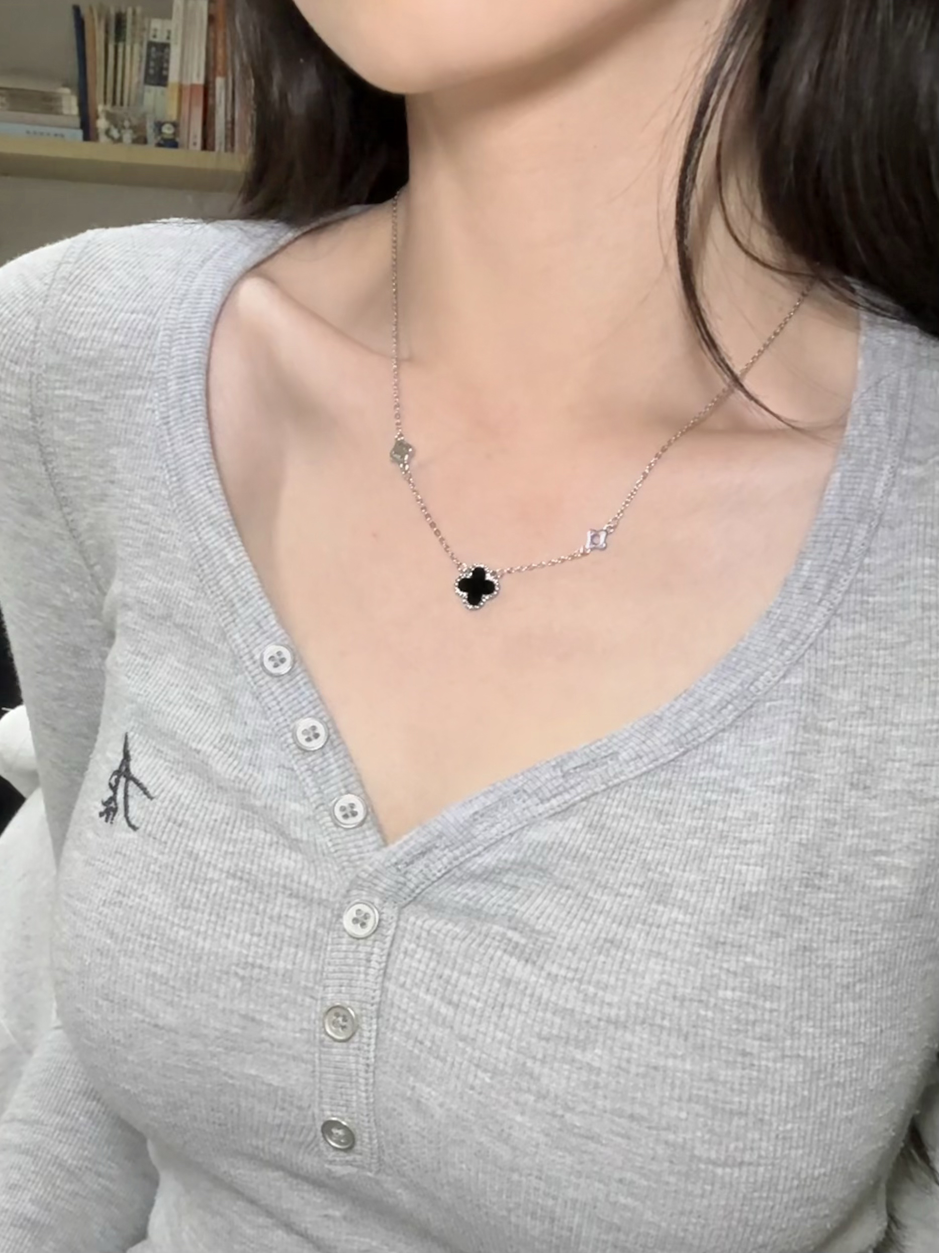 家人们,一定要来看看我最近挖到的宝藏项链——百利金BEJEWEL的四叶草项链! 它是银质的链条,质感超细腻,亲肤又不会过敏。四叶草吊坠主体是深邃的黑色,周围镶嵌了一圈闪亮的小钻,黑与银的配色,高级又神秘,简约中透着精致感。 戴在脖子上,长度刚刚好,完美地修饰了颈部线条,让锁骨更加迷人。搭配这种简约的灰色v领针织衫,瞬间就提升了整体穿搭的精致度,日常通勤或者出门约会戴着都超合适,每次照镜子都被自己美...